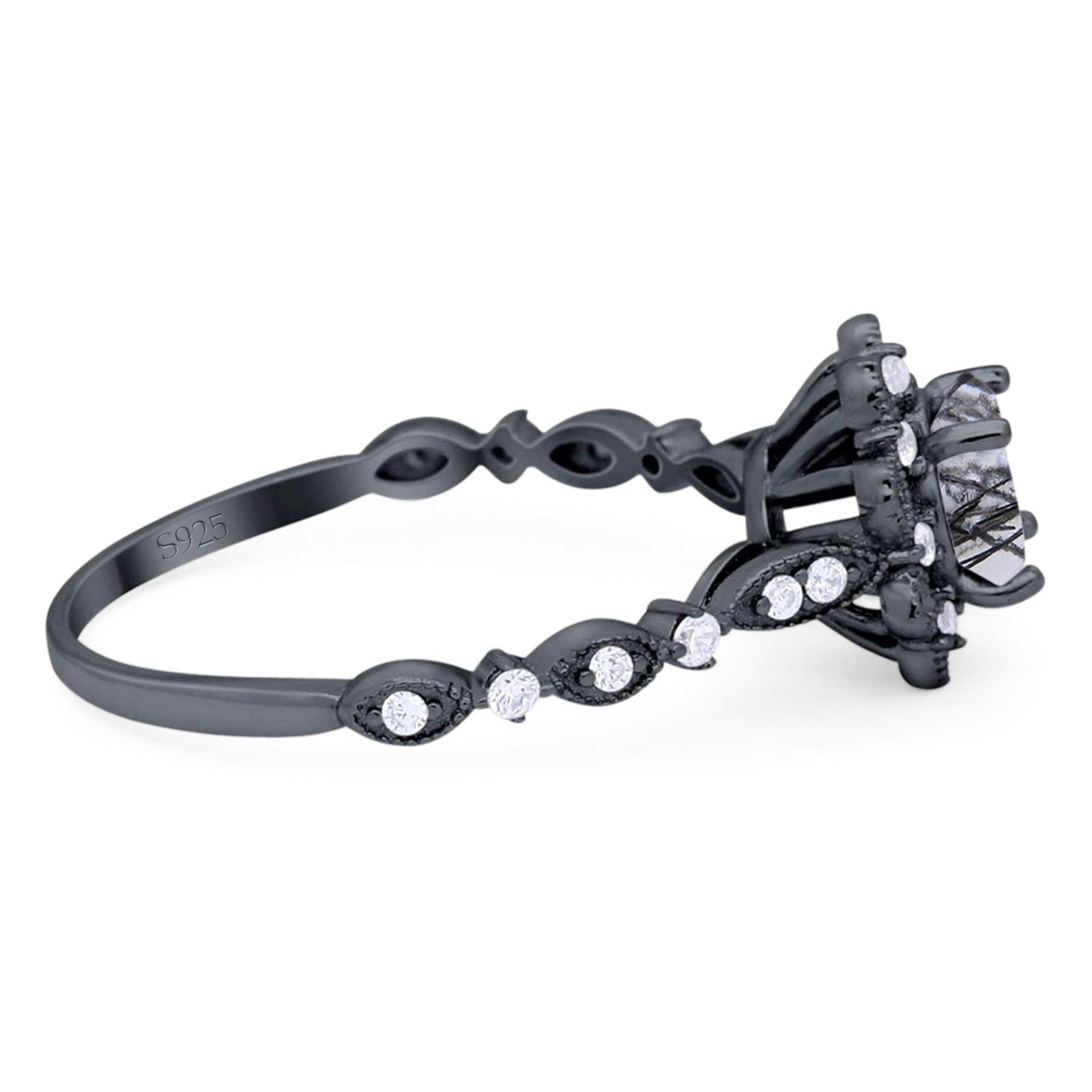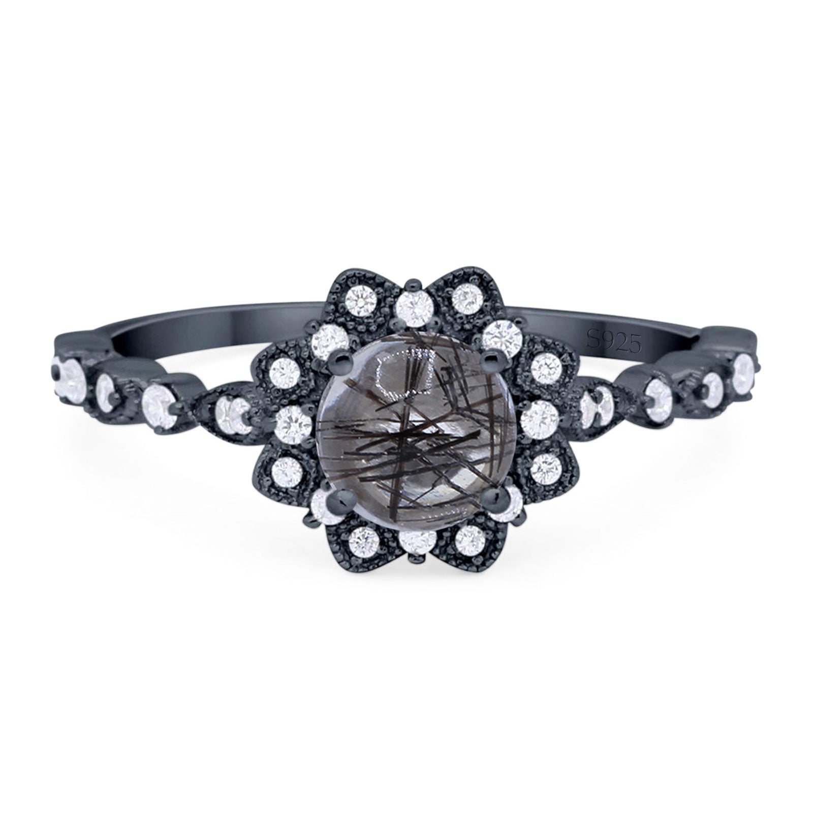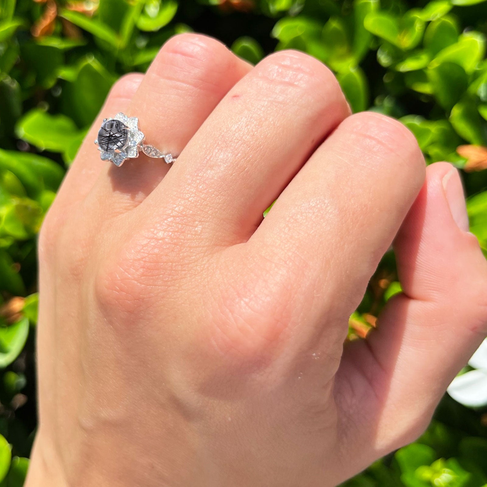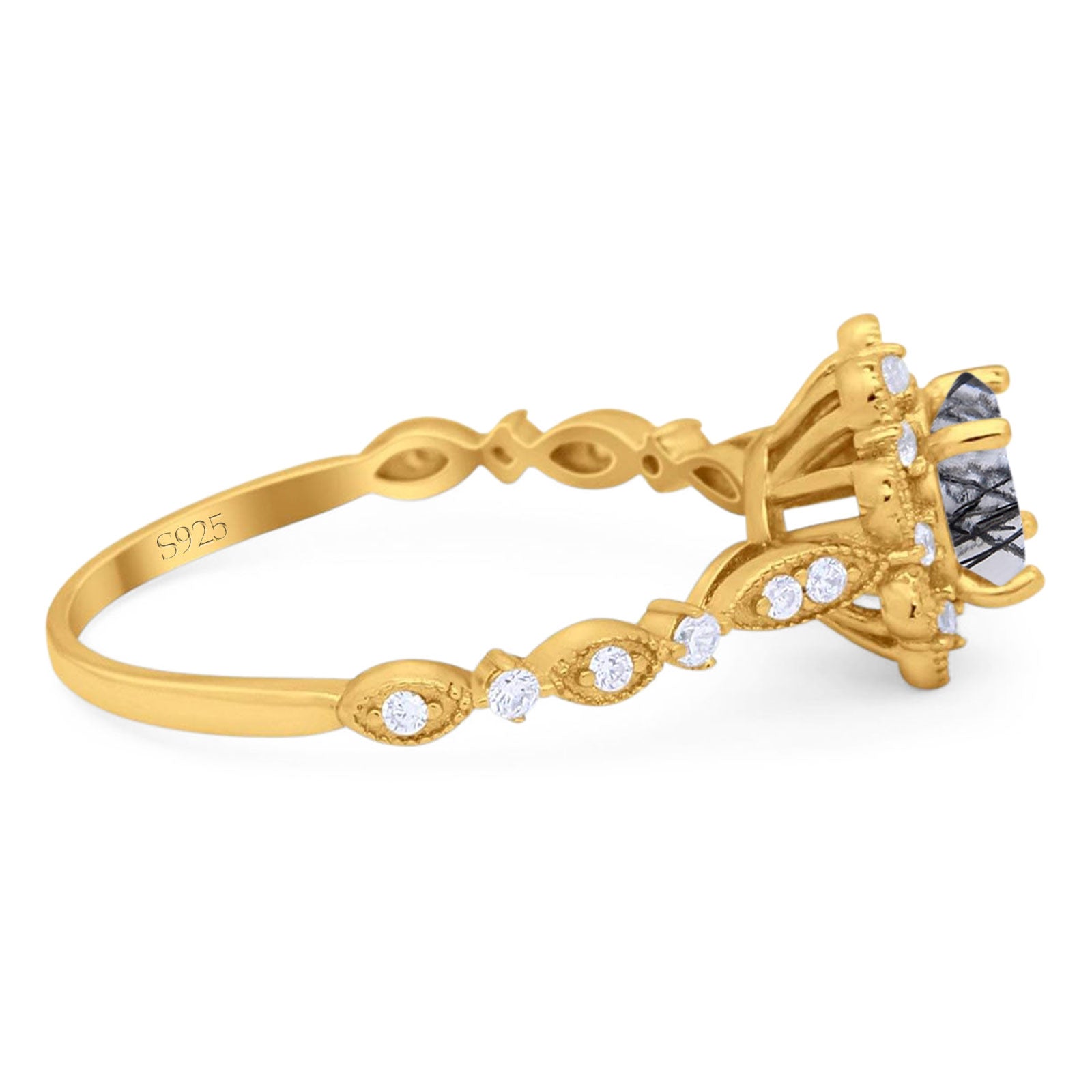 Art Deco Round Natural Rutilated Quartz Flower Ring 925 Sterling Silver