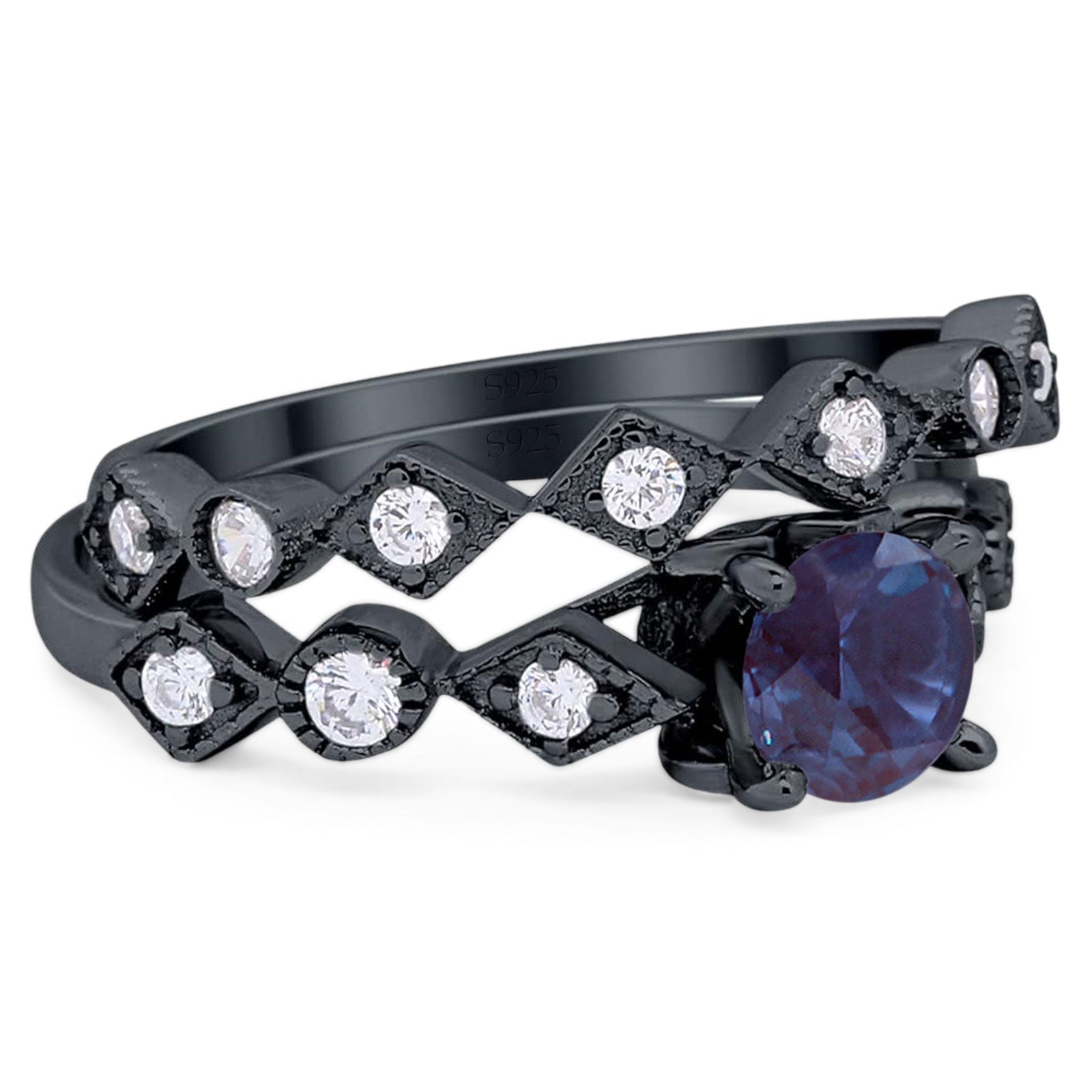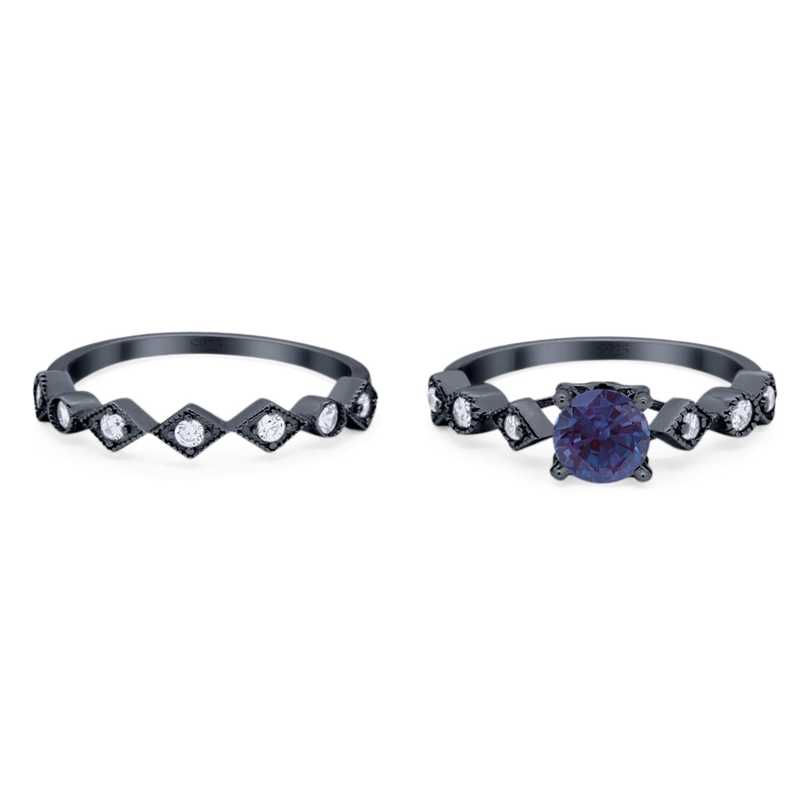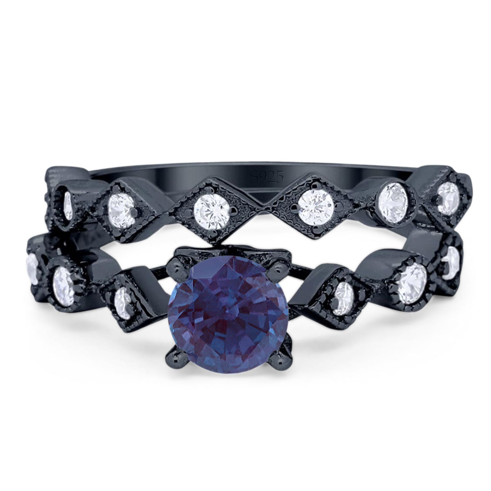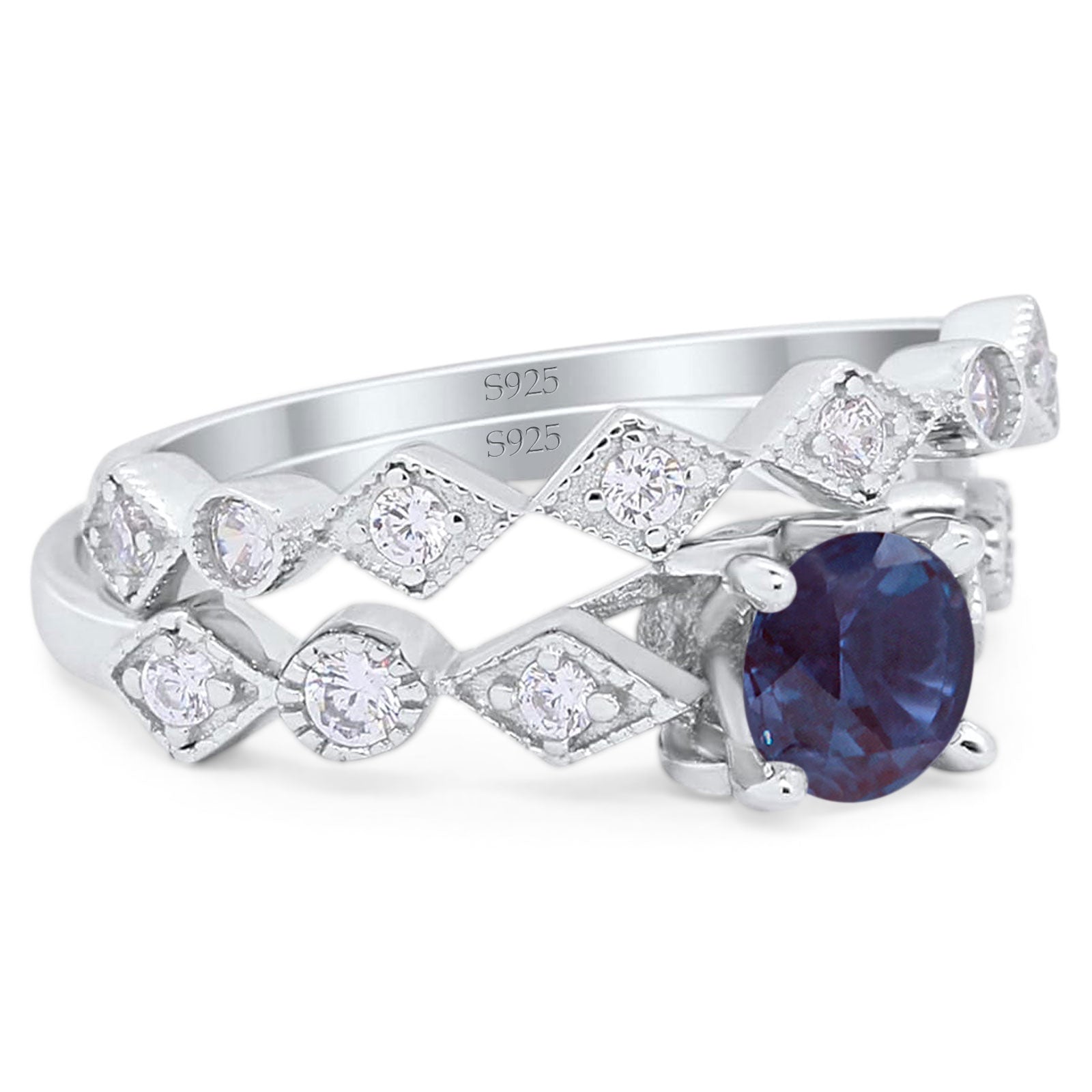 Art Deco Two Piece Round Lab Alexandrite Wedding Set Ring 925 Sterling Silver