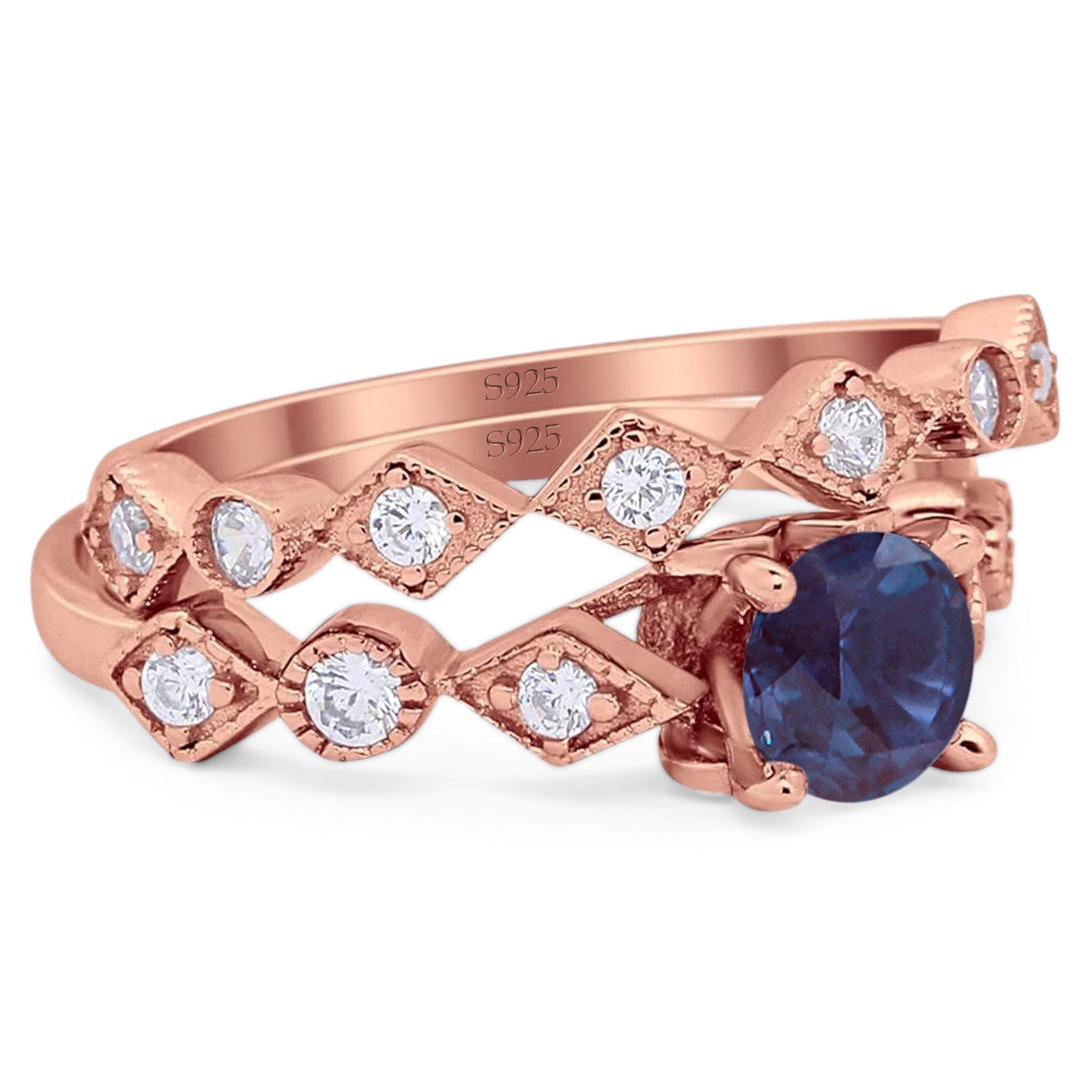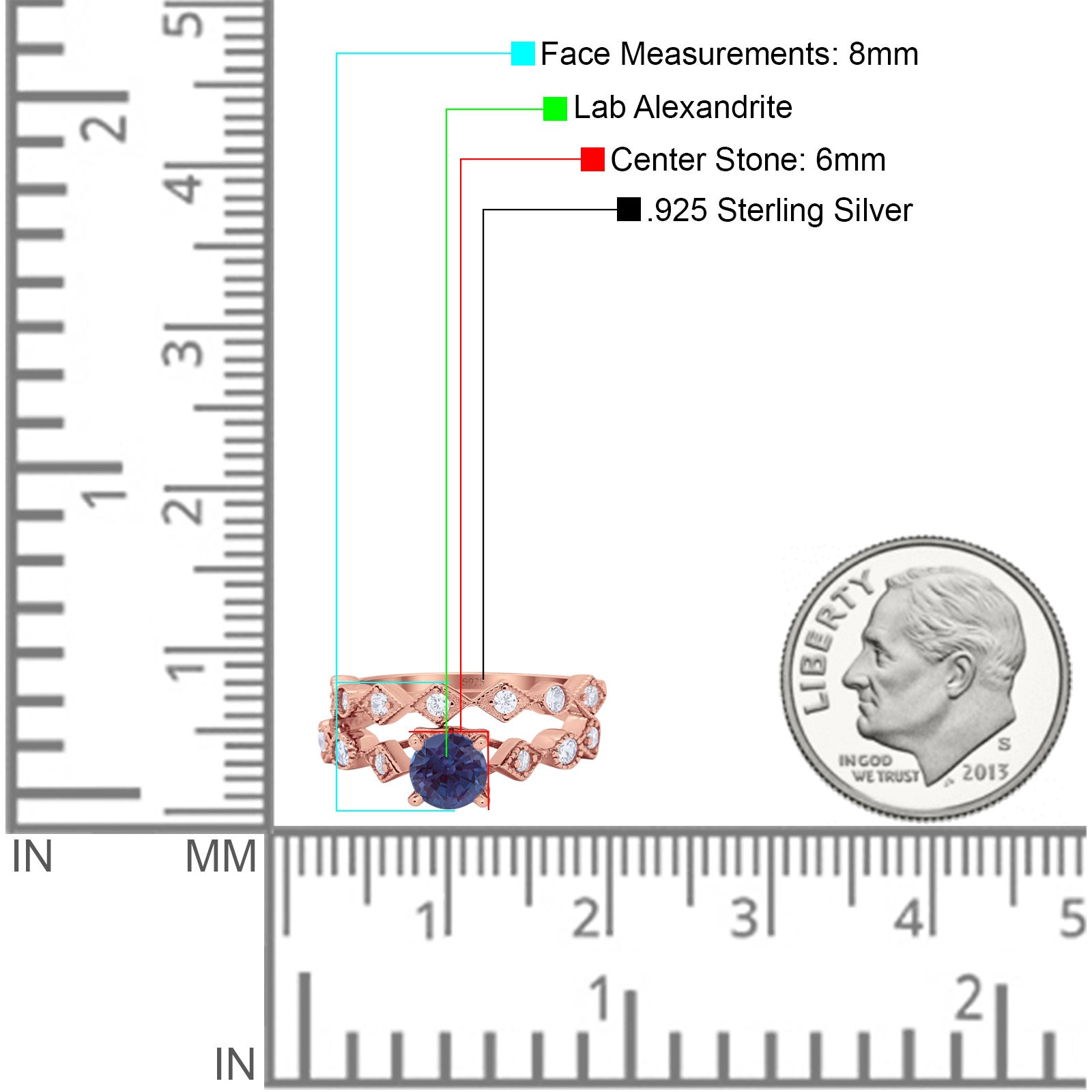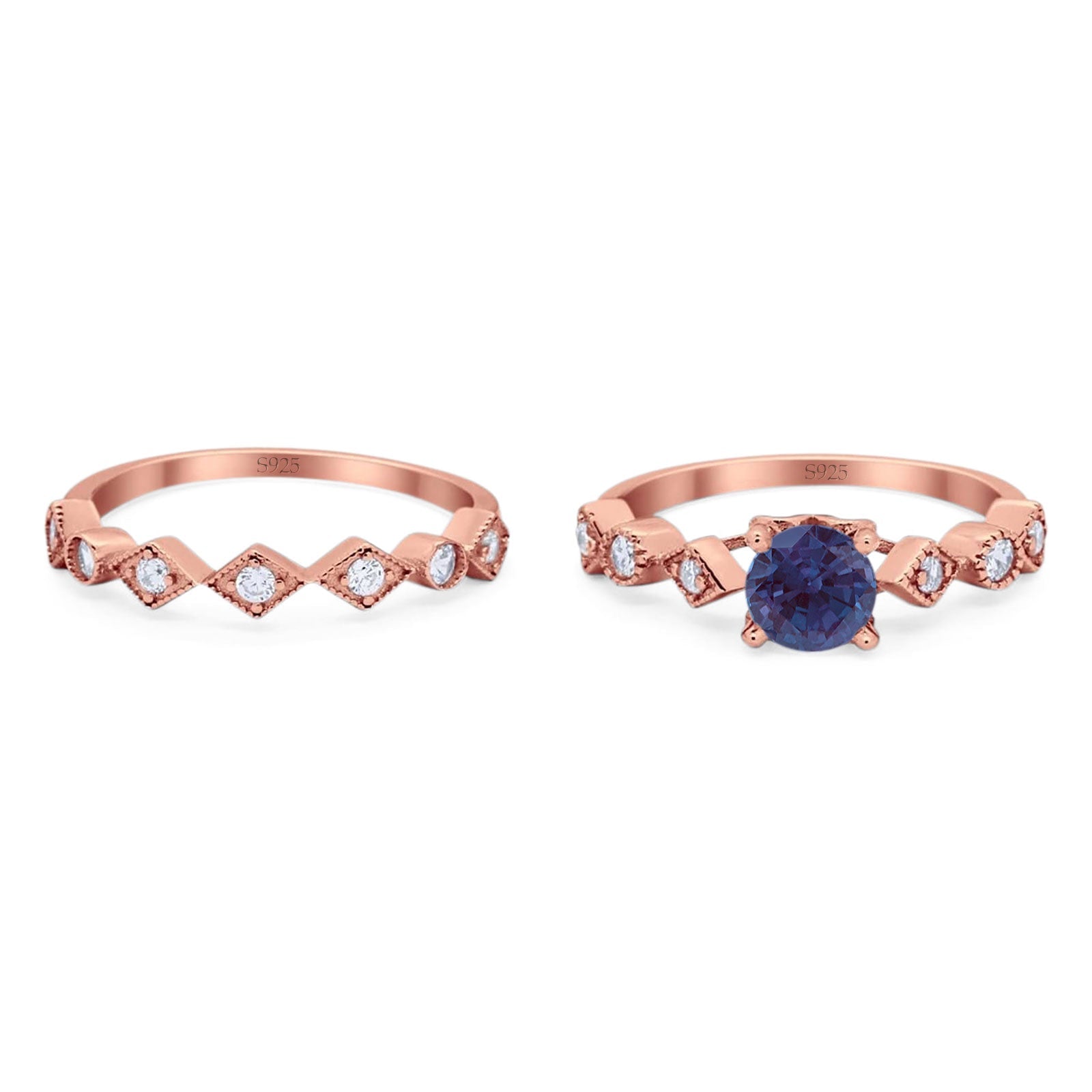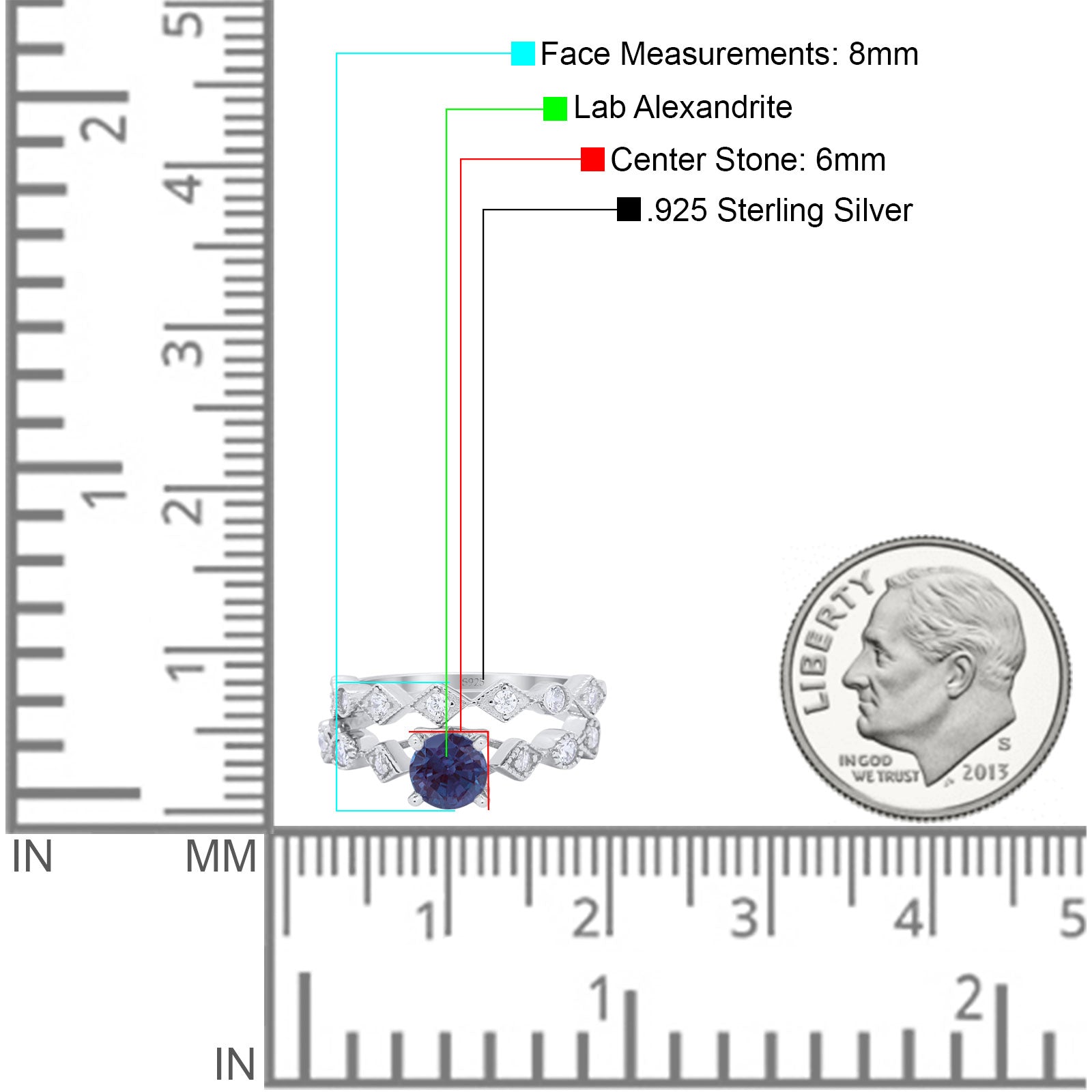 Art Deco Two Piece Round Lab Alexandrite Wedding Set Ring 925 Sterling Silver