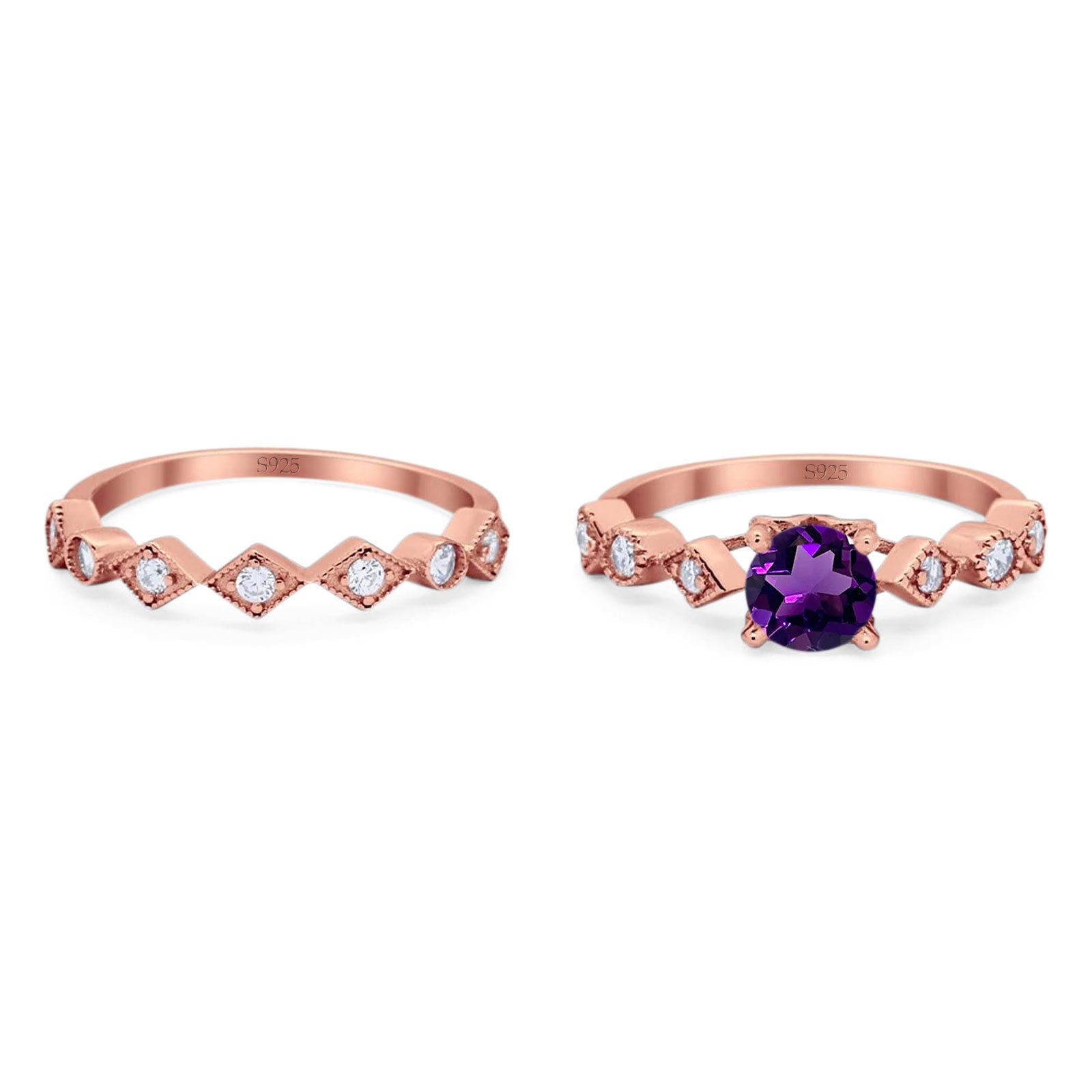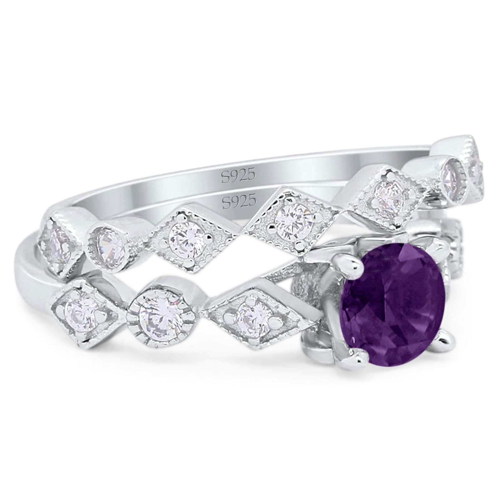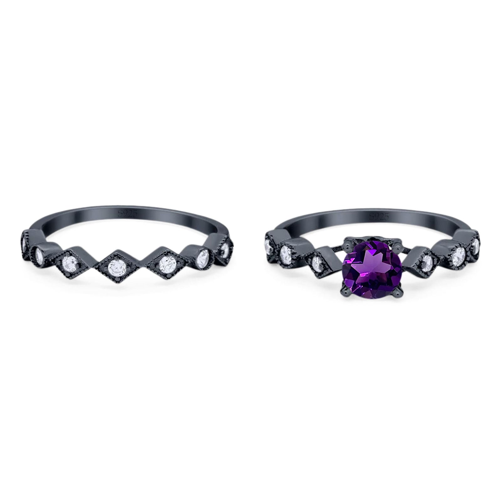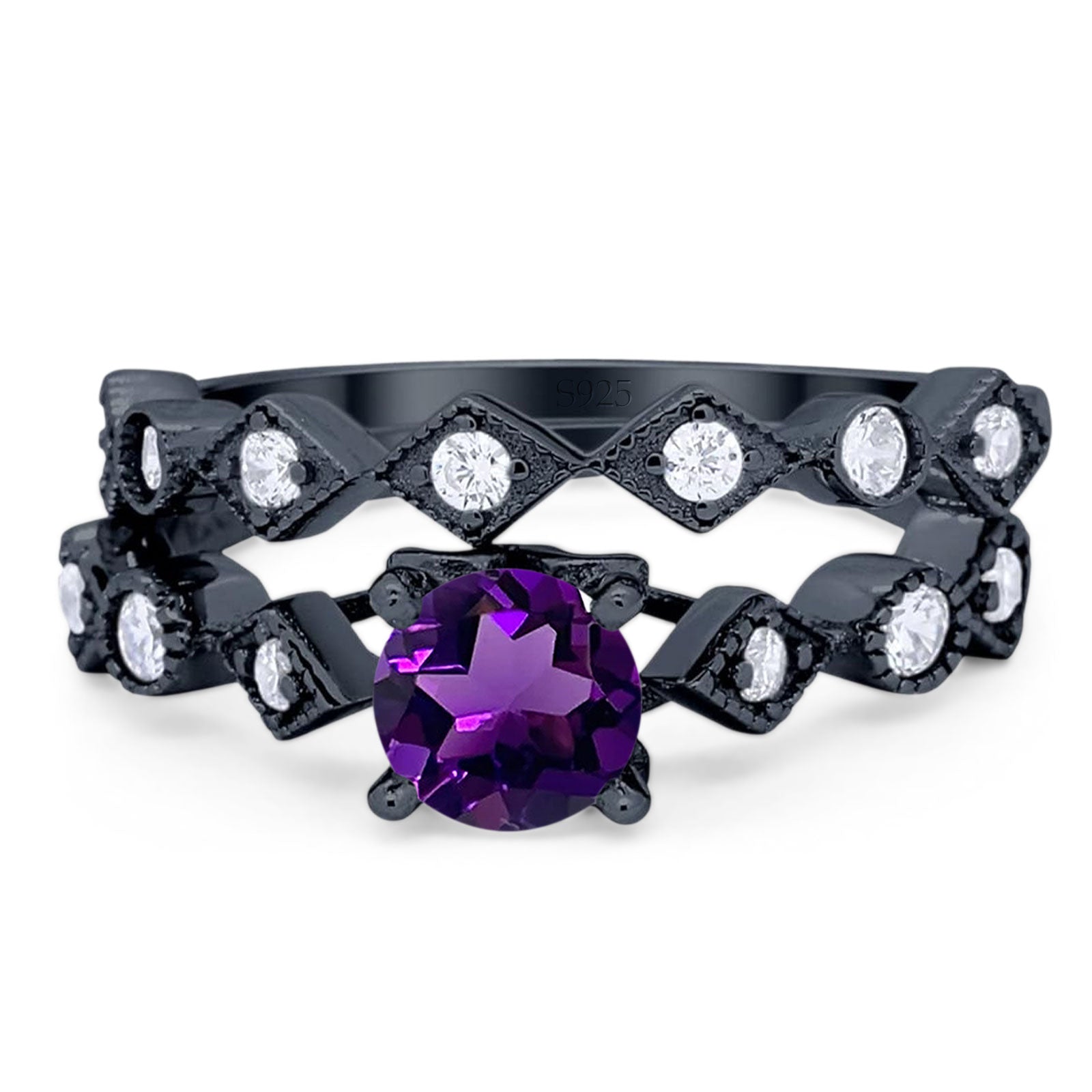 Art Deco Two Piece Round Natural Amethyst Wedding Set Ring 925 Sterling Silver