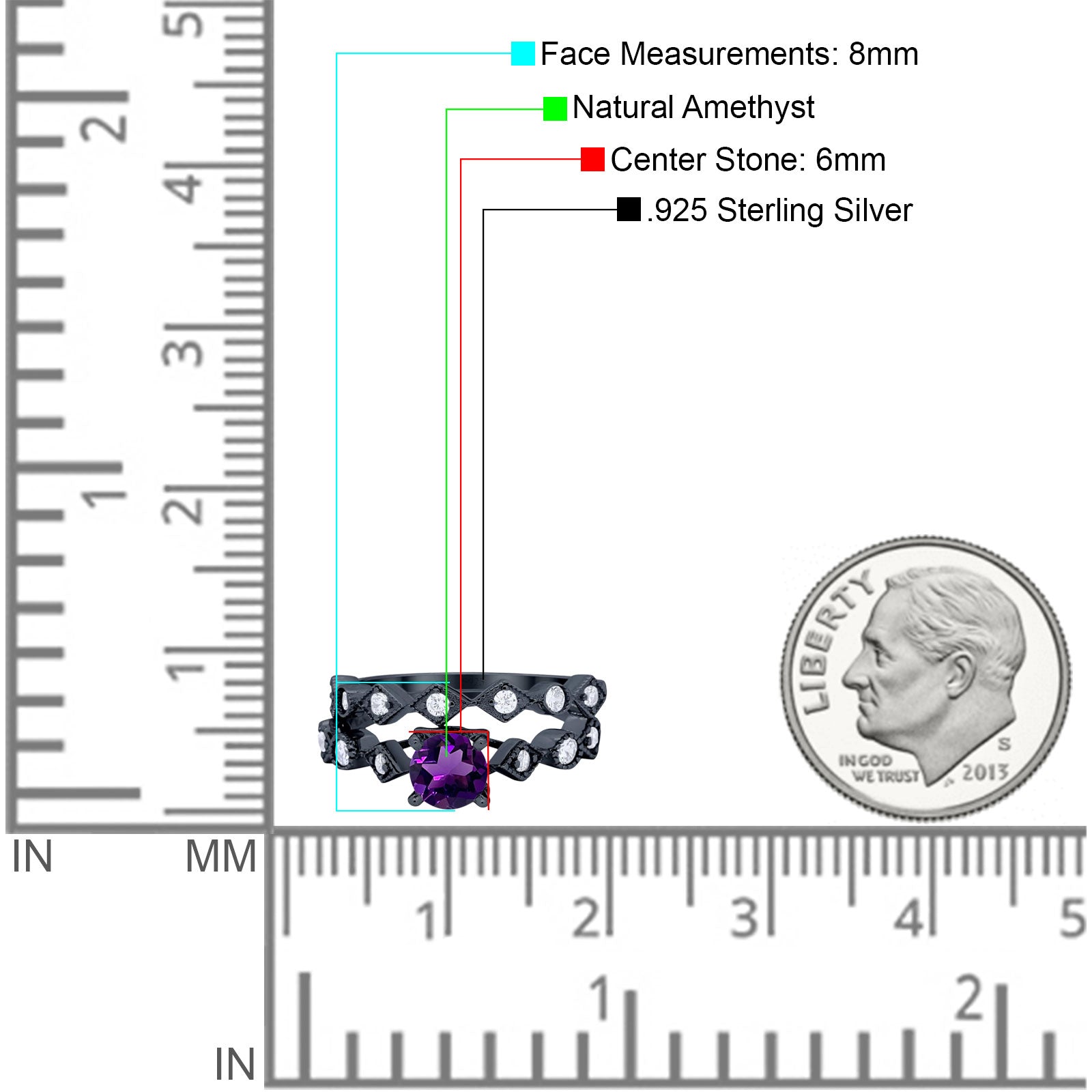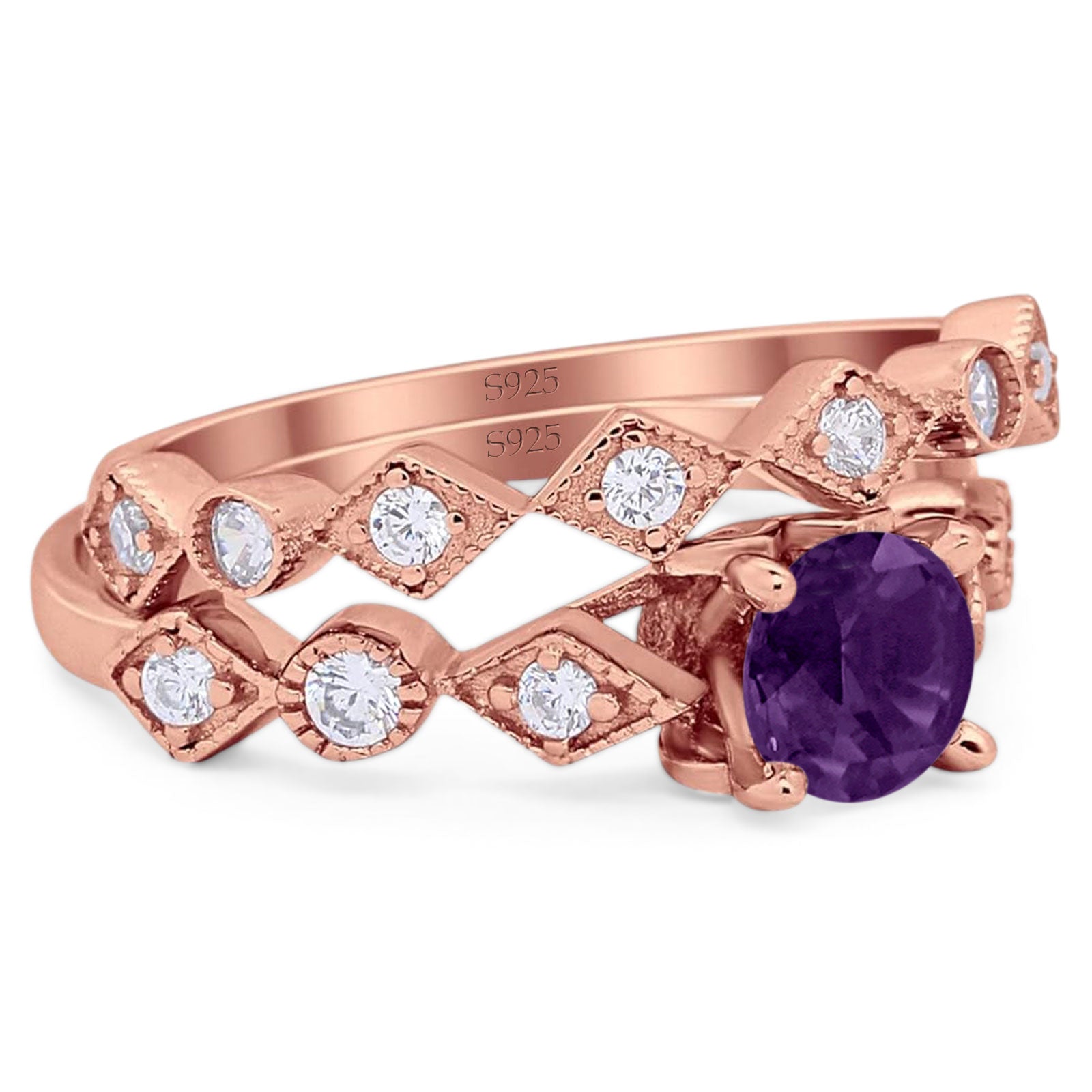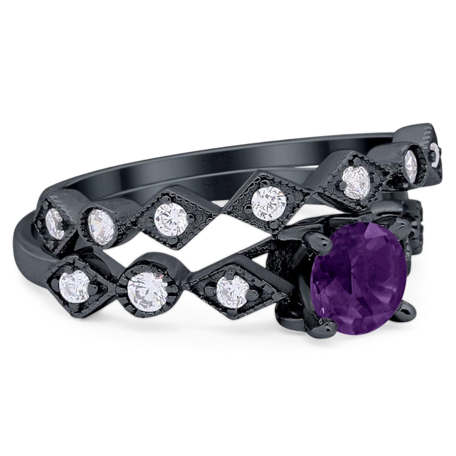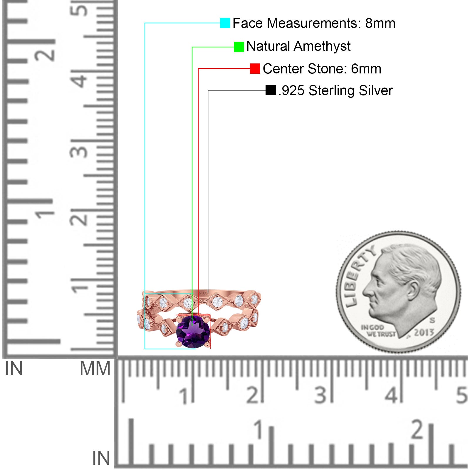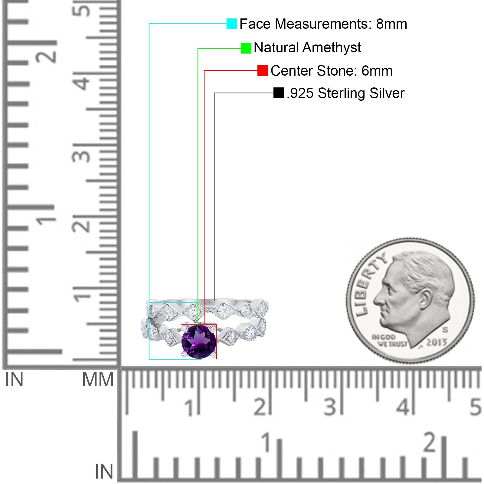 Art Deco Two Piece Round Natural Amethyst Wedding Set Ring 925 Sterling Silver