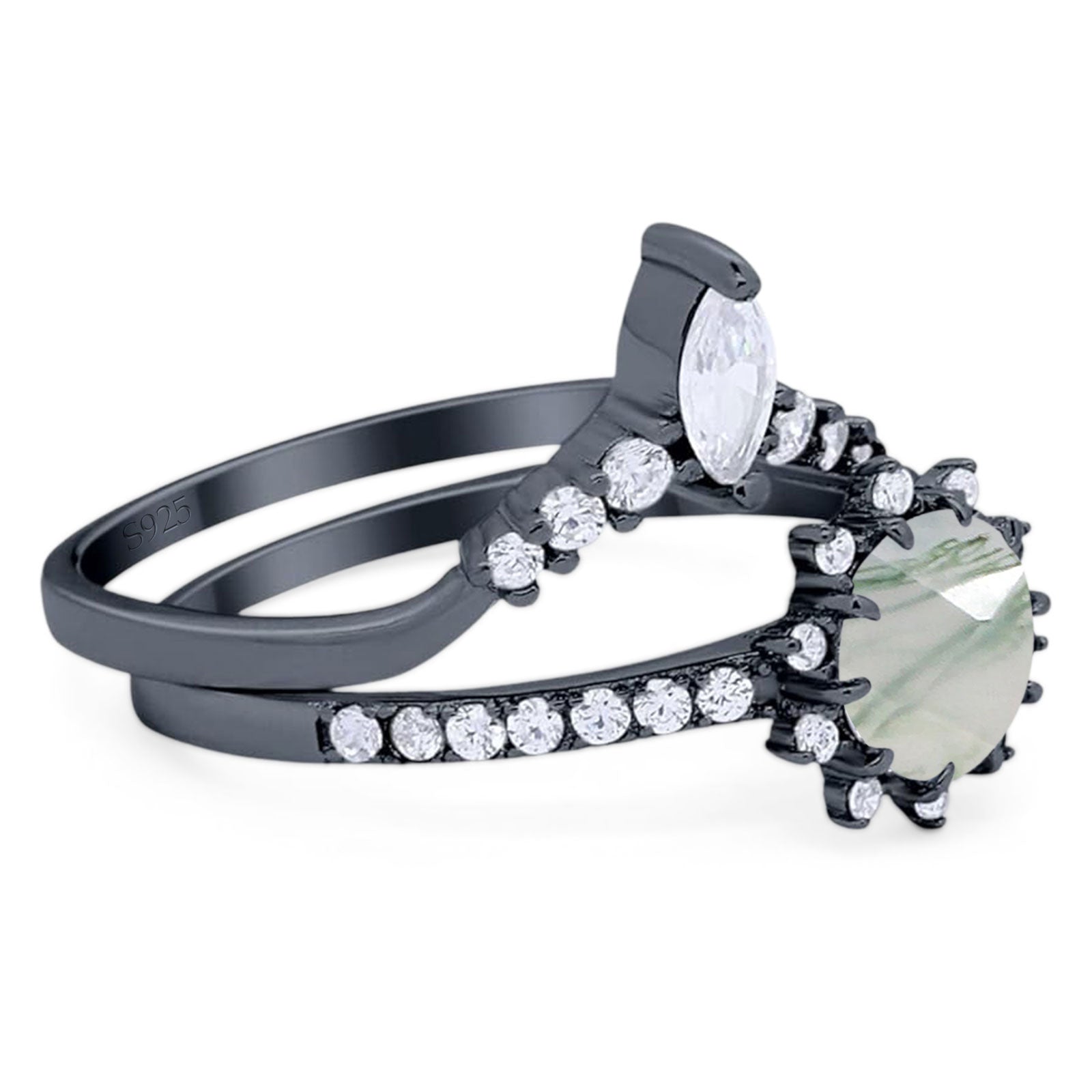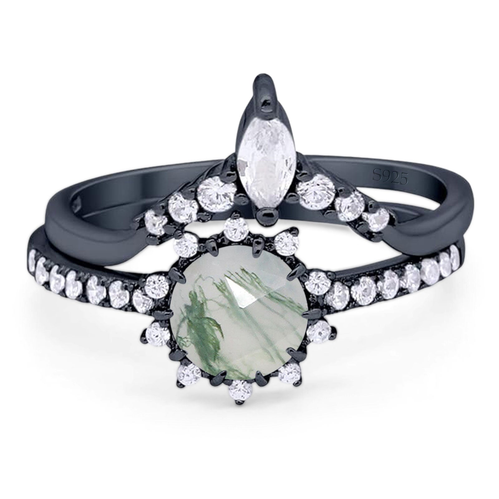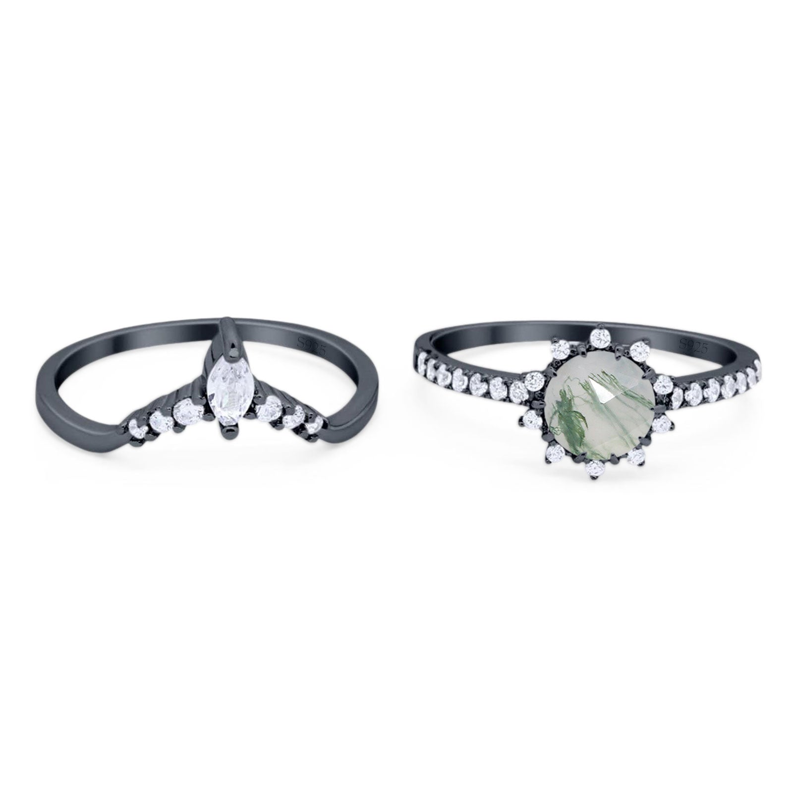 Art Deco Two Piece Round Natural Green Moss Agate Bridal Set Chevron Ring 925 Sterling Silver
