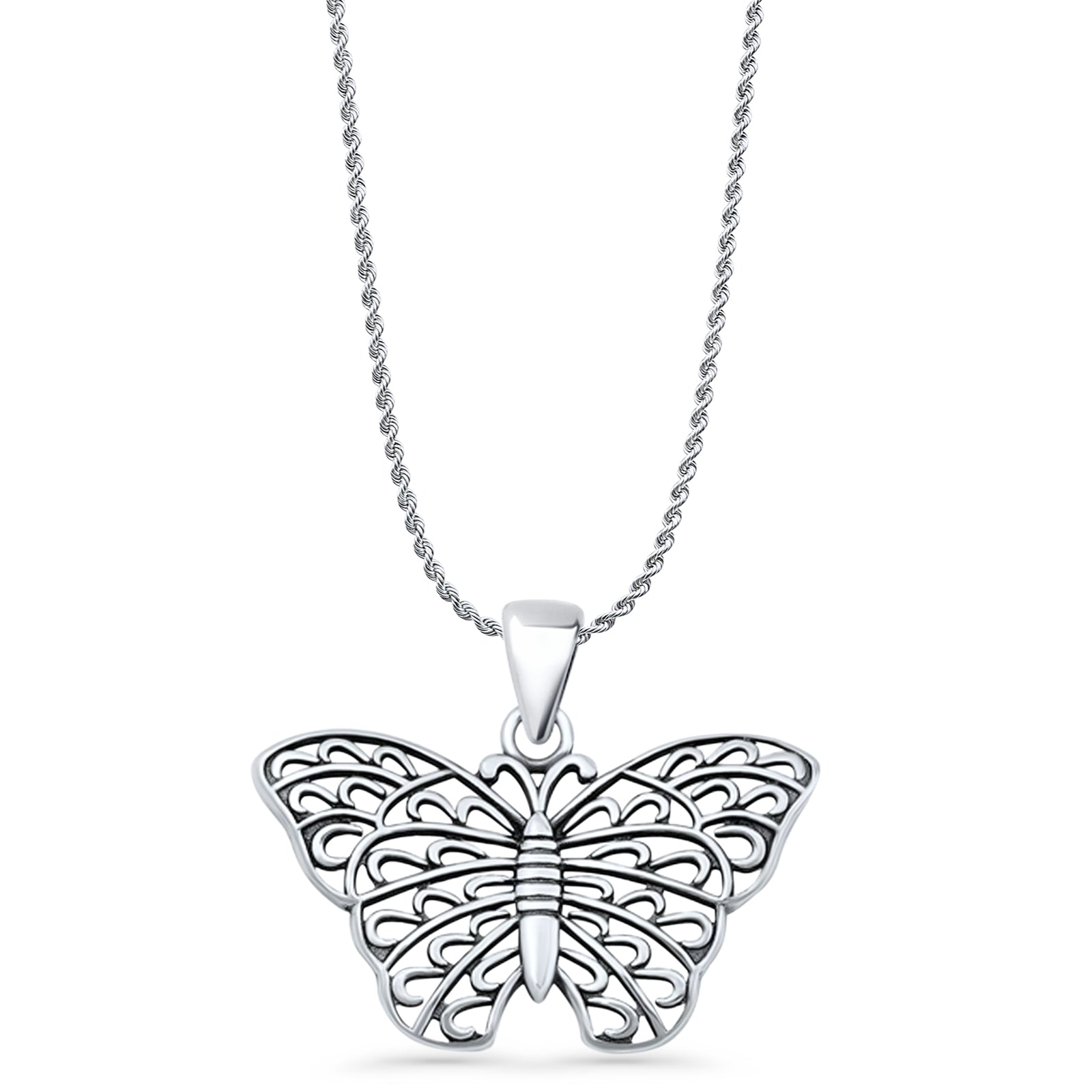Butterfly Filigree Pendant Rope Chain Necklace Oxidized 925 Sterling Silver