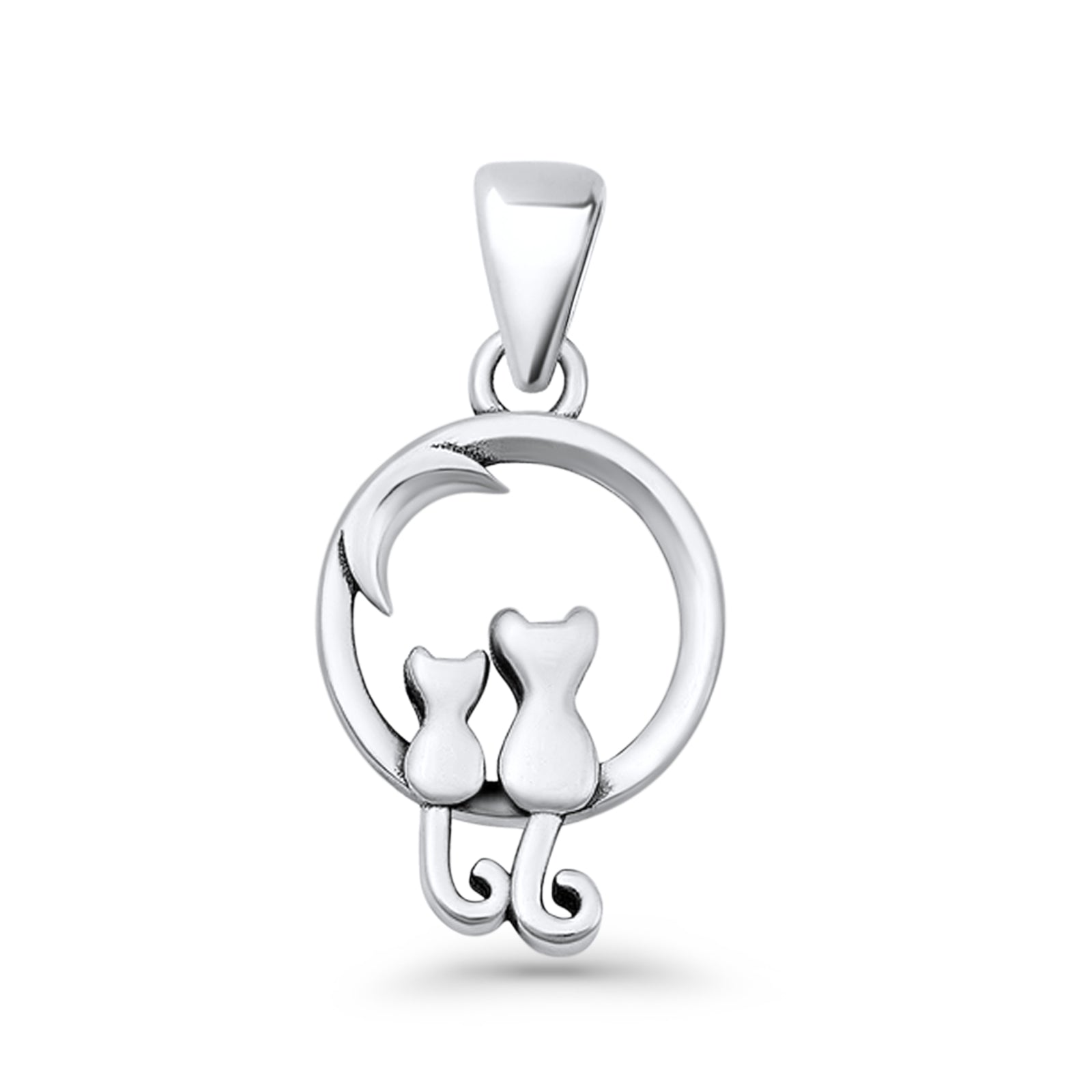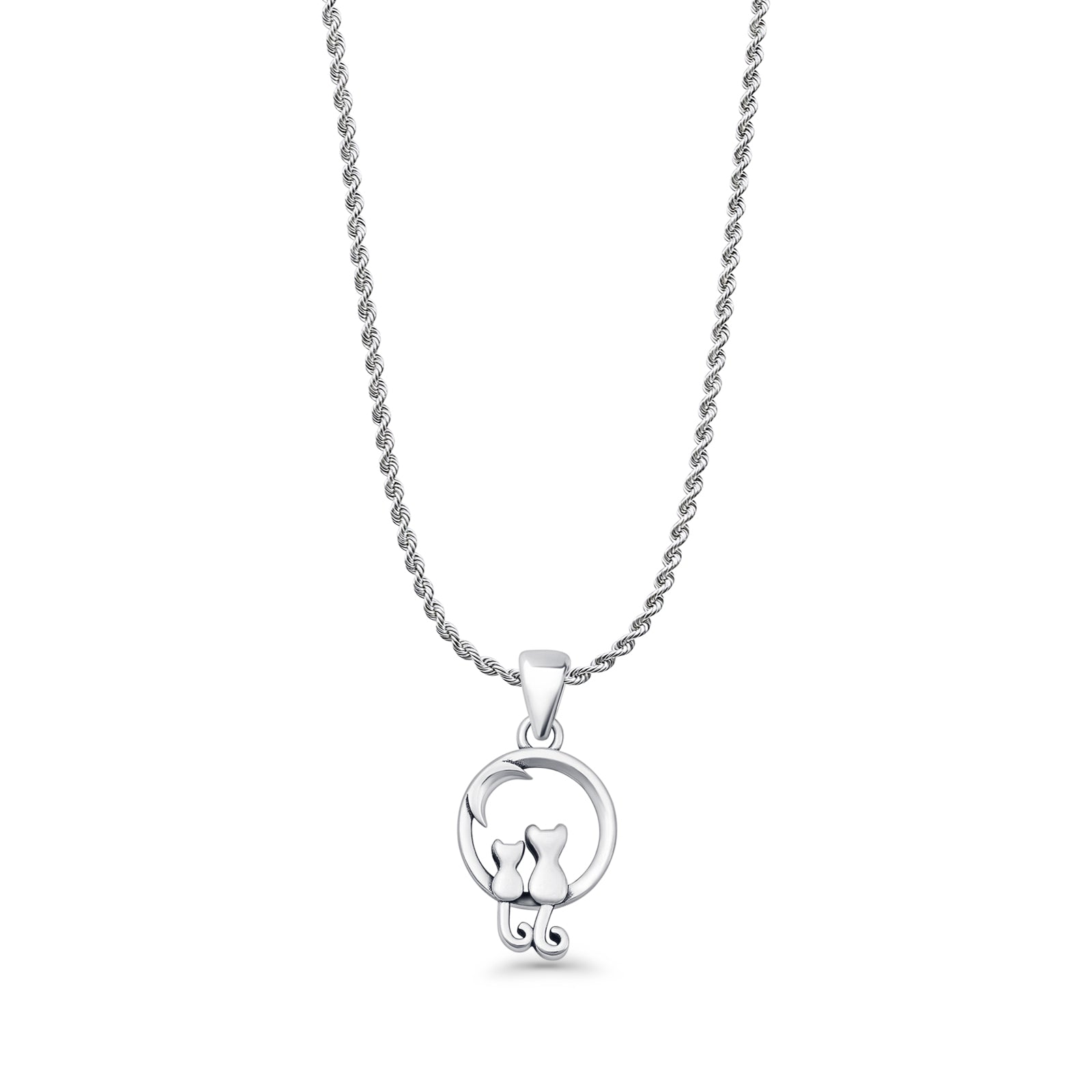 Cat & Moon Pendant Rope Chain Necklace Oxidized 925 Sterling Silver