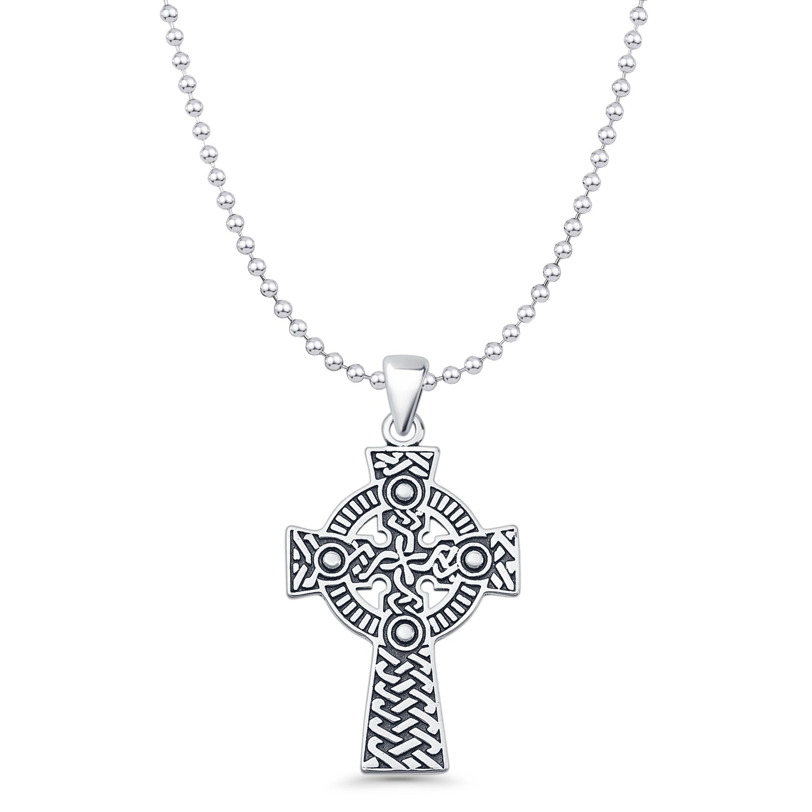 Celtic Cross Pendant Bead Chain Necklace Oxidized 925 Sterling Silver
