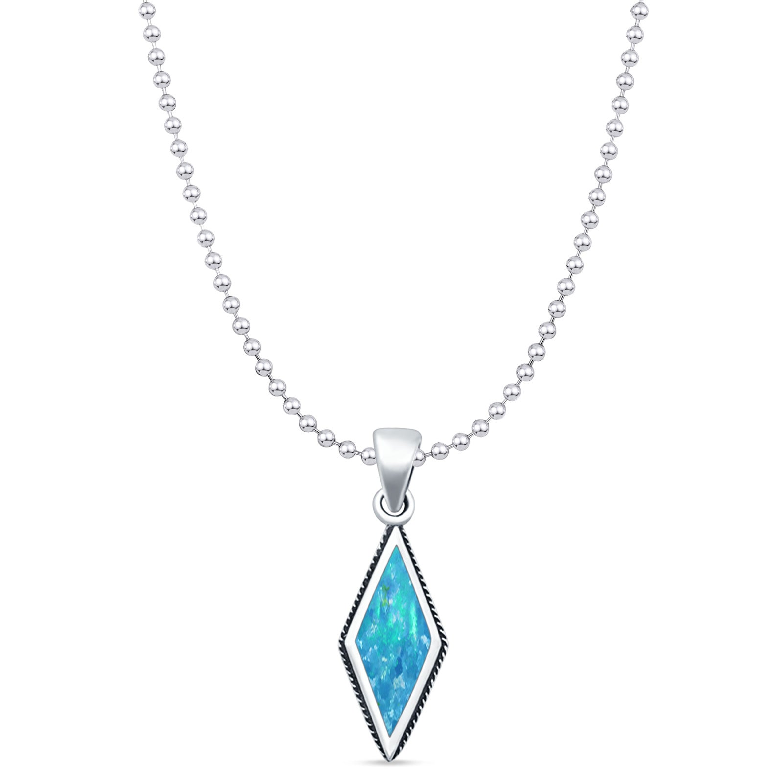 Diamond Shape Lab Created Blue Opal Oxidized Pendant Bead Chain Necklace 925 Sterling Silver
