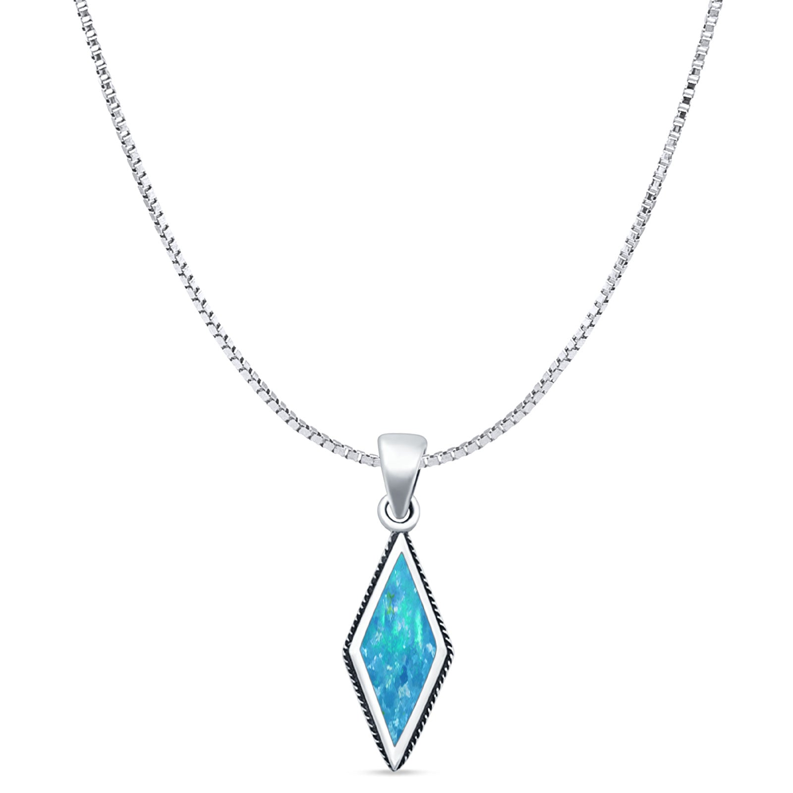 Diamond Shape Lab Created Blue Opal Oxidized Pendant Box Chain Necklace 925 Sterling Silver