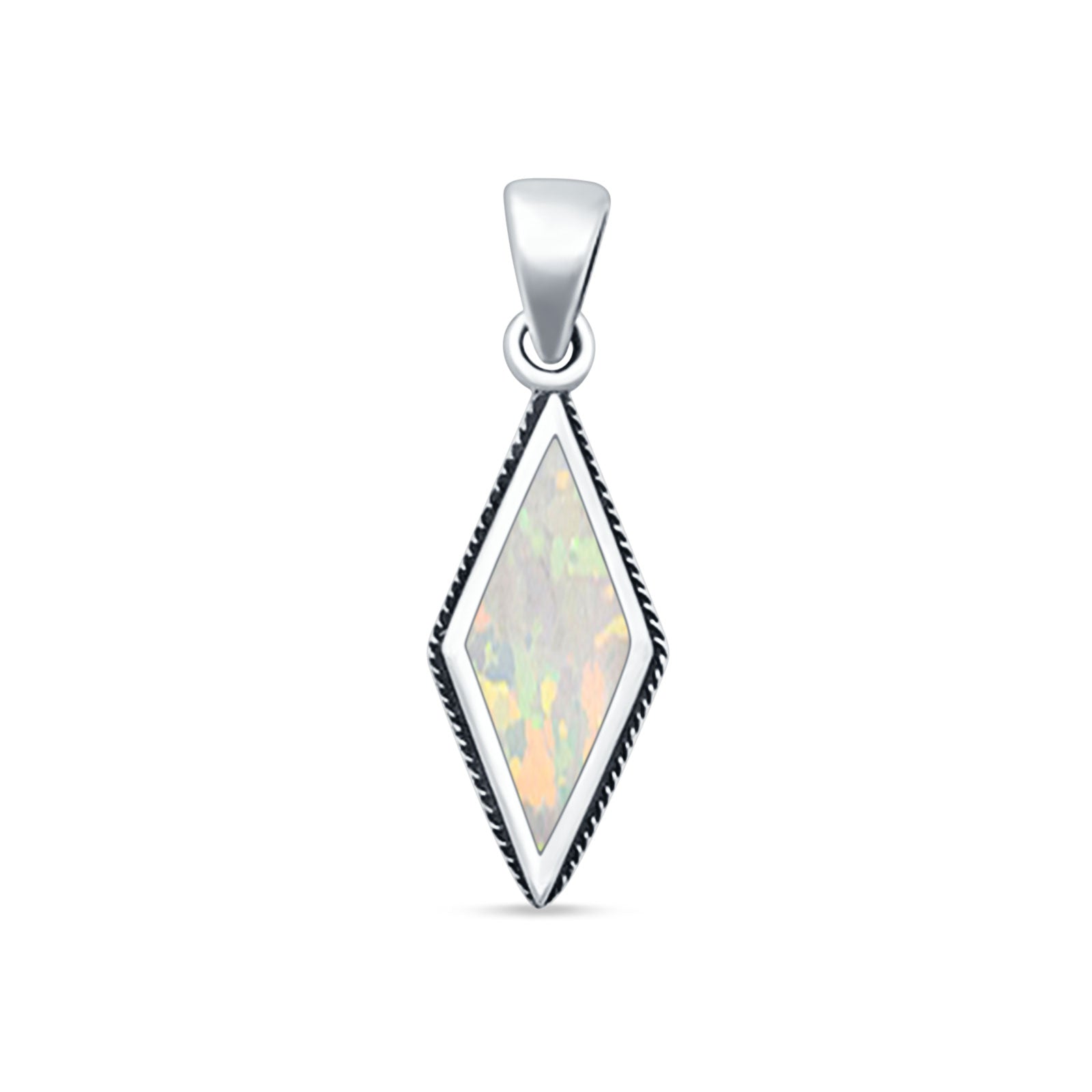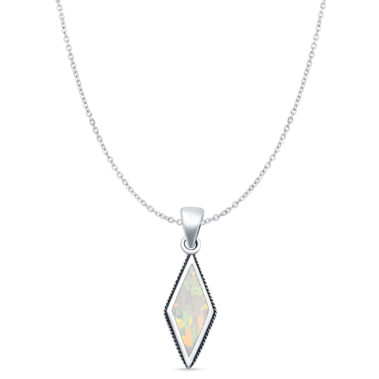 Style: Diamond Shape Lab Created White Opal Oxidized Pendant Necklace
