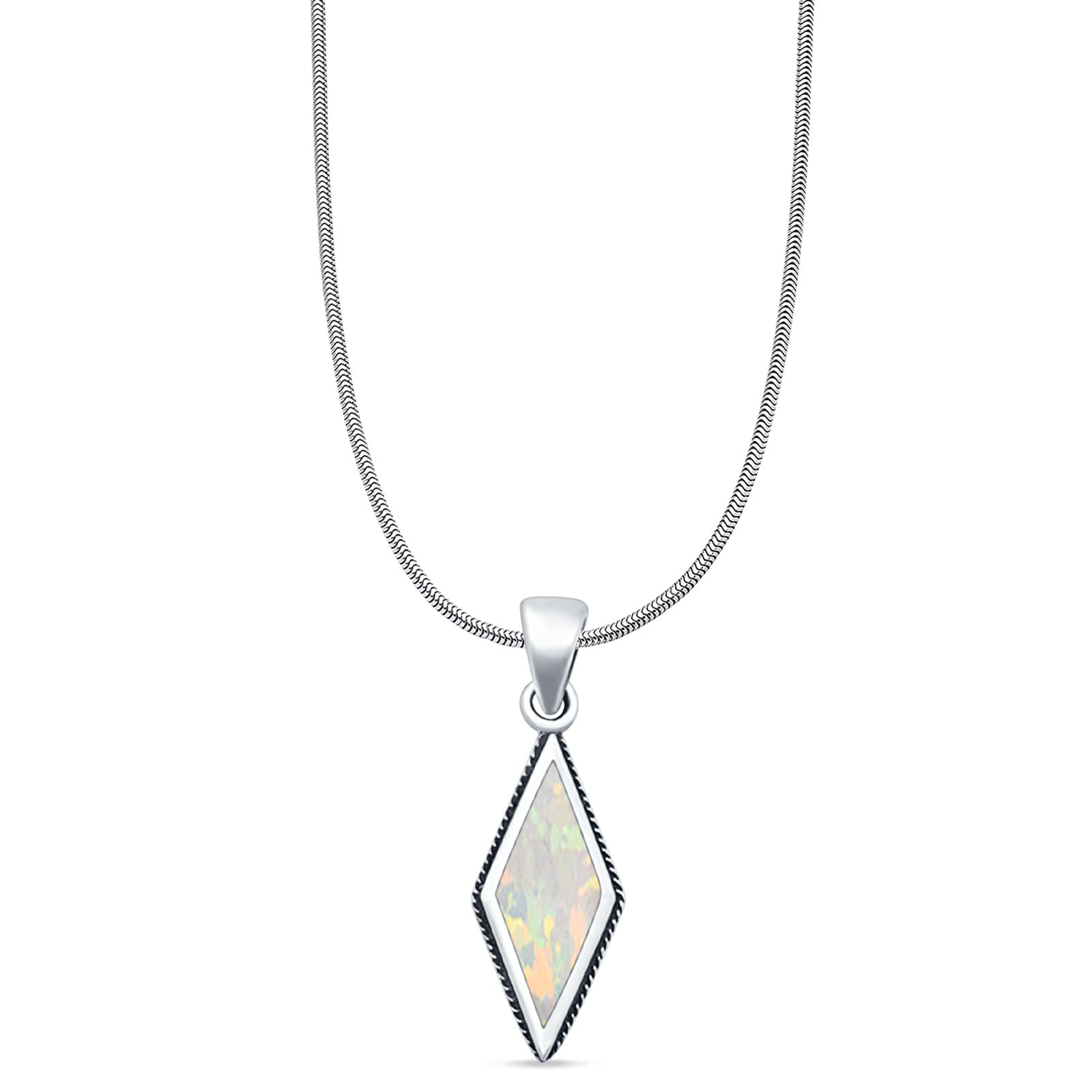Diamond Shape Lab Created White Opal Oxidized Pendant Snake Chain Necklace 925 Sterling Silver