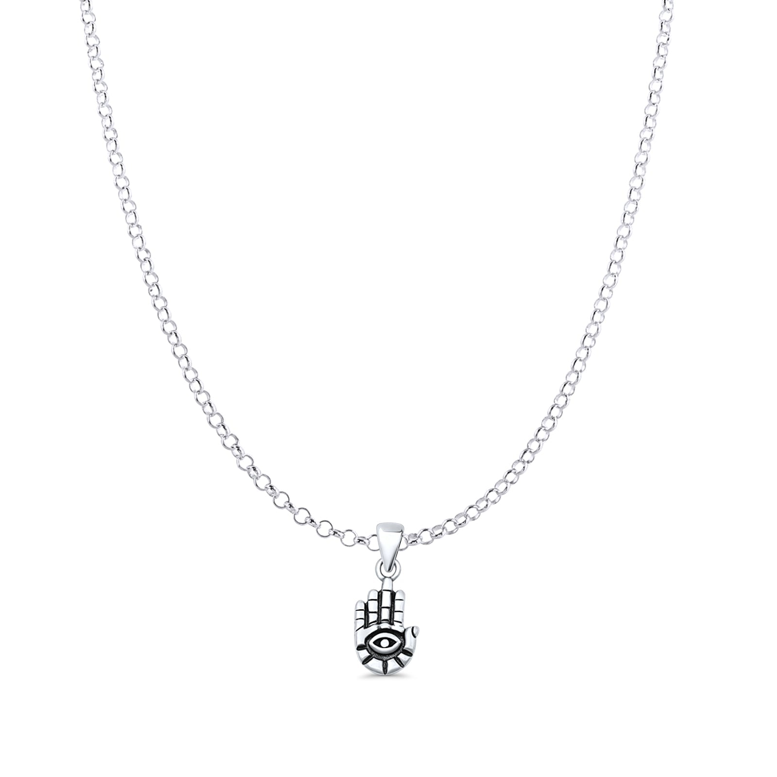 Hamsa & Evil Eye Pendant Oxidized Rolo Chain Necklace 925 Sterling Silver