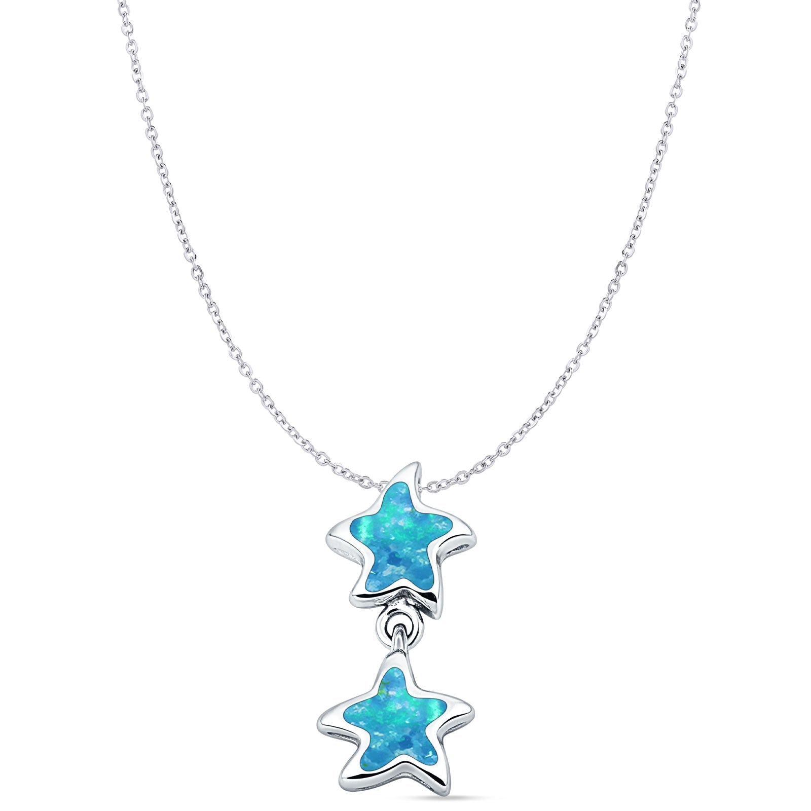 Lab Created Blue Opal Charm Star Pendant Cable Chain Necklace 925 Sterling Silver