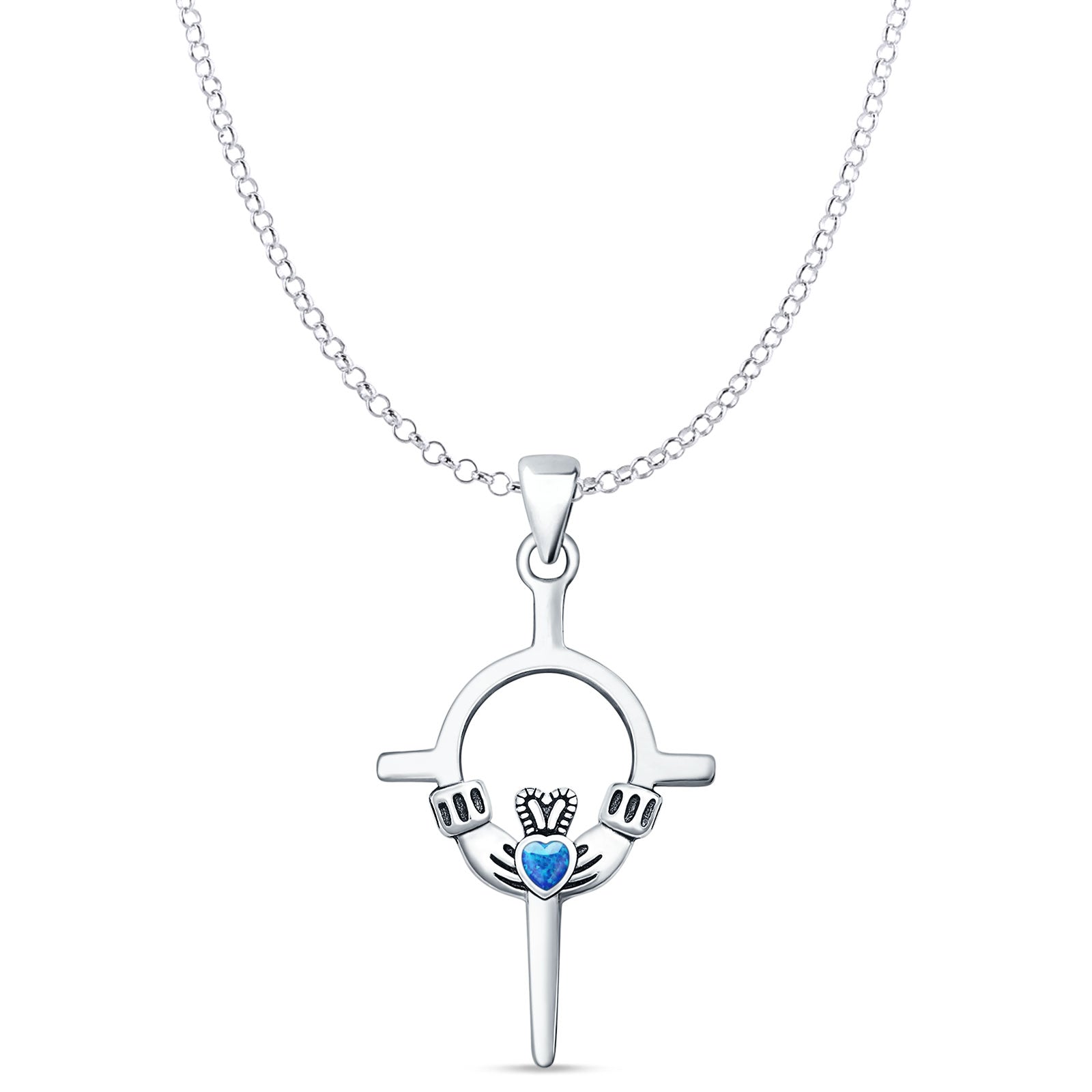 Lab Created Blue Opal Claddagh Pendant Rolo Chain Necklace 925 Sterling Silver