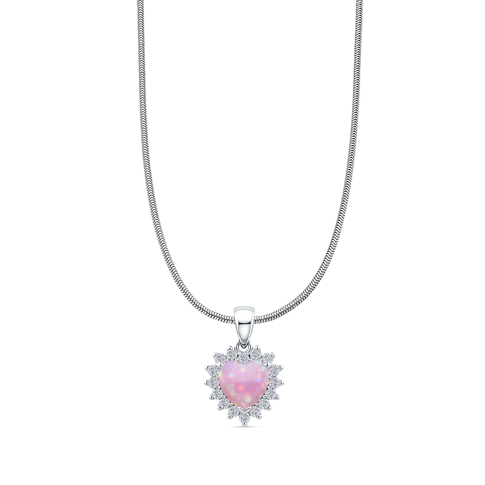 Lab Created Pink Opal & Halo CZ Heart Pendant Snake Chain Necklace 925 Sterling Silver