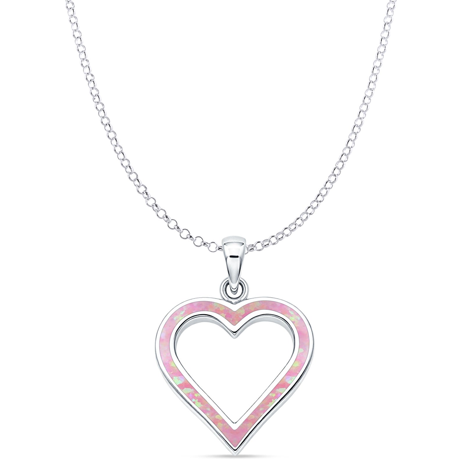Lab Created Pink Opal Heart Pendant Rolo Chain Necklace 925 Sterling Silver