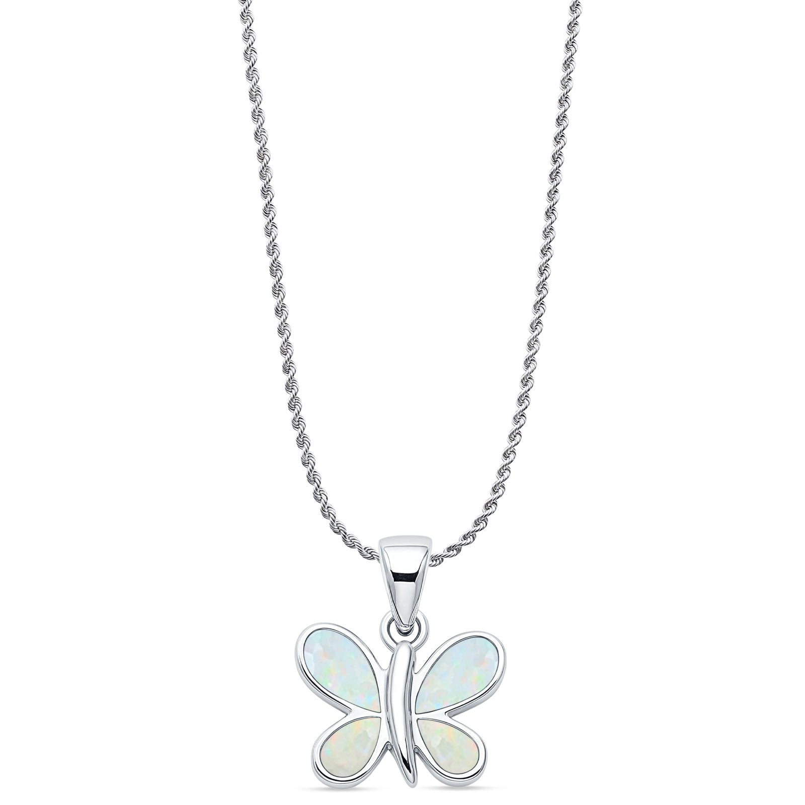 Lab Created White Opal Butterfly Pendant Rope Chain Necklace 925 Sterling Silver