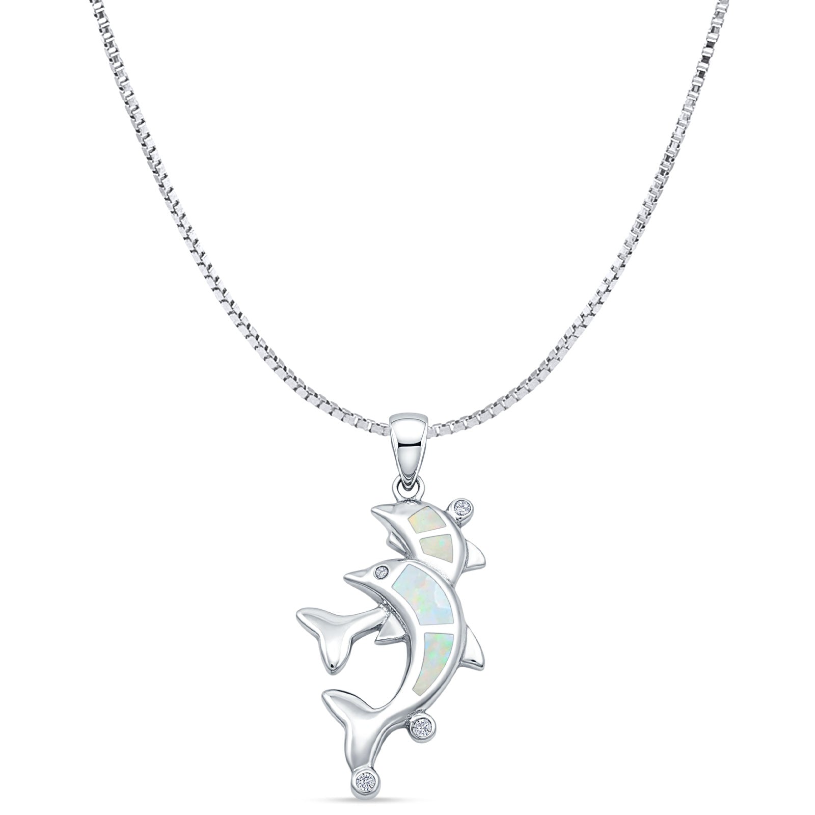 Lab Created White Opal & CZ Dolphins Pendant Box Chain Necklace 925 Sterling Silver