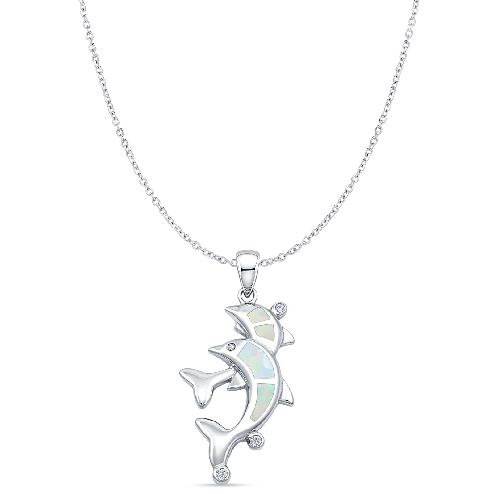 Style: Lab Created White Opal & CZ Dolphins Pendant Necklace