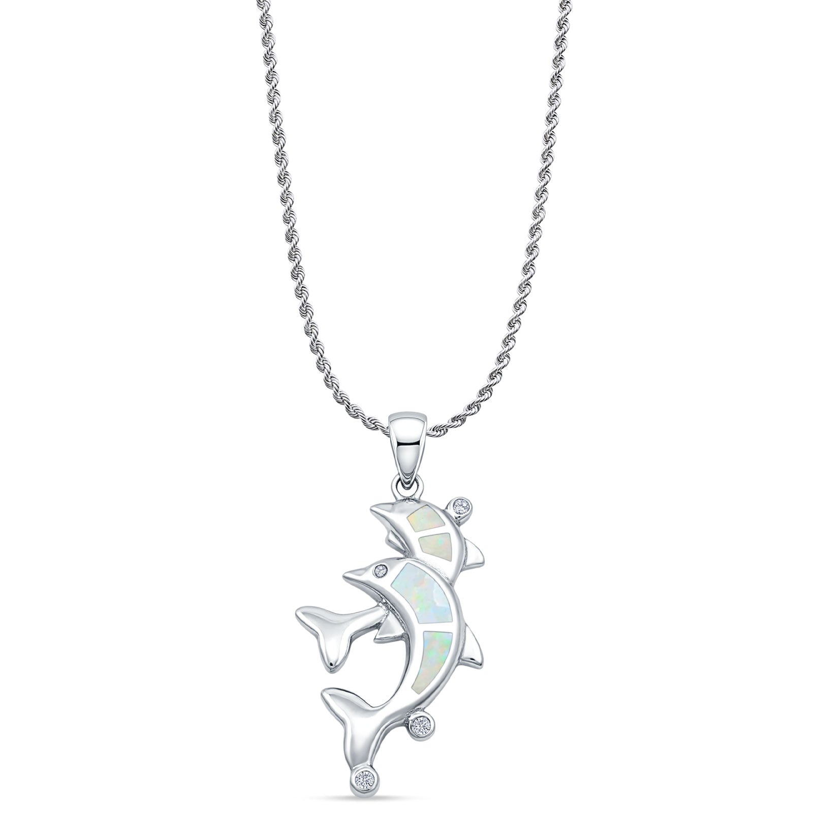 Style: Lab Created White Opal & CZ Dolphins Pendant Necklace