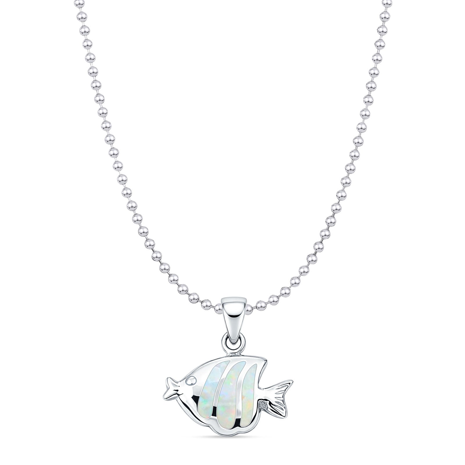 Lab Created White Opal Fish Pendant Bead Chain Necklace 925 Sterling Silver
