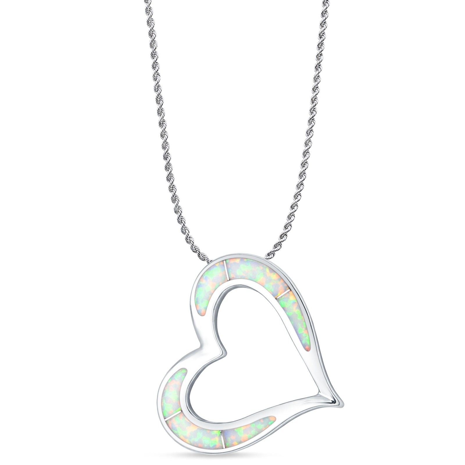Lab Created White Opal Heart Pendant Rope Chain Necklace 925 Sterling Silver