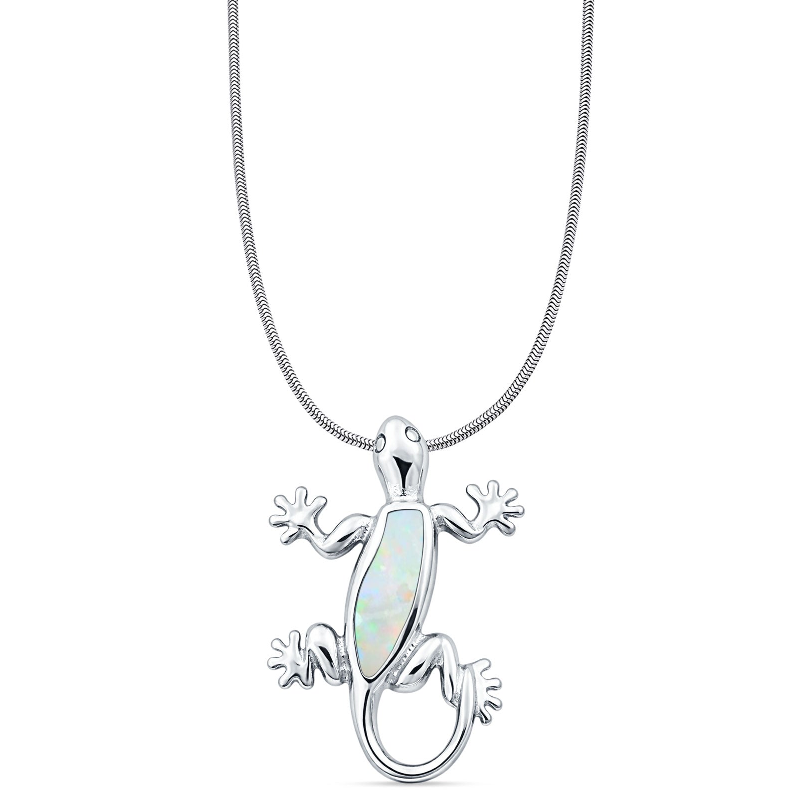 Lab Created White Opal Lizard Pendant Snake Chain Necklace 925 Sterling Silver