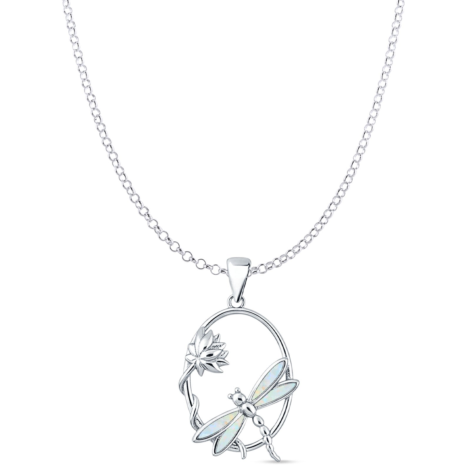 Lab Created White Opal Lotus & Dragonfly Pendant Rolo Chain Necklace 925 Sterling Silver