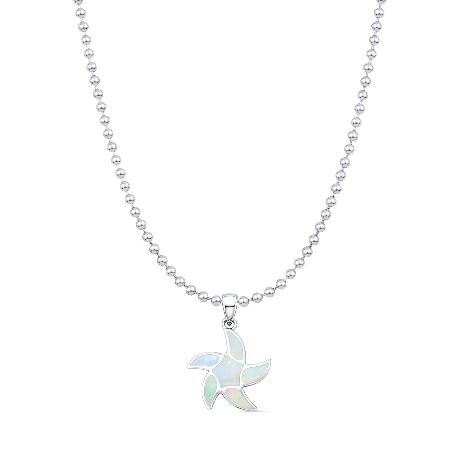Lab Created White Opal Starfish Pendant Bead Chain Necklace 925 Sterling Silver