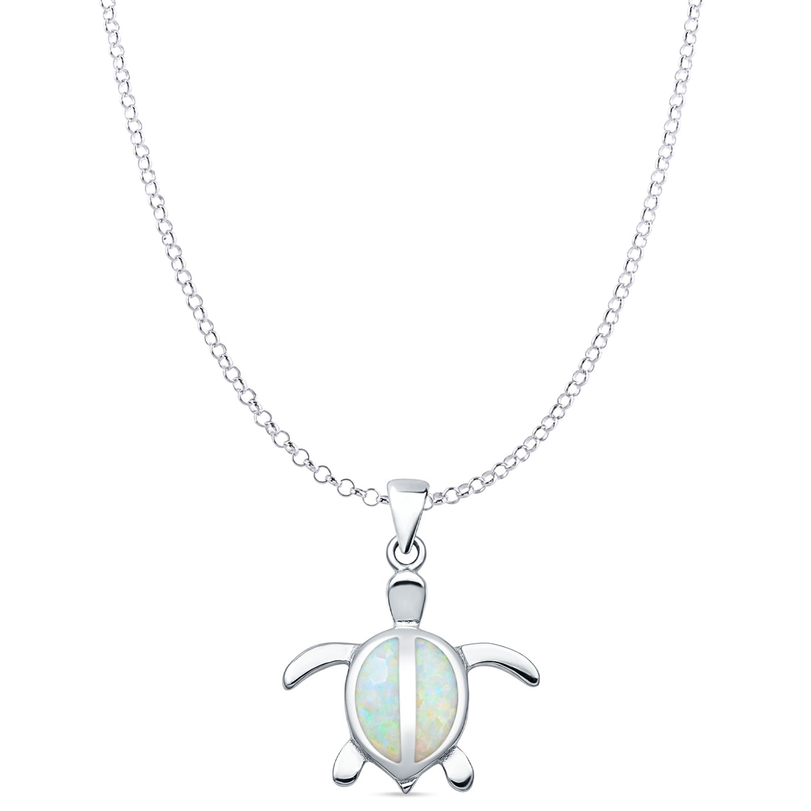 Lab Created White Opal Turtle Pendant Rolo Chain Necklace 925 Sterling Silver