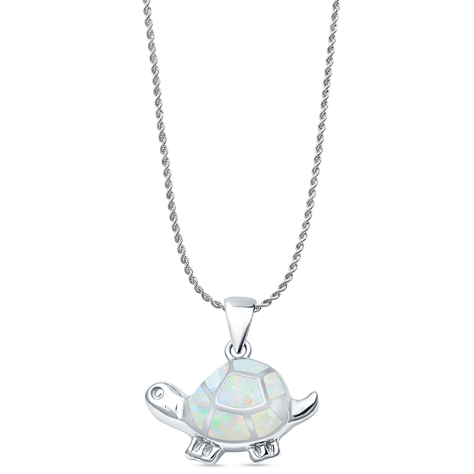Lab Created White Opal Turtle Pendant Rope Chain Necklace 925 Sterling Silver