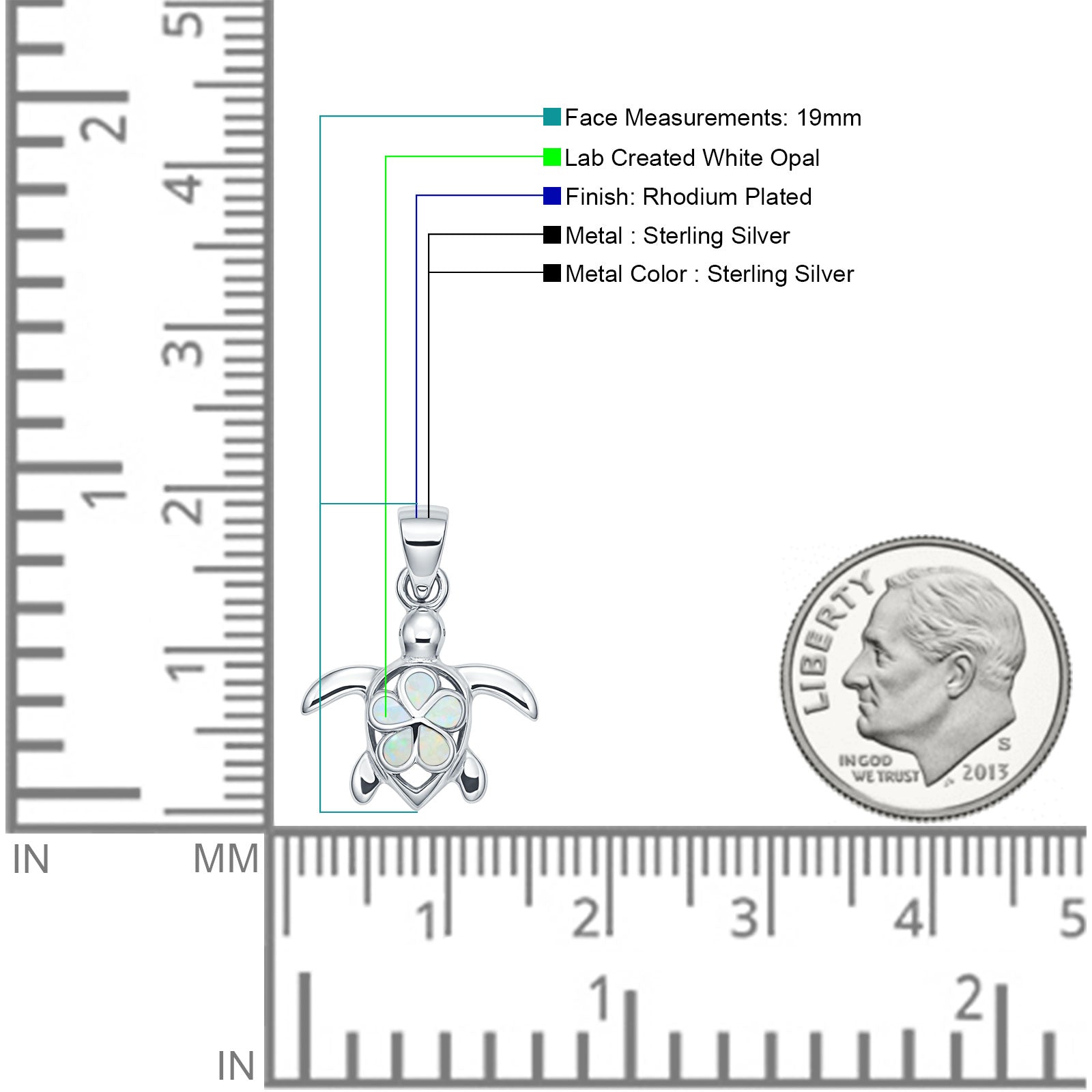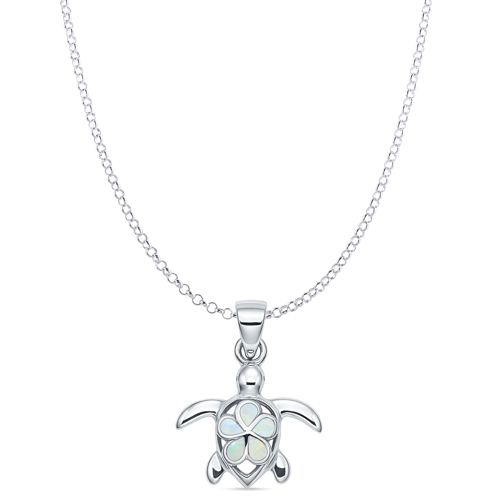 Lab Created White Opal Turtle & Plumeria Pendant Rolo Chain Necklace 925 Sterling Silver
