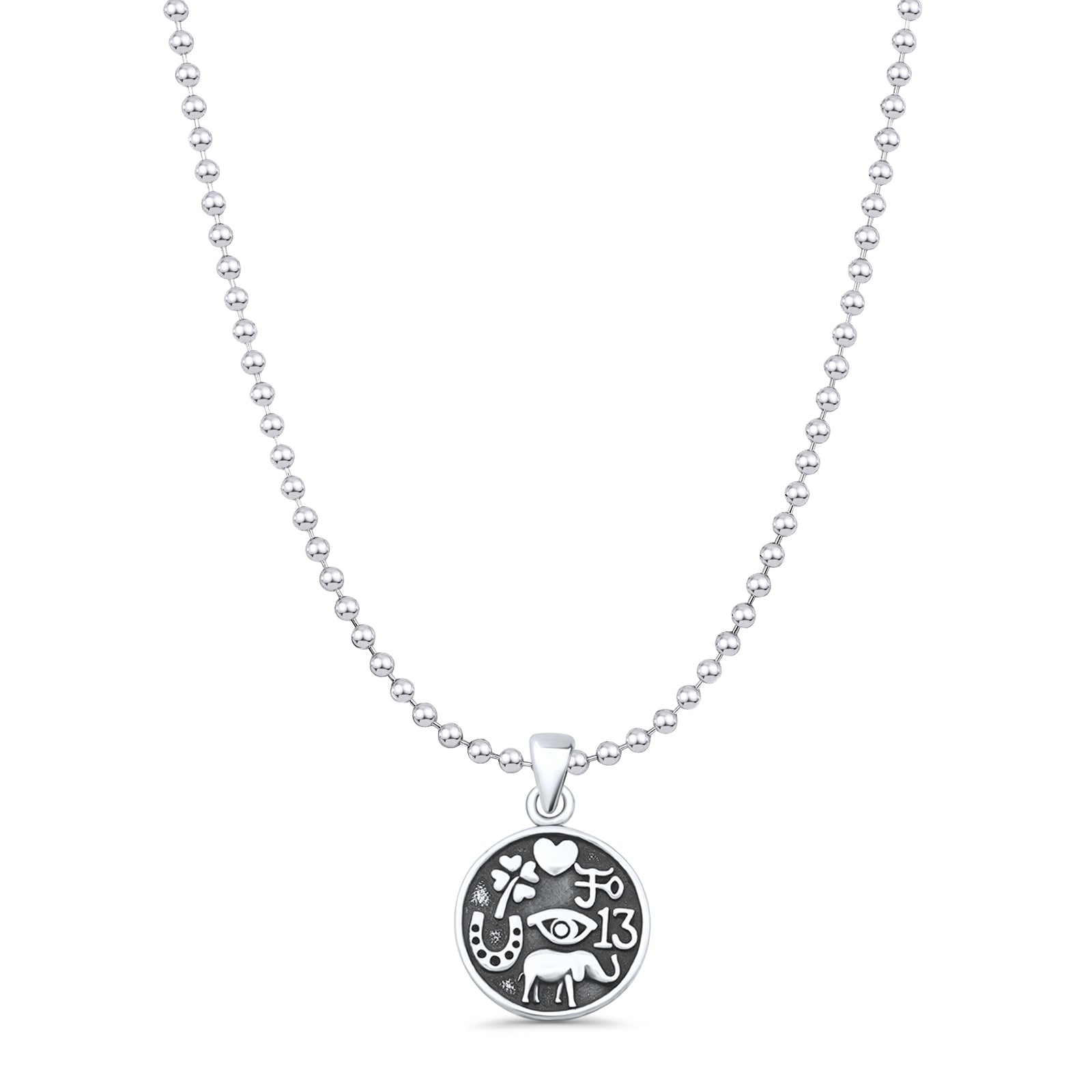 Lucky Symbols Pendant Oxidized Bead Chain Necklace 925 Sterling Silver