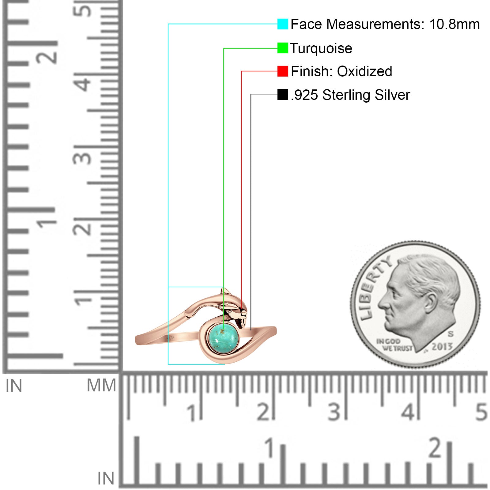 Minimalist 10.8mm Round Turquoise Dolphin Ring Oxidized 925 Sterling Silver