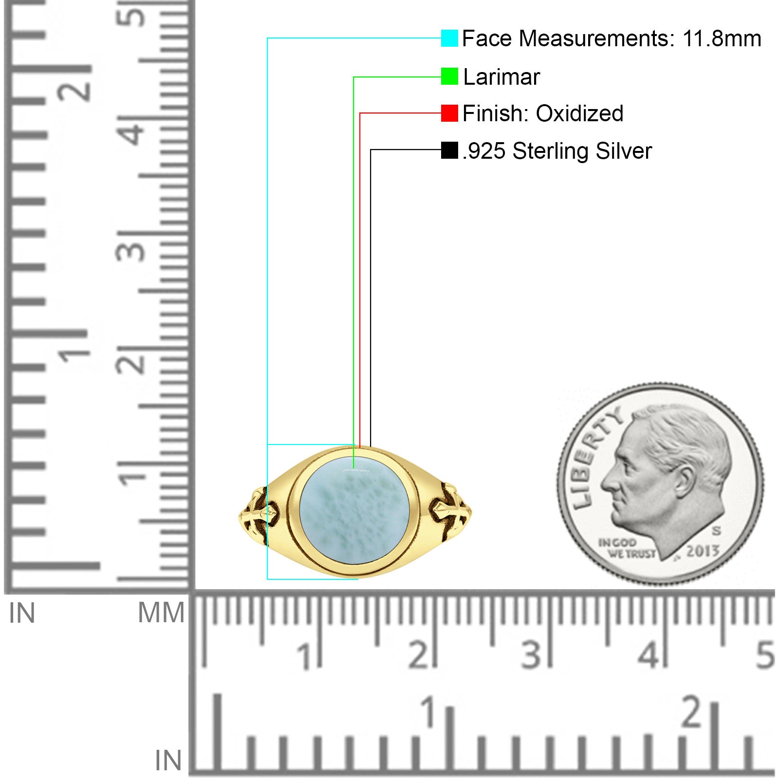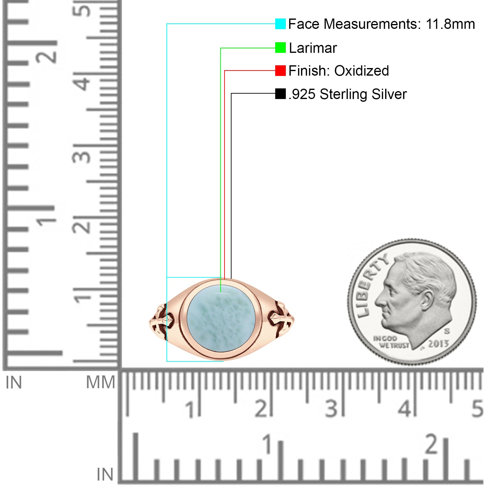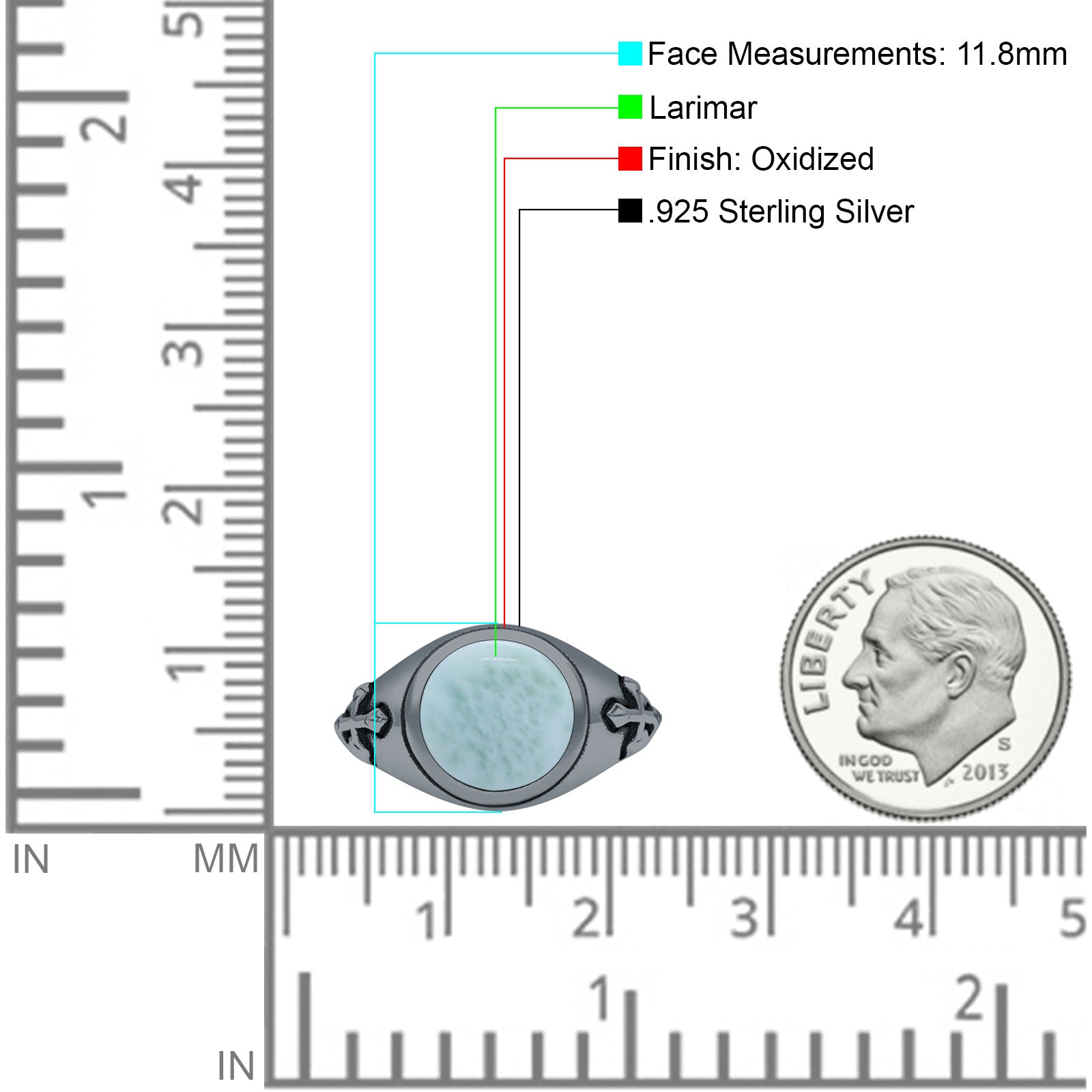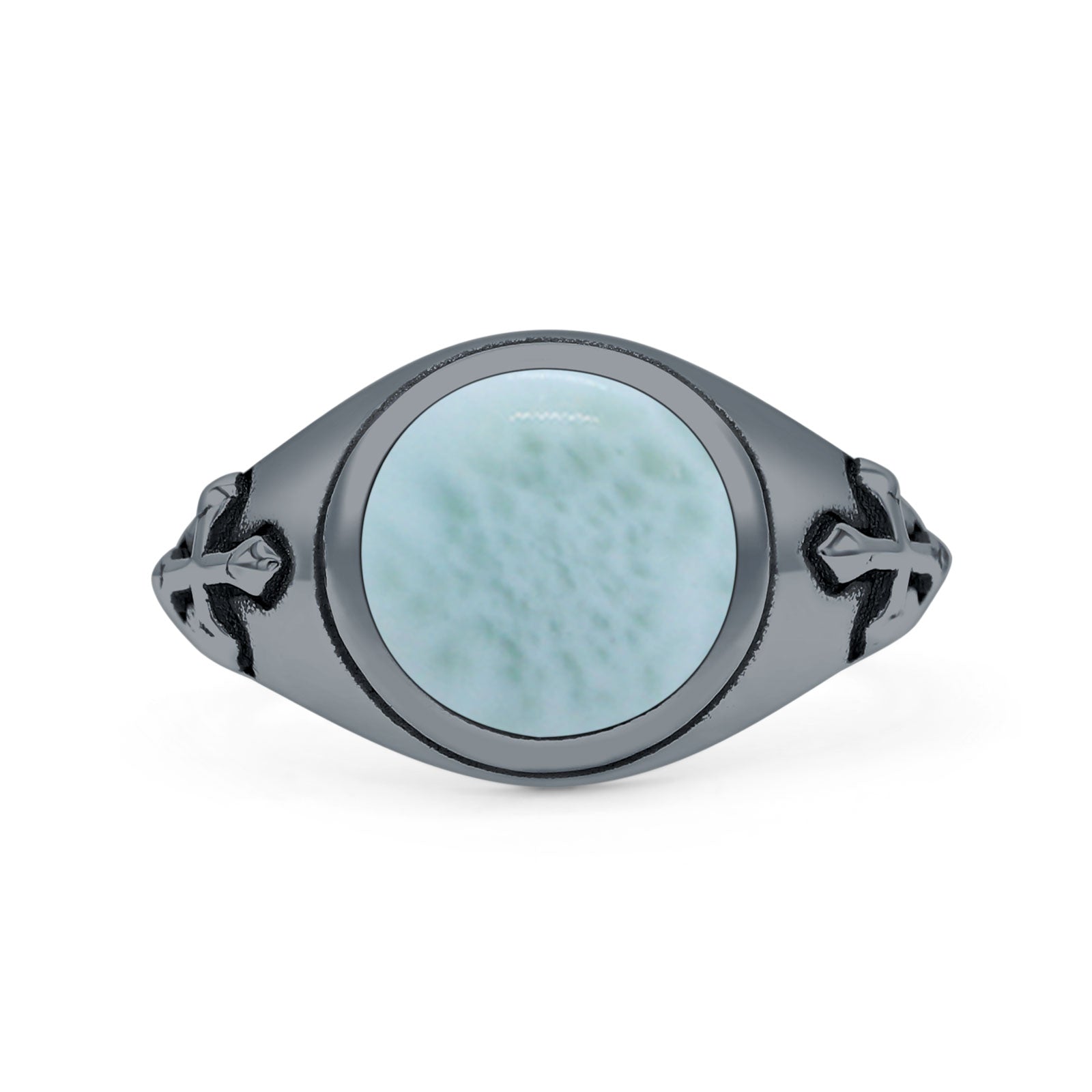 Minimalist 11.8mm Round Larimar Medieval Cross Ring Oxidized 925 Sterling Silver