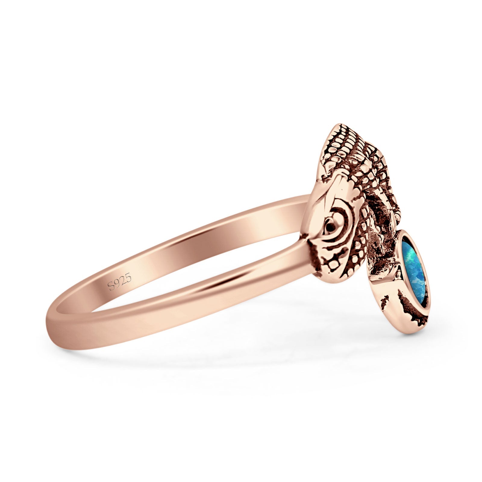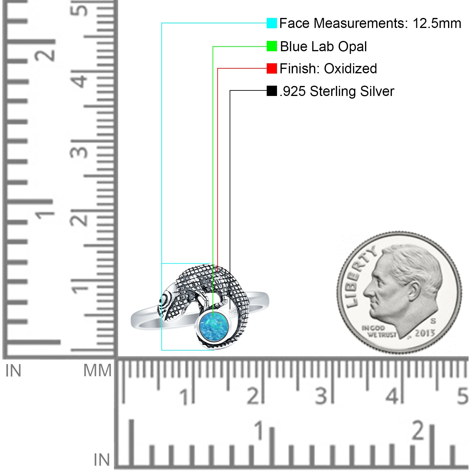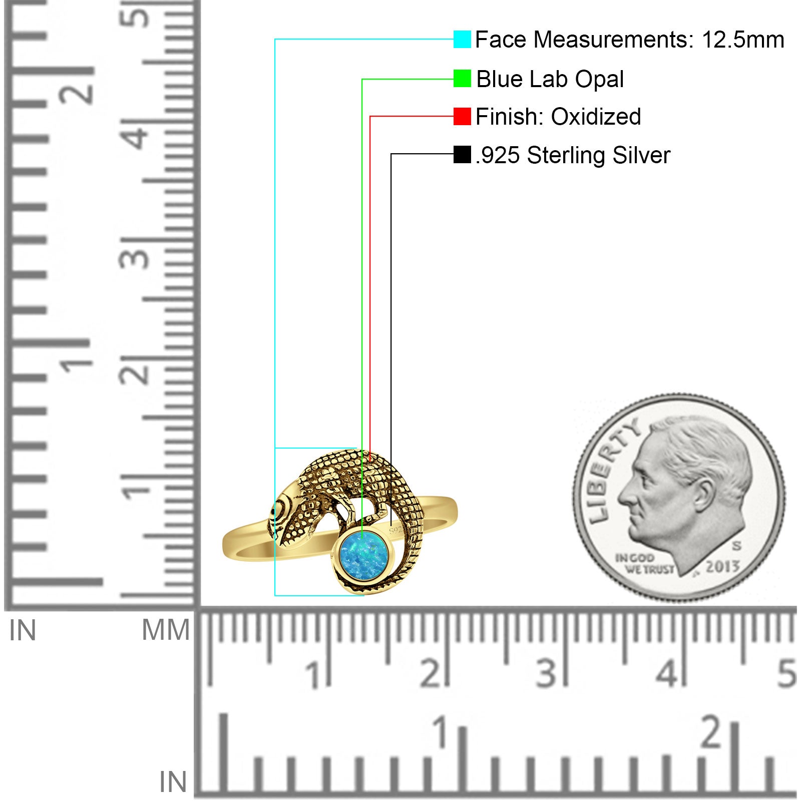 Minimalist 12.5mm Round Lab Created Blue Opal Lizard Ring Oxidized 925 Sterling Silver