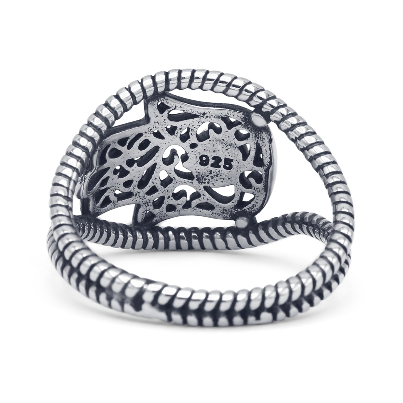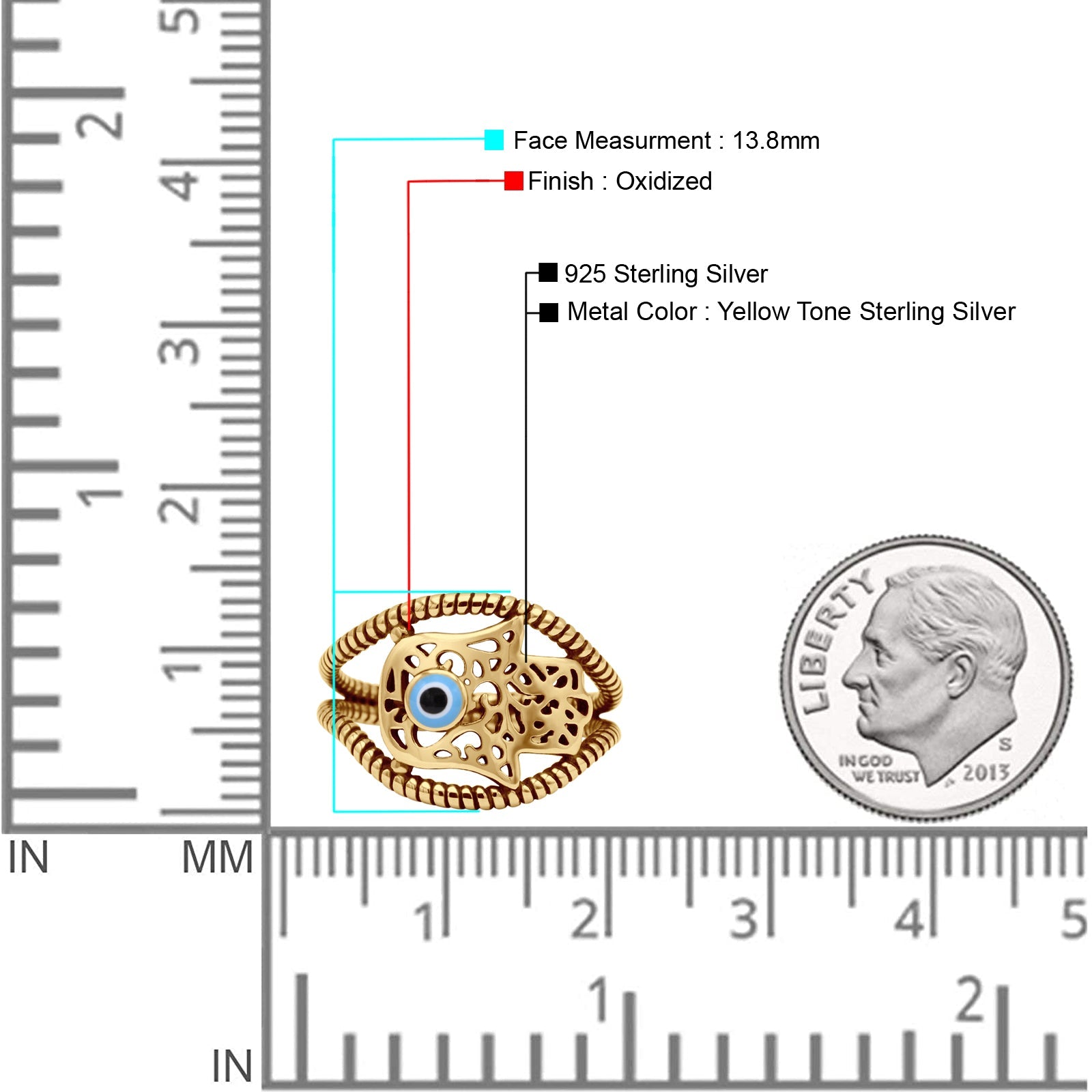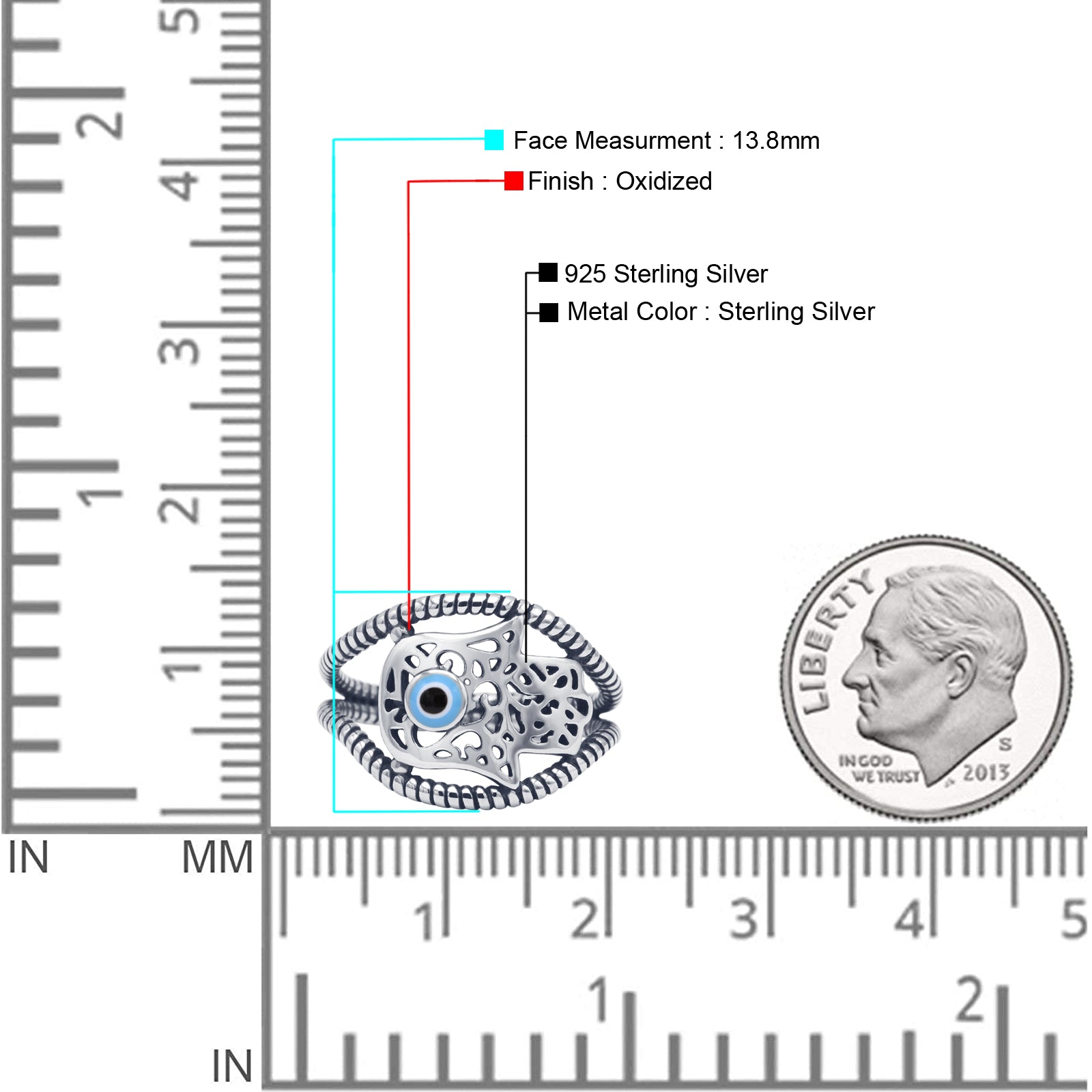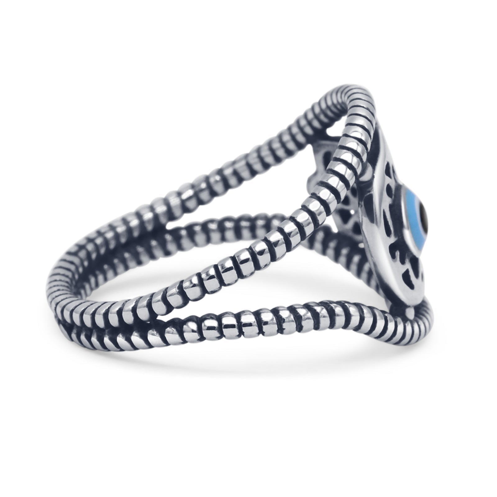 Design: Oxidized Hamsa Hand Evil Eye Filigree Ring.
