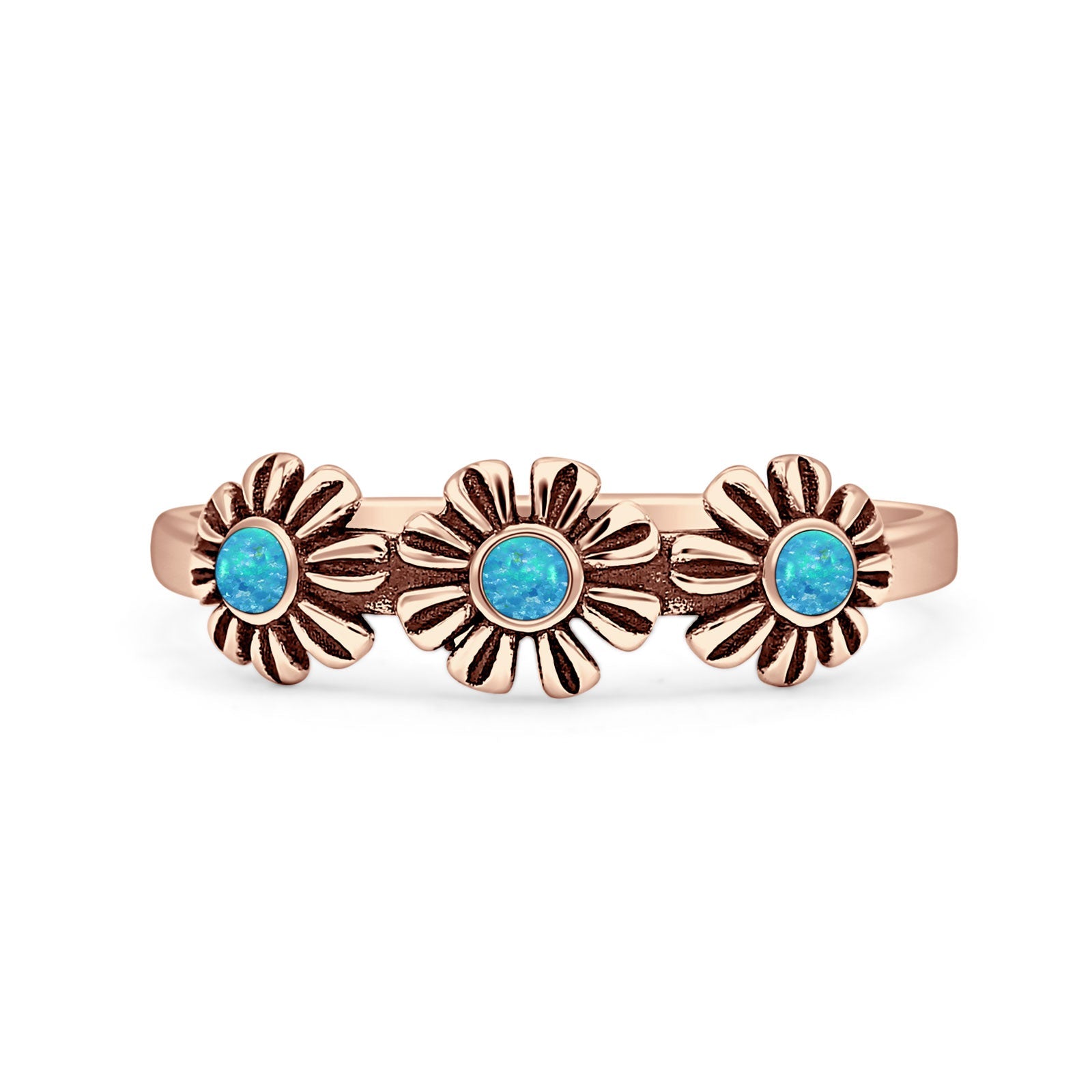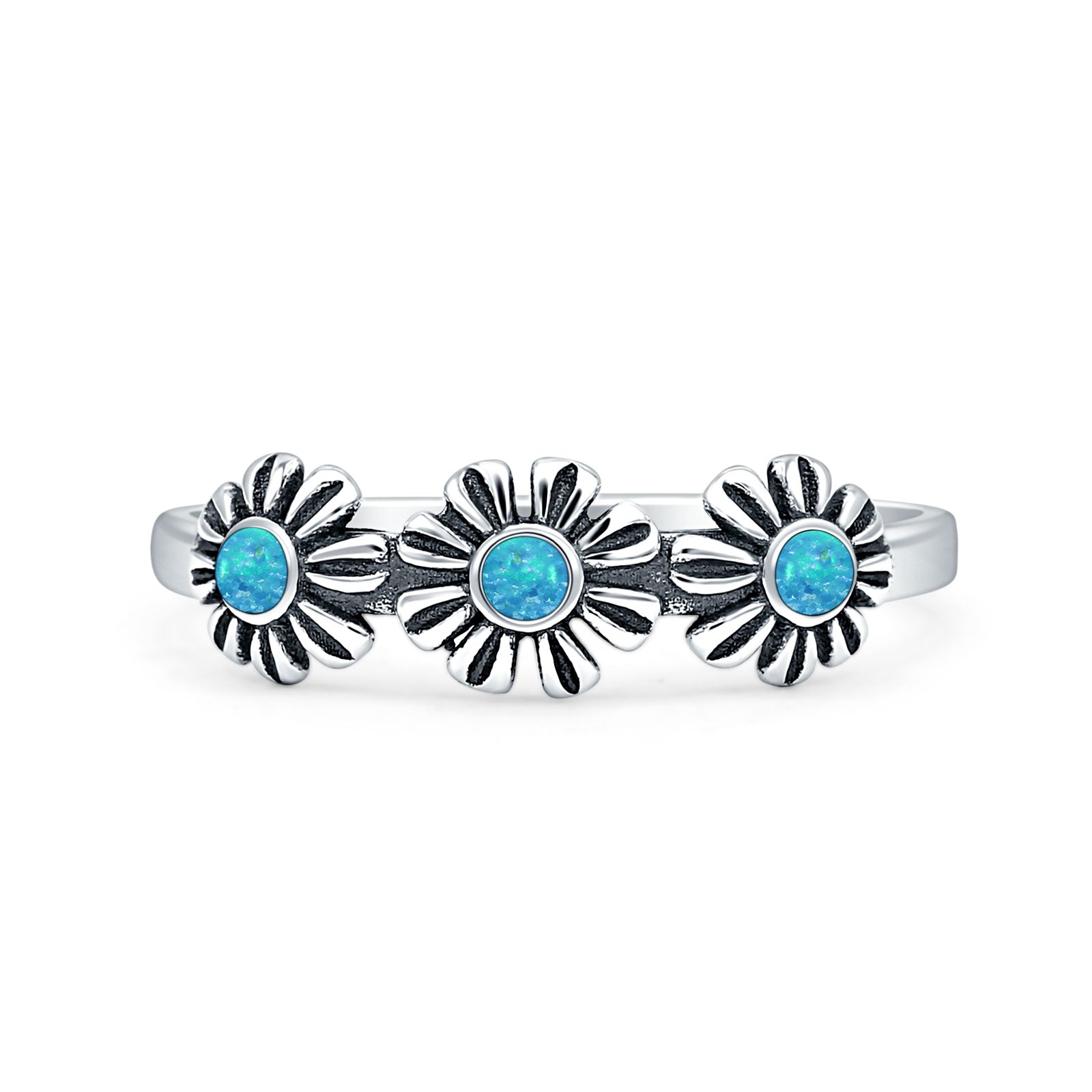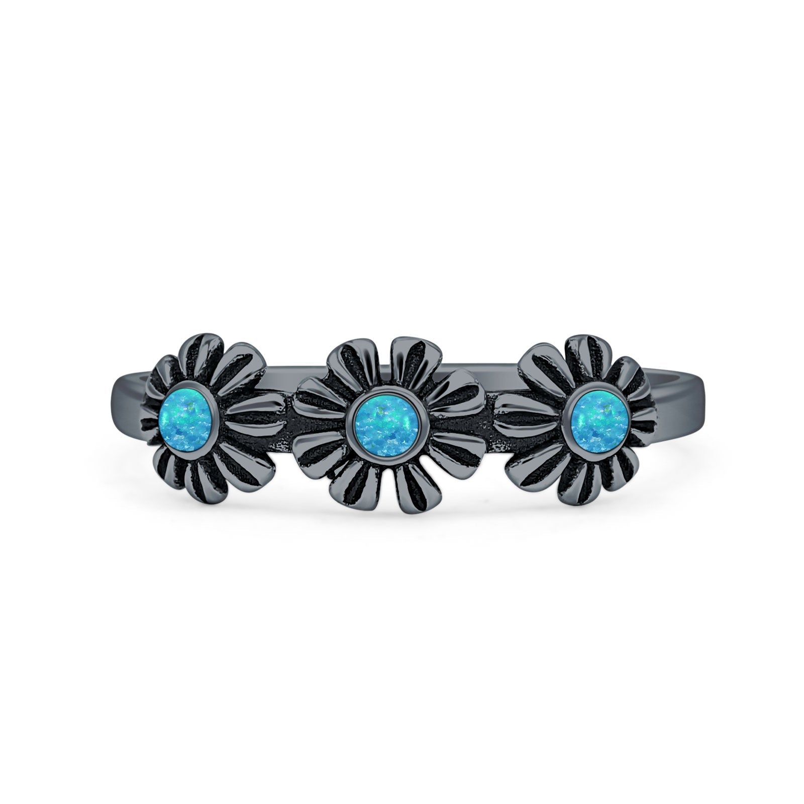 Minimalist 6mm Round Lab Created Blue Opal Flower Ring Oxidized 925 Sterling Silver
