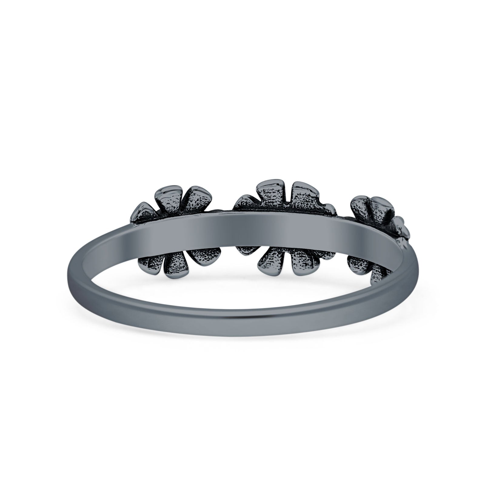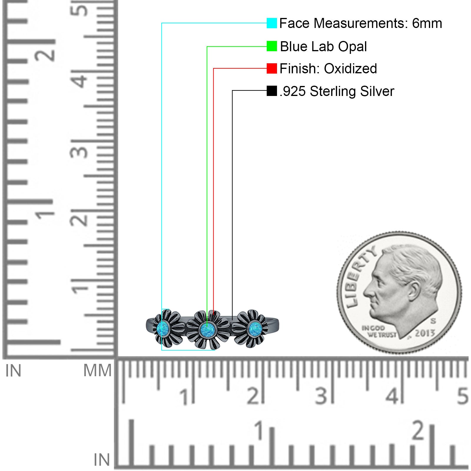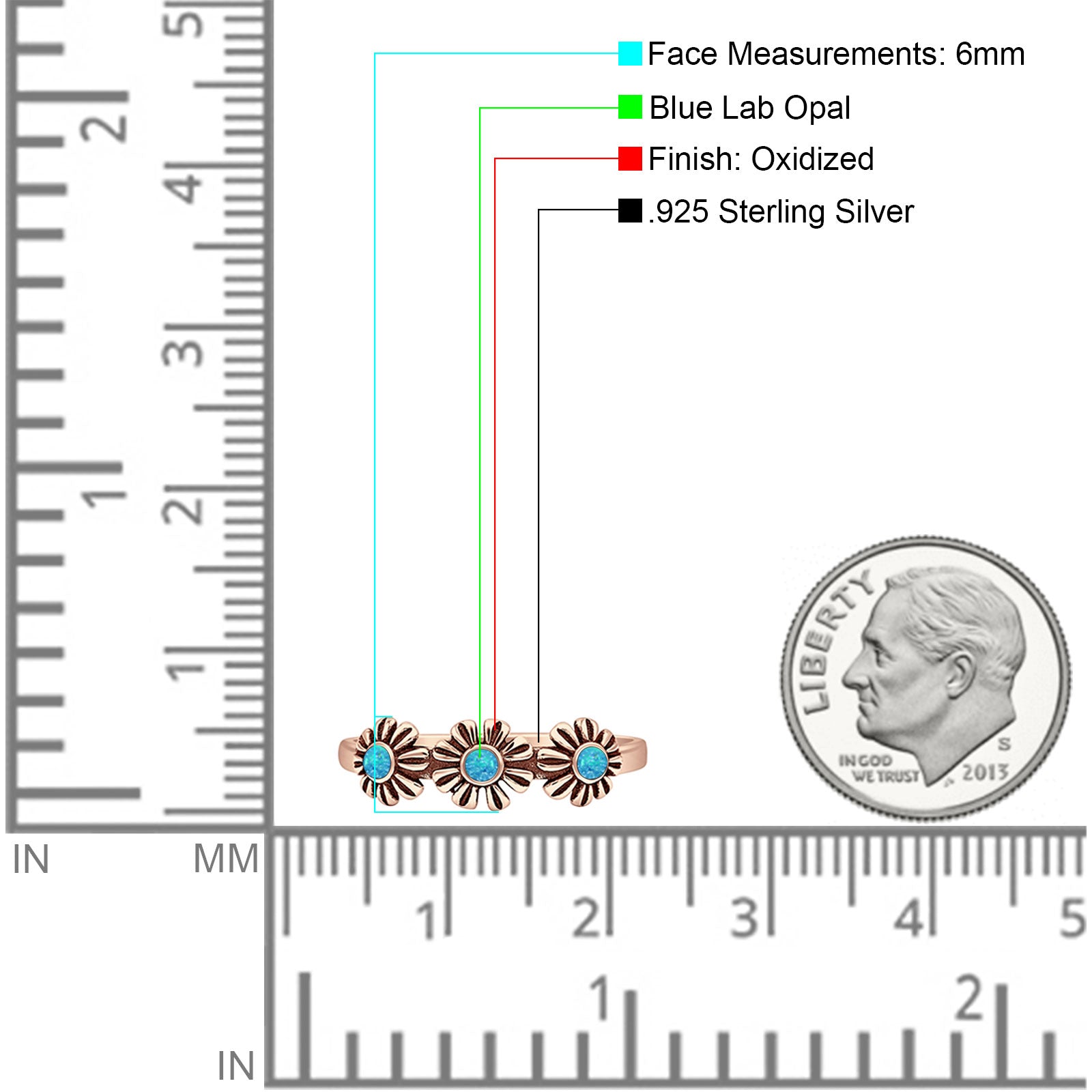 Minimalist 6mm Round Lab Created Blue Opal Flower Ring Oxidized 925 Sterling Silver