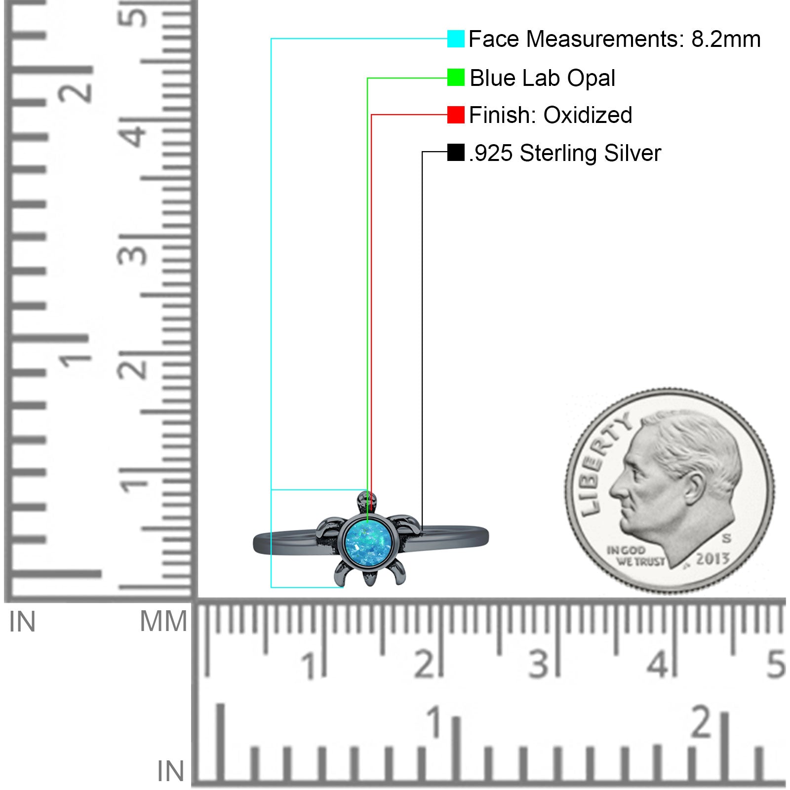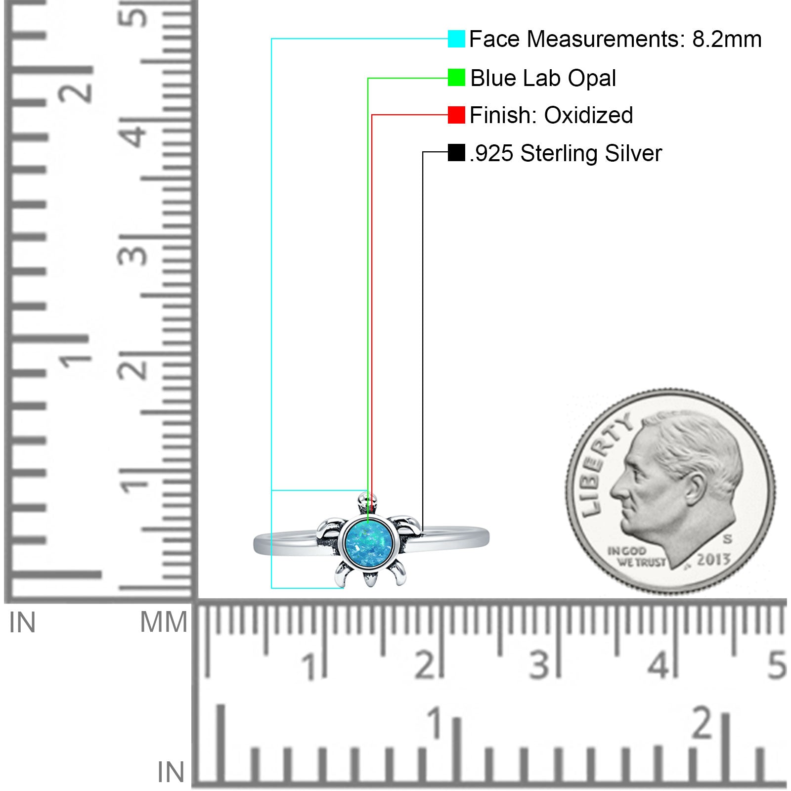 Minimalist 8.2mm Round Lab Created Blue Opal Turtle Ring Oxidized 925 Sterling Silver