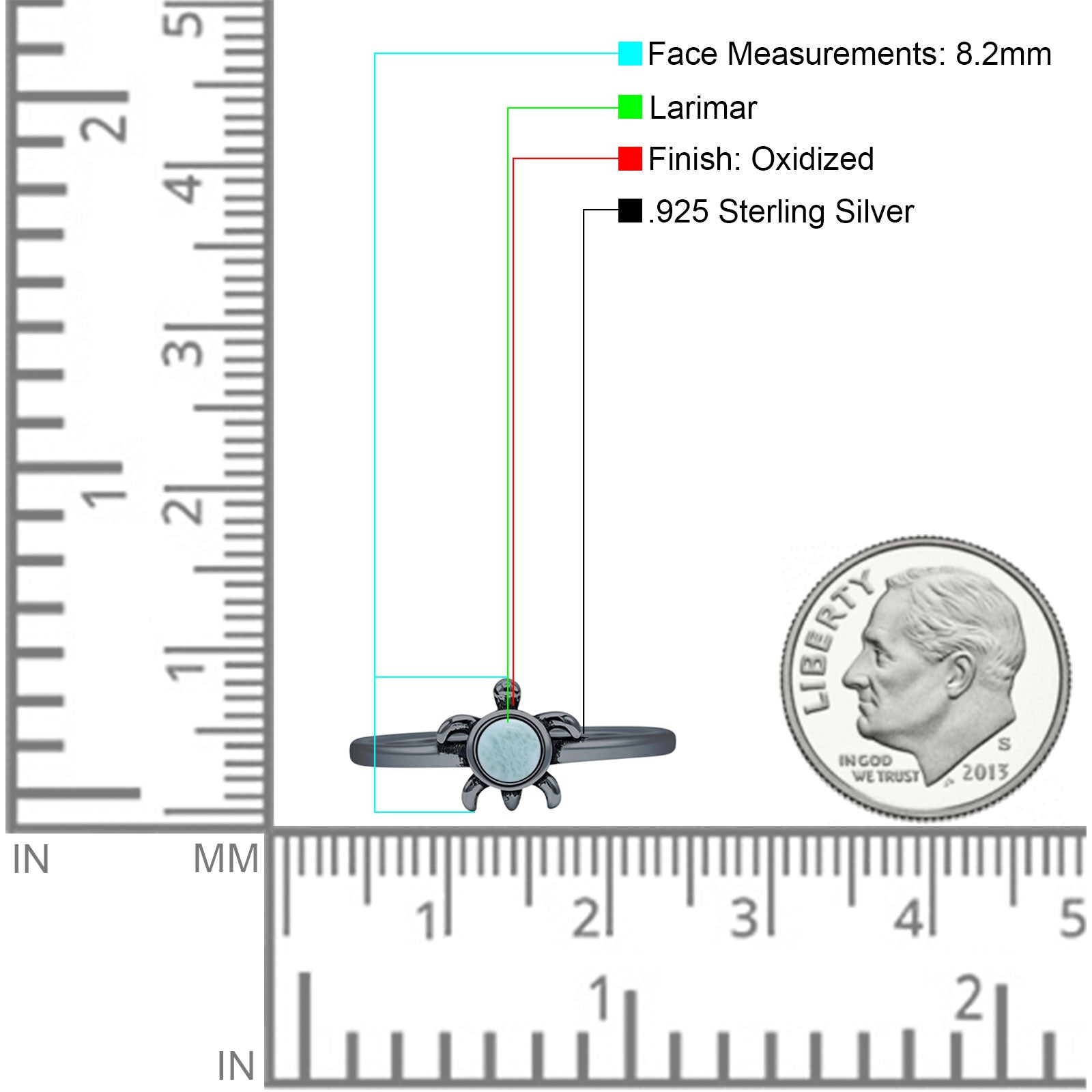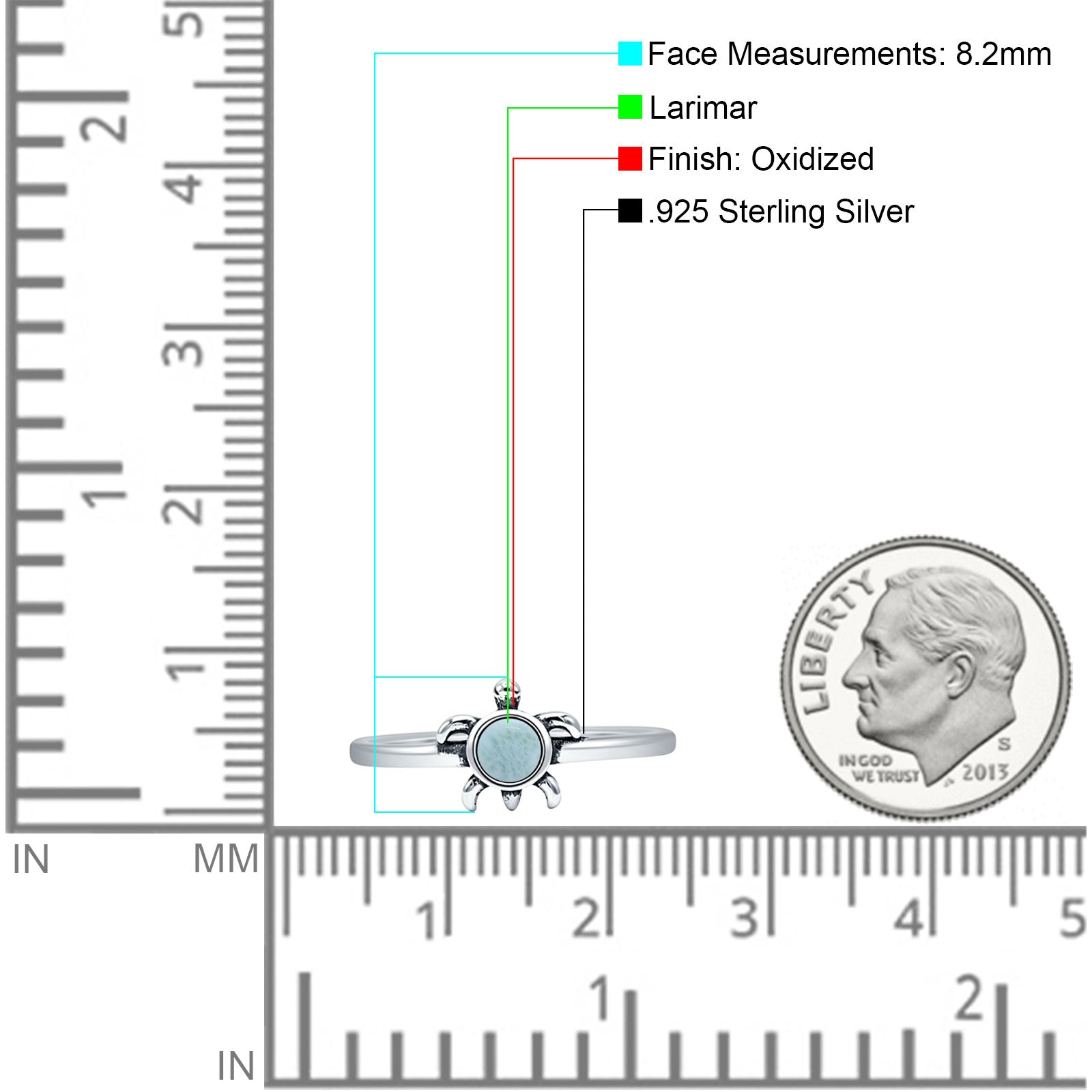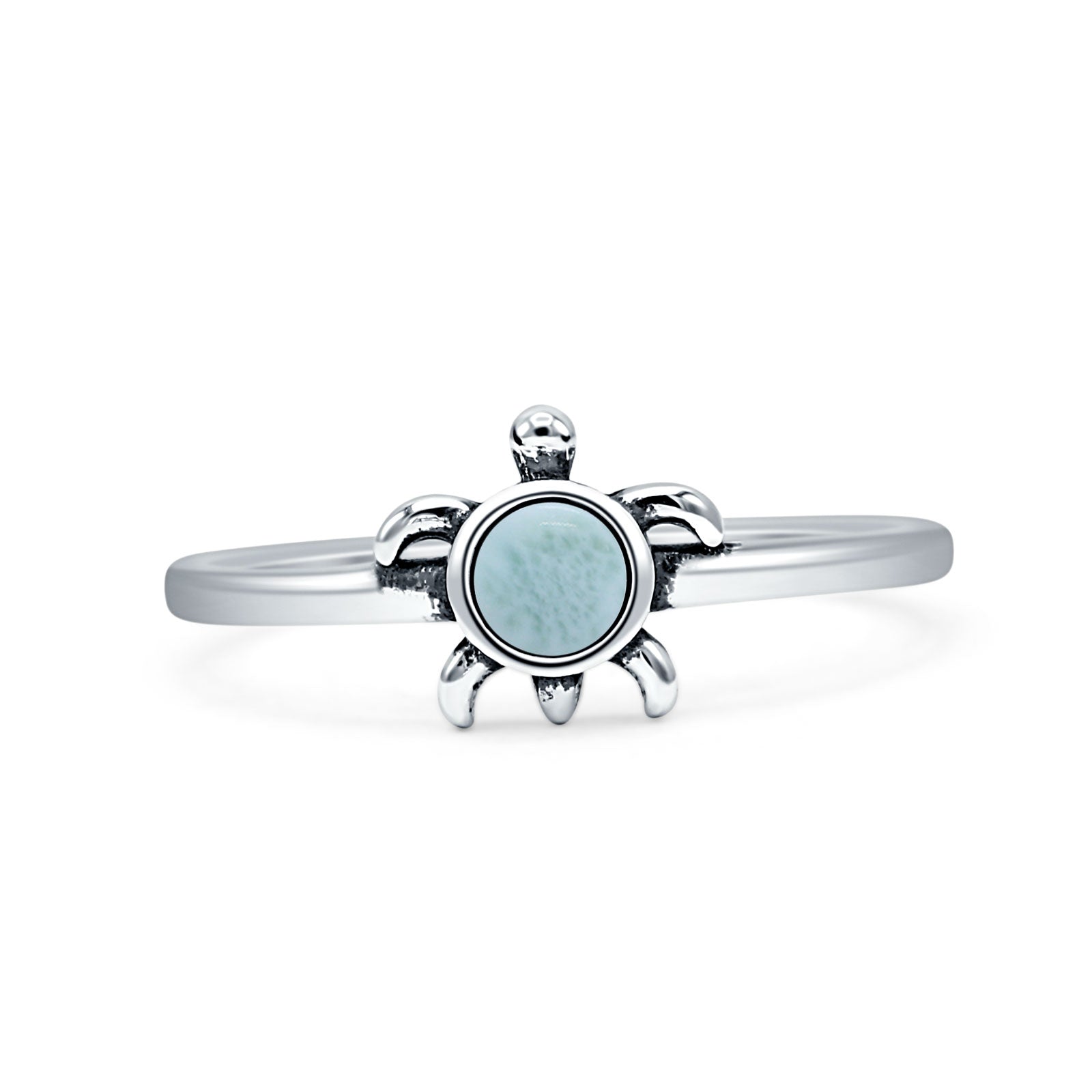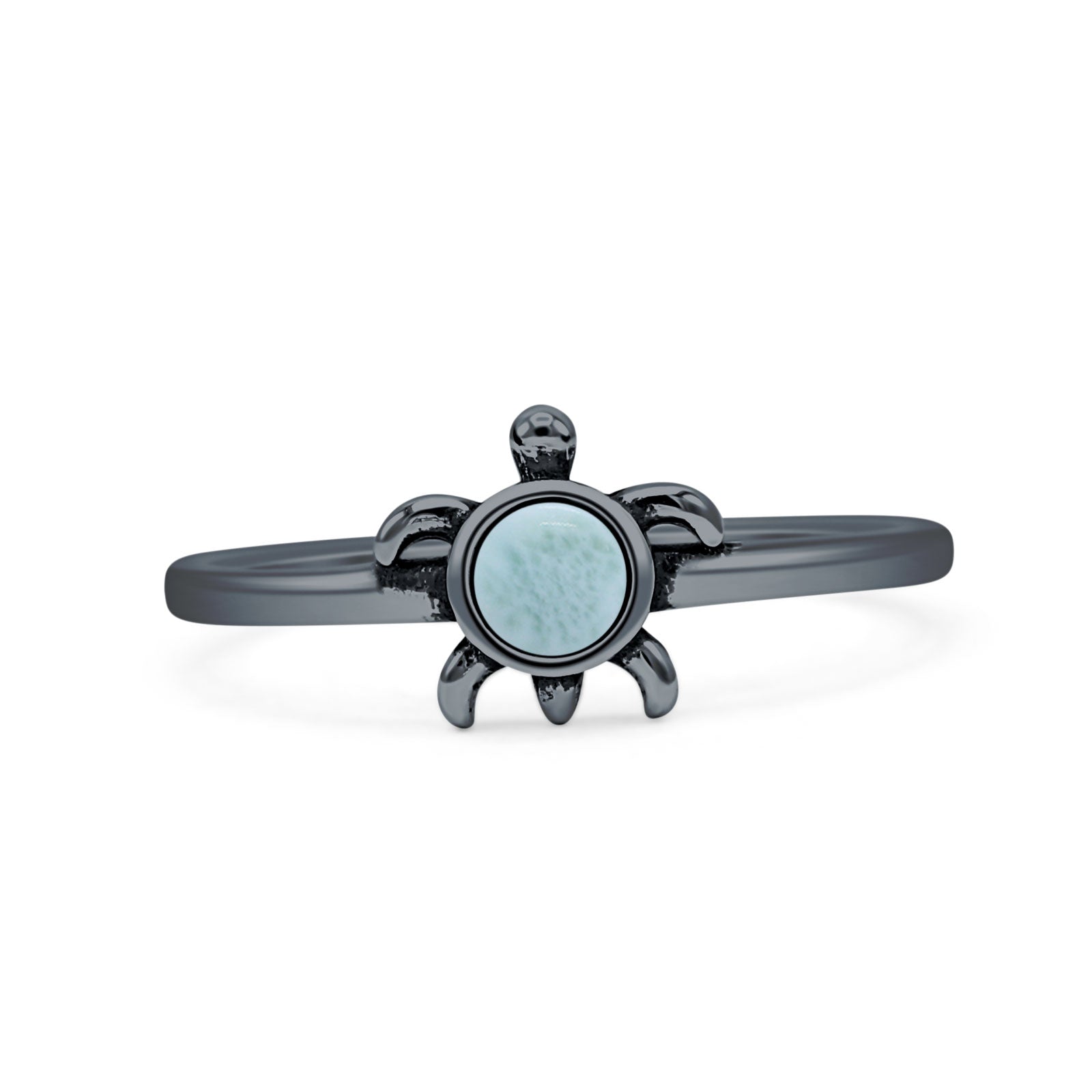 Minimalist 8.2mm Round Larimar Turtle Ring Oxidized 925 Sterling Silver