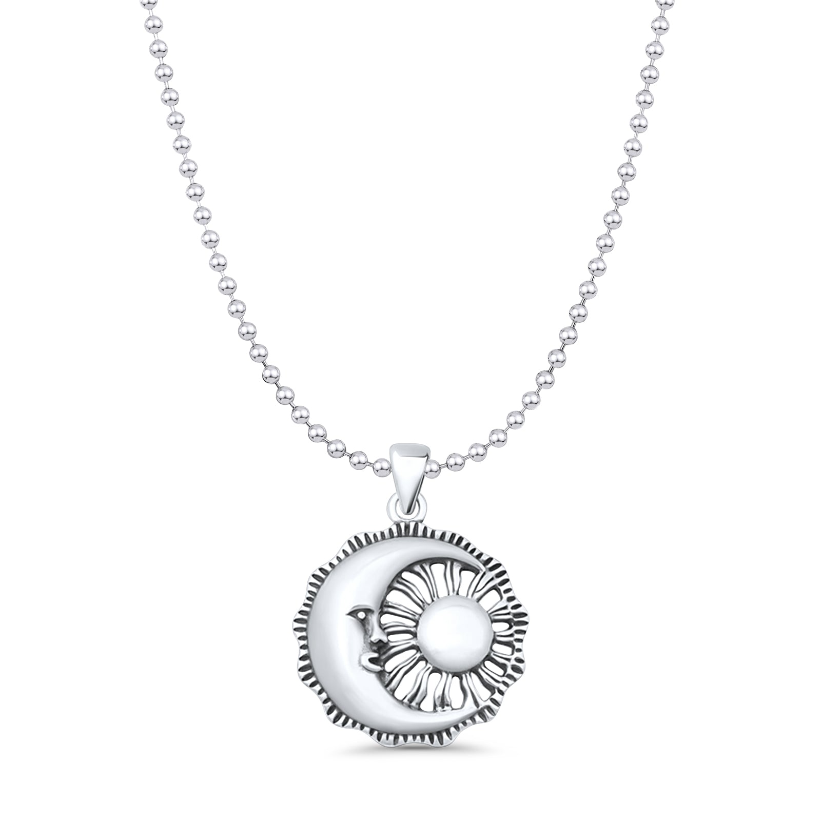 Moon & Sun Pendant Bead Chain Necklace Oxidized 925 Sterling Silver
