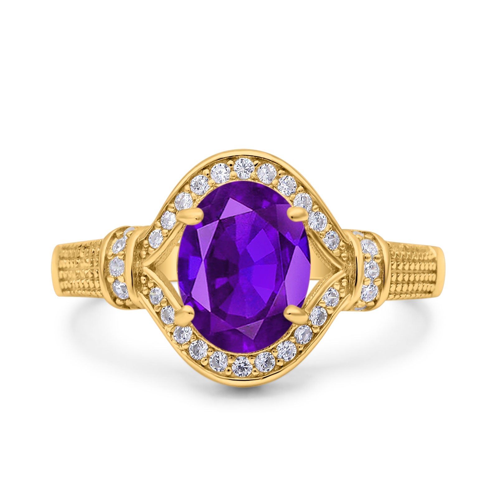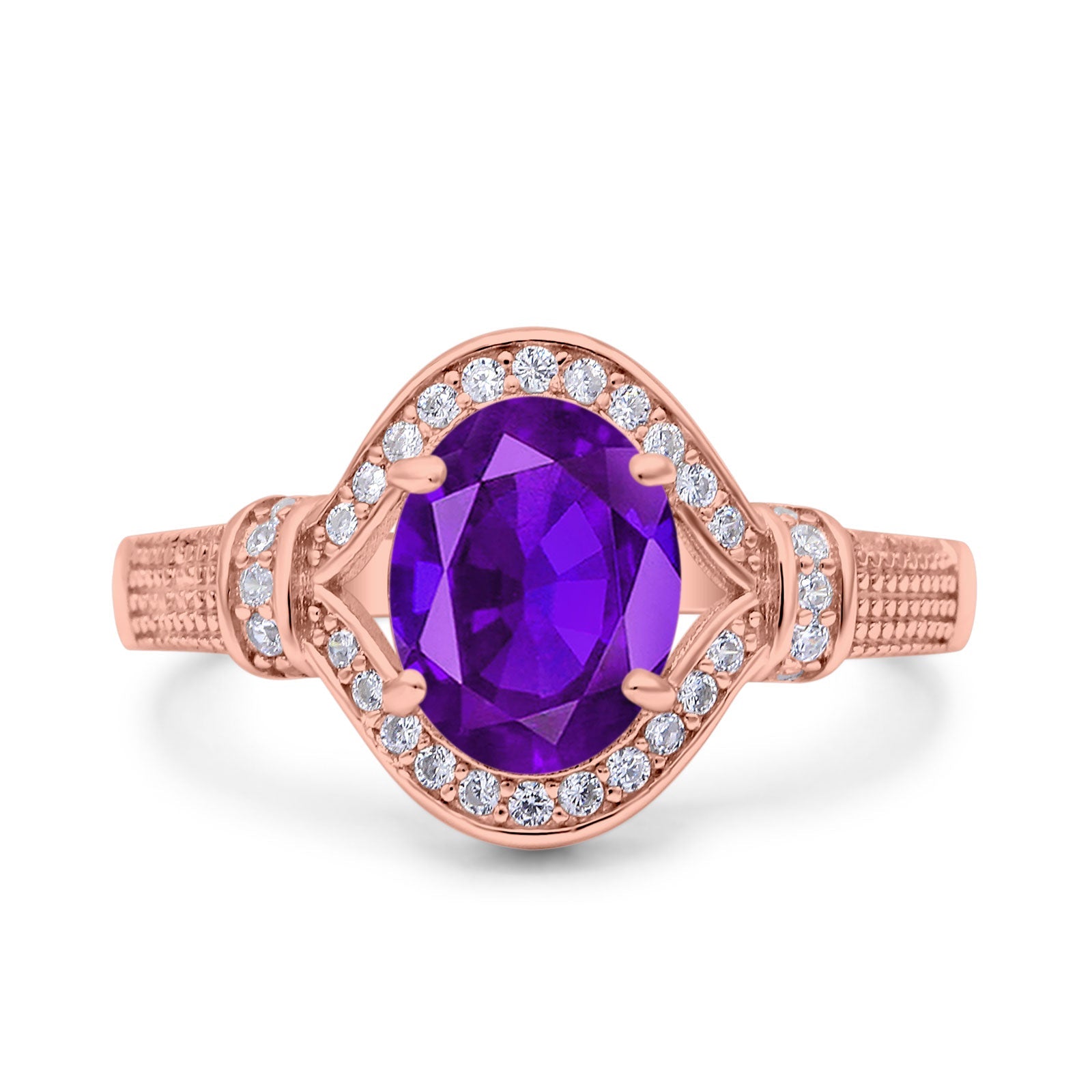 Oval Natural Amethyst Halo Beaded Ring 925 Sterling Silver