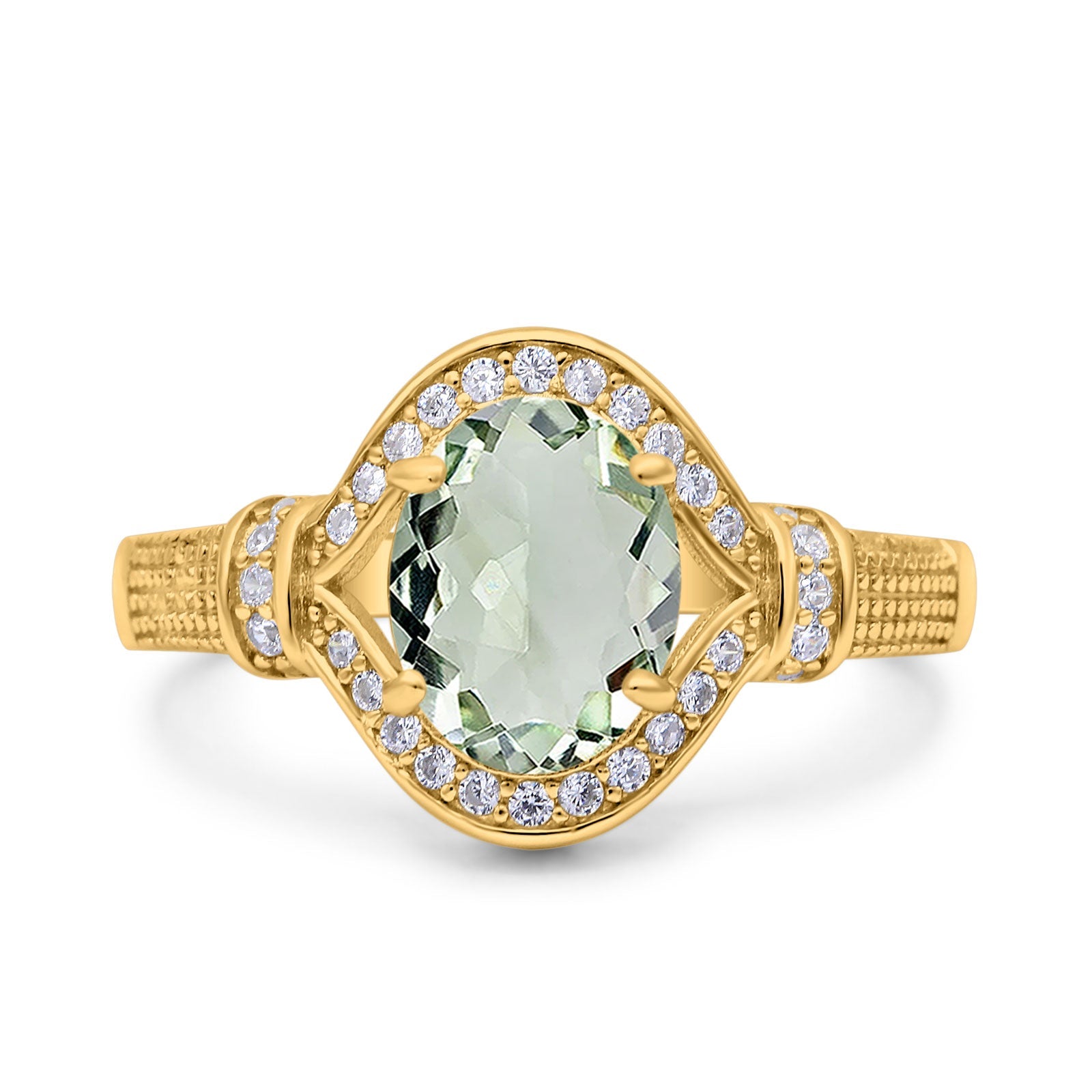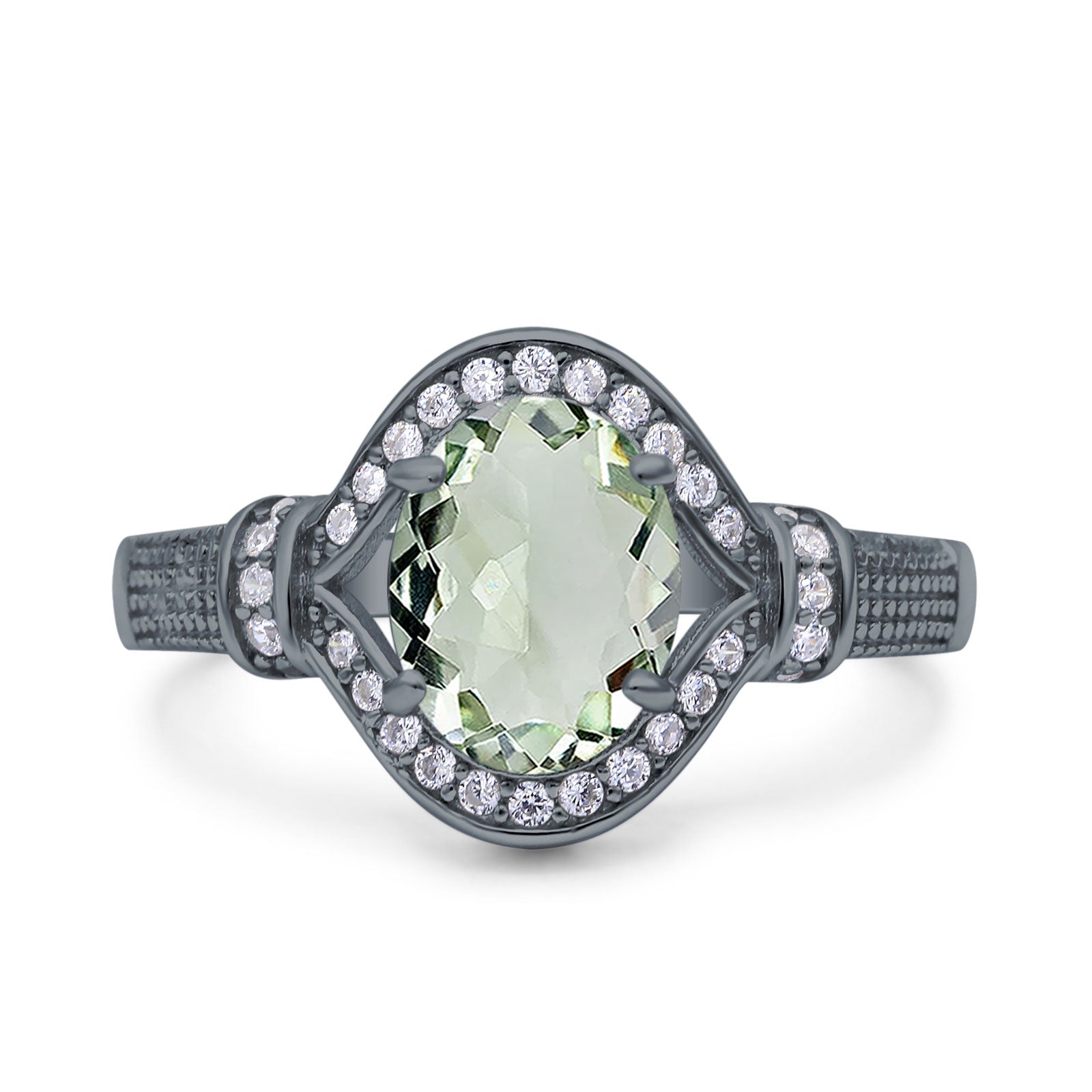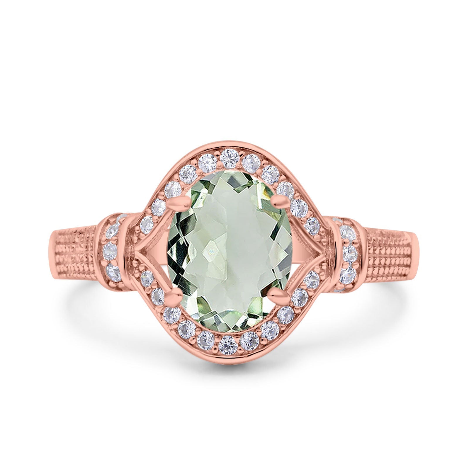 Oval Natural Green Amethyst Prasiolite Halo Beaded Ring 925 Sterling Silver