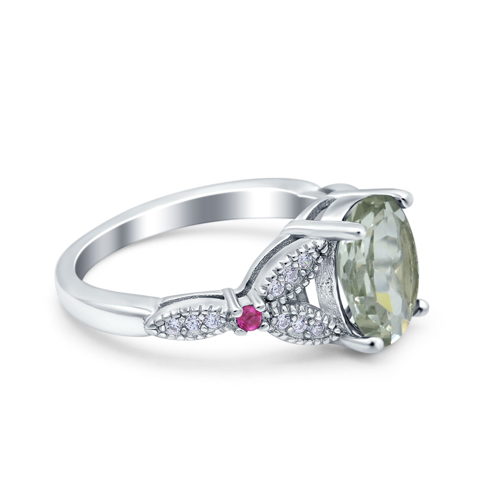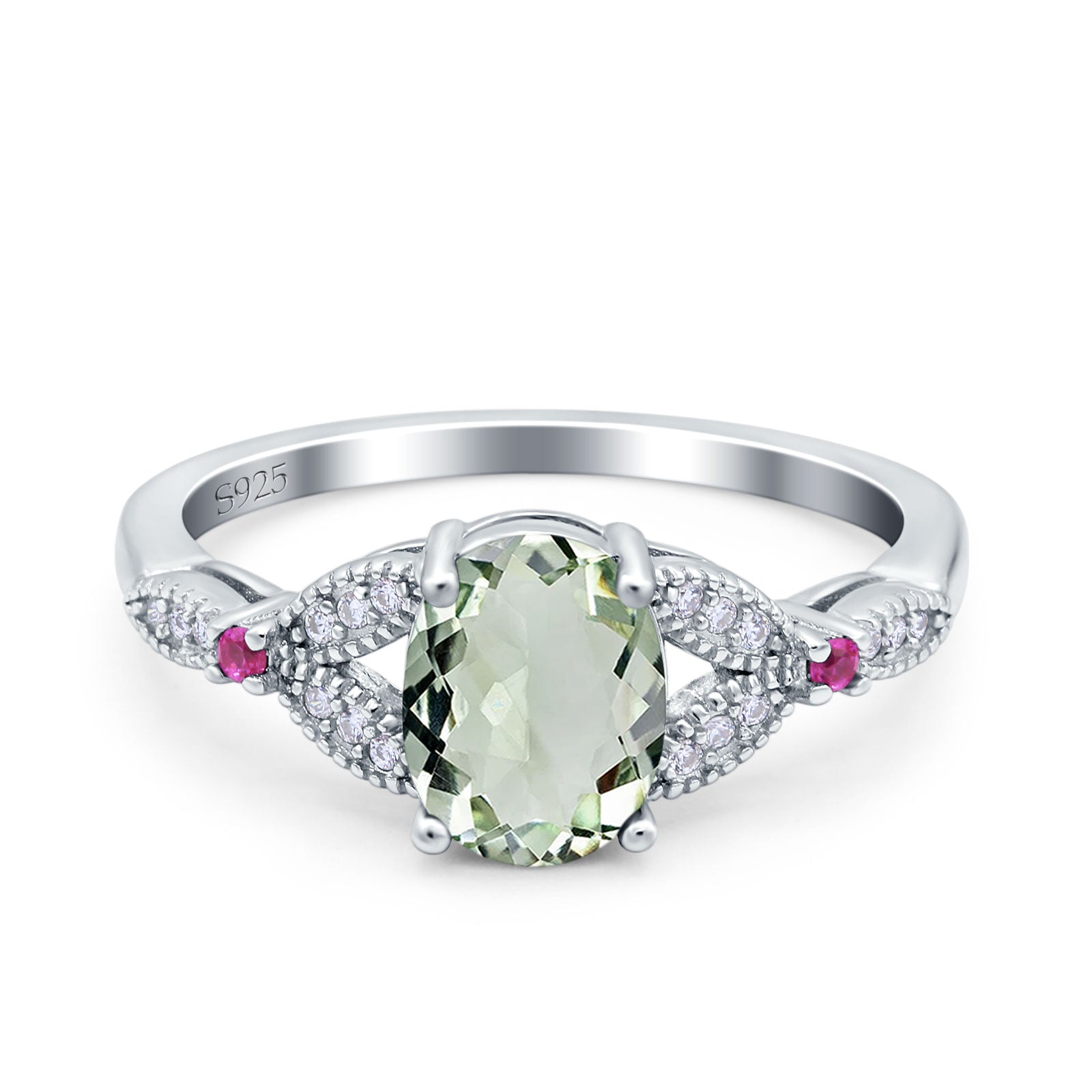 Oval Natural Green Amethyst Prasiolite Leaf Design Beaded Ring 925 Sterling Silver