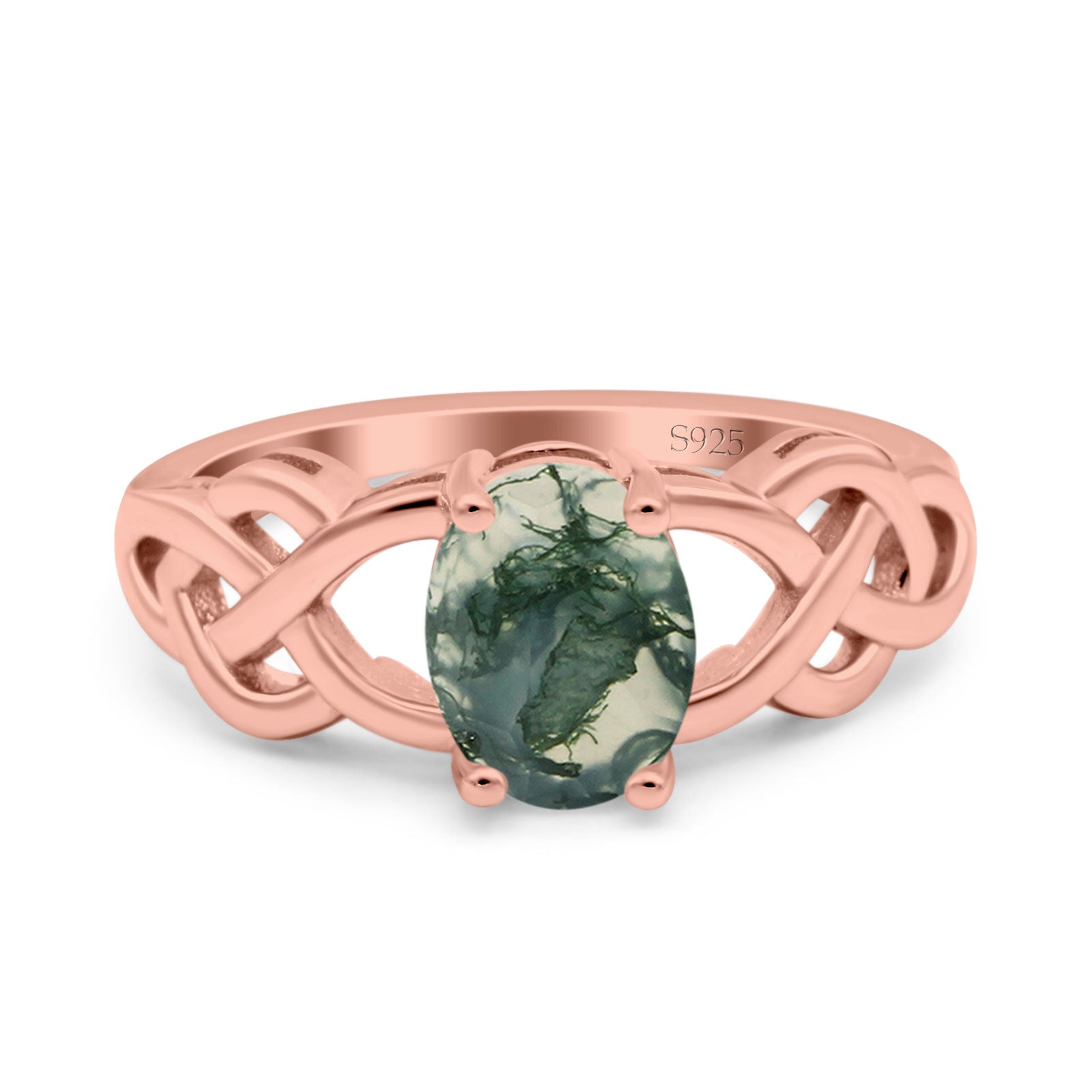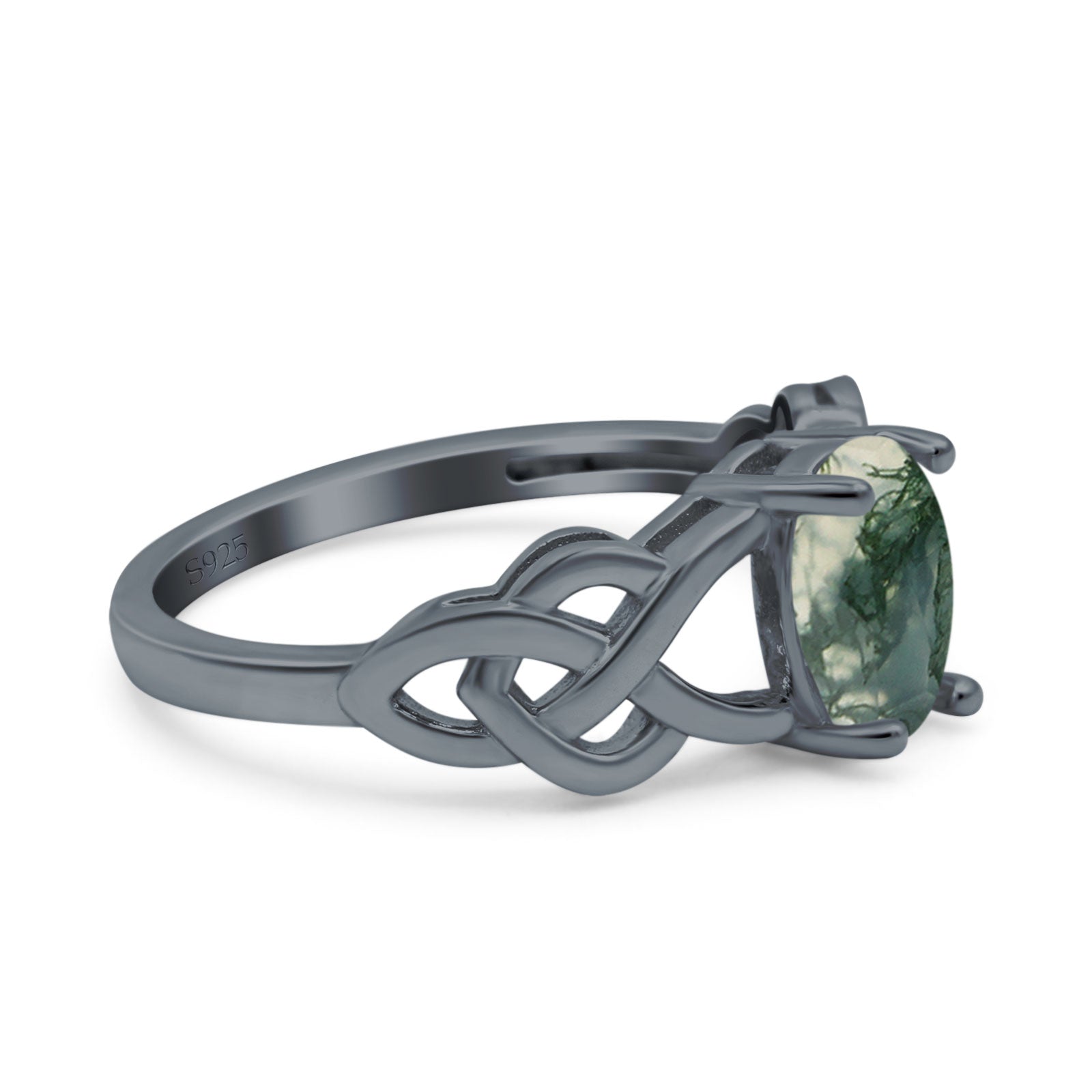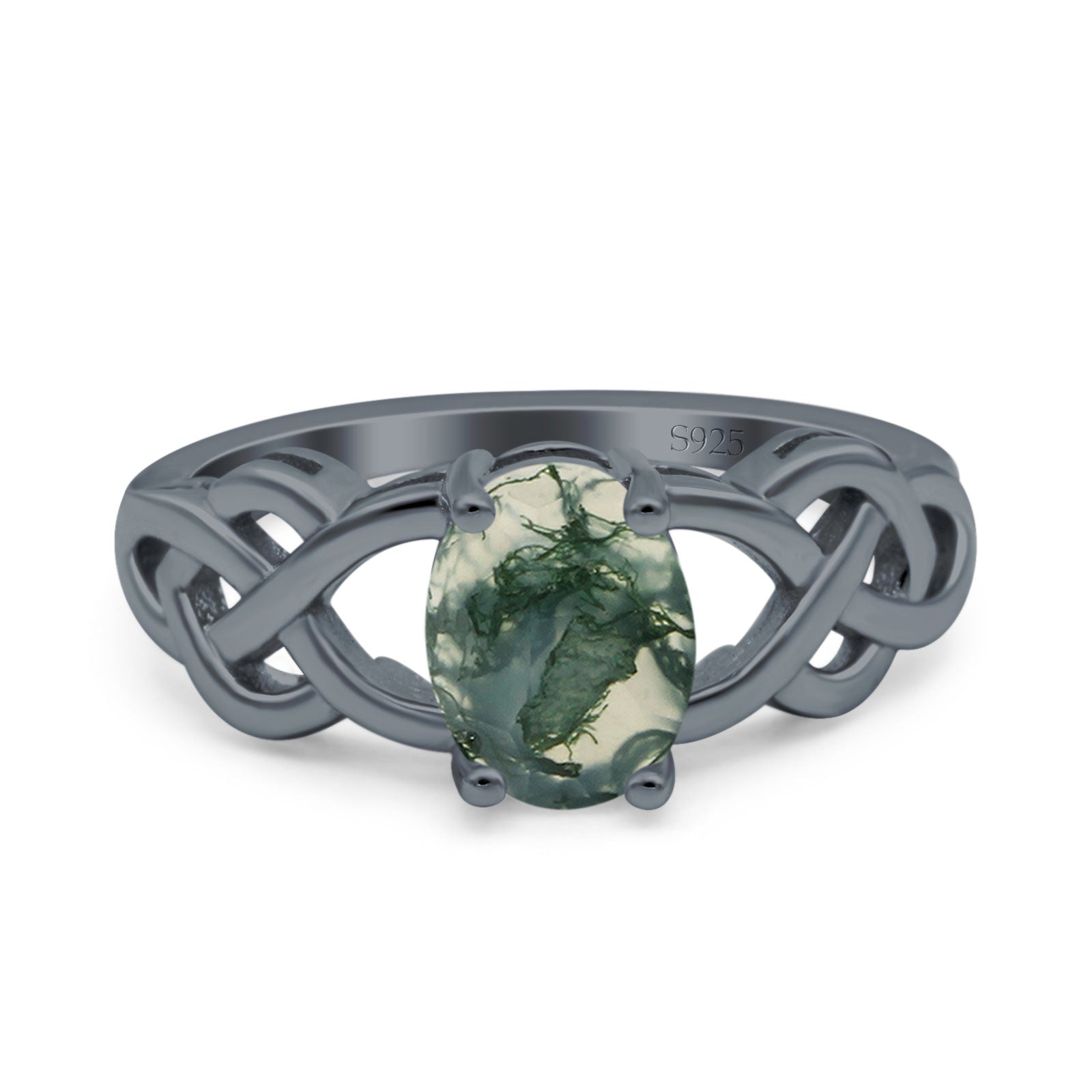 Oval Natural Green Moss Agate Solitaire Trinity Ring 925 Sterling Silver