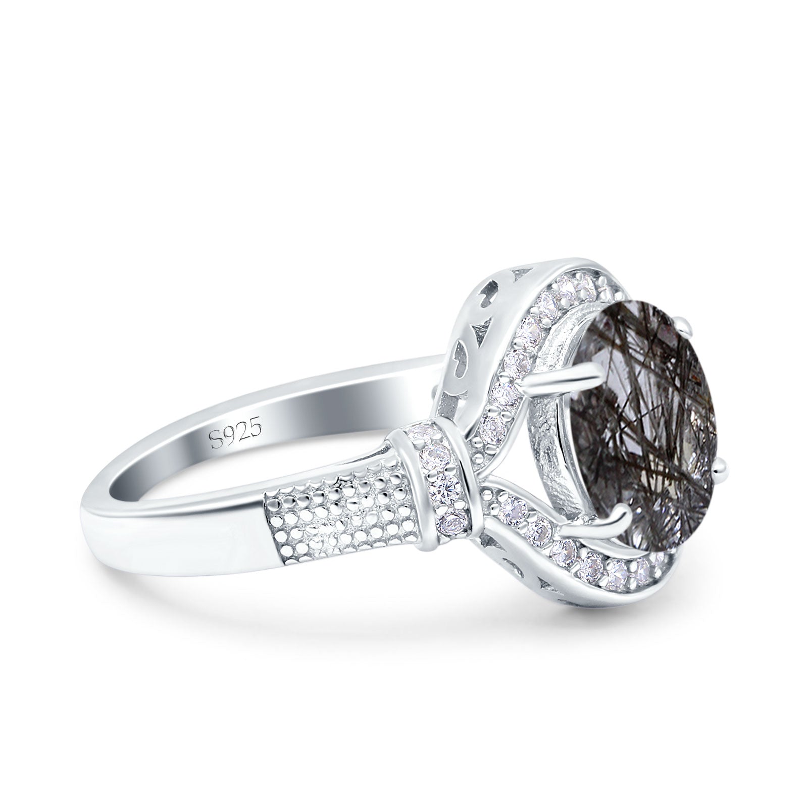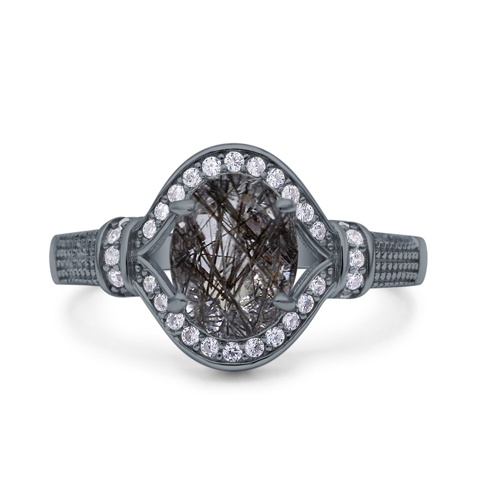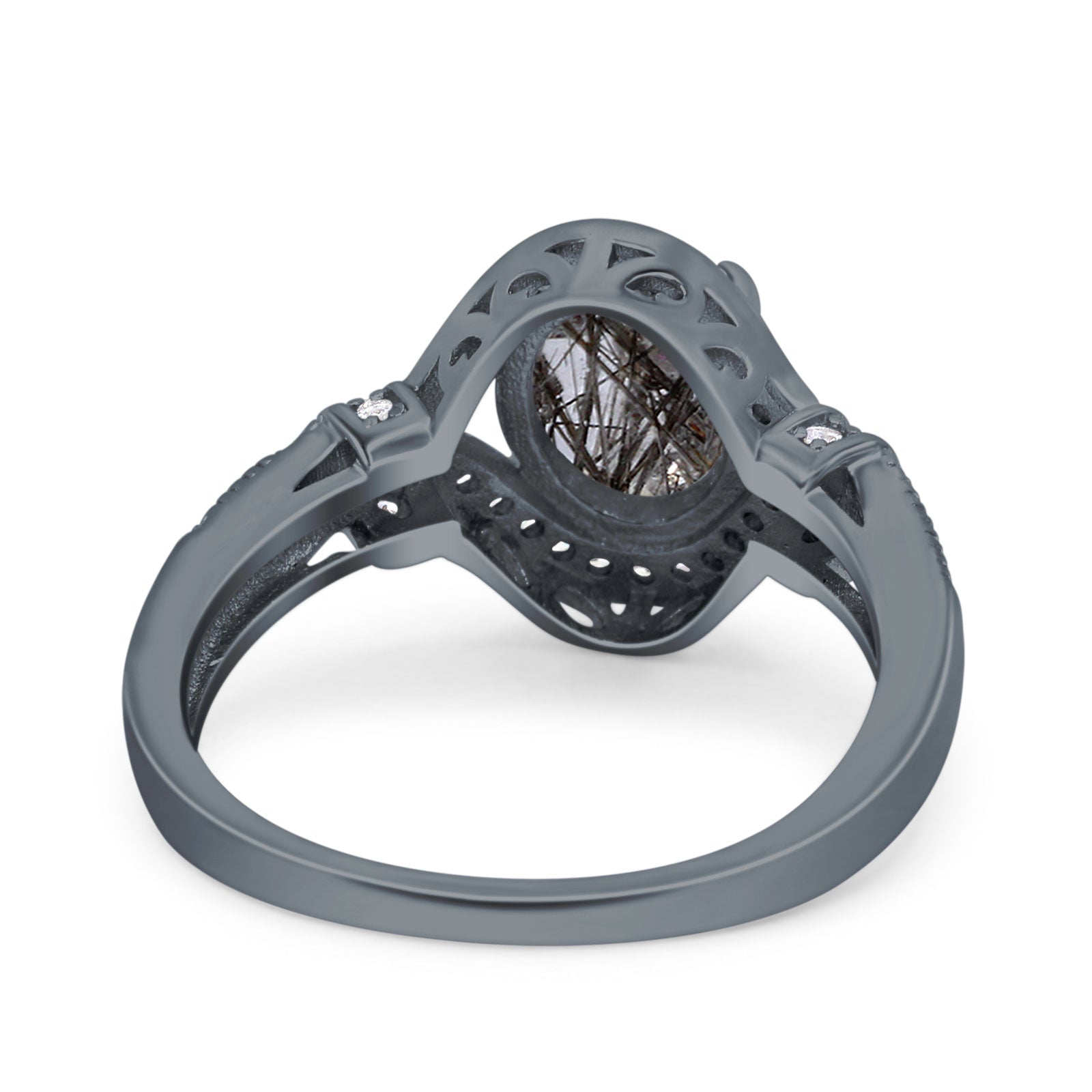 Oval Natural Rutilated Quartz Halo Beaded Ring 925 Sterling Silver