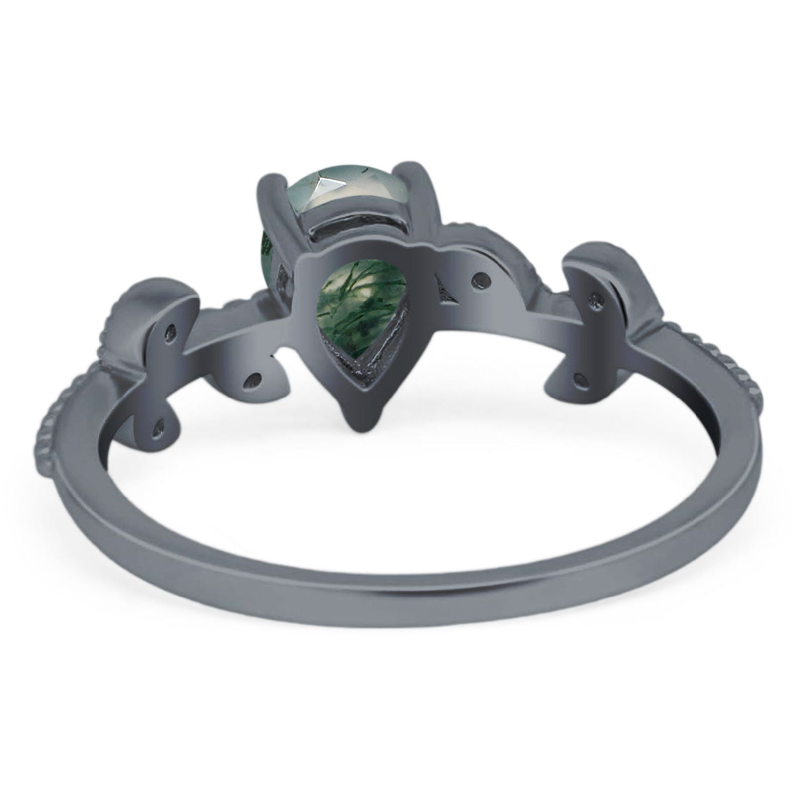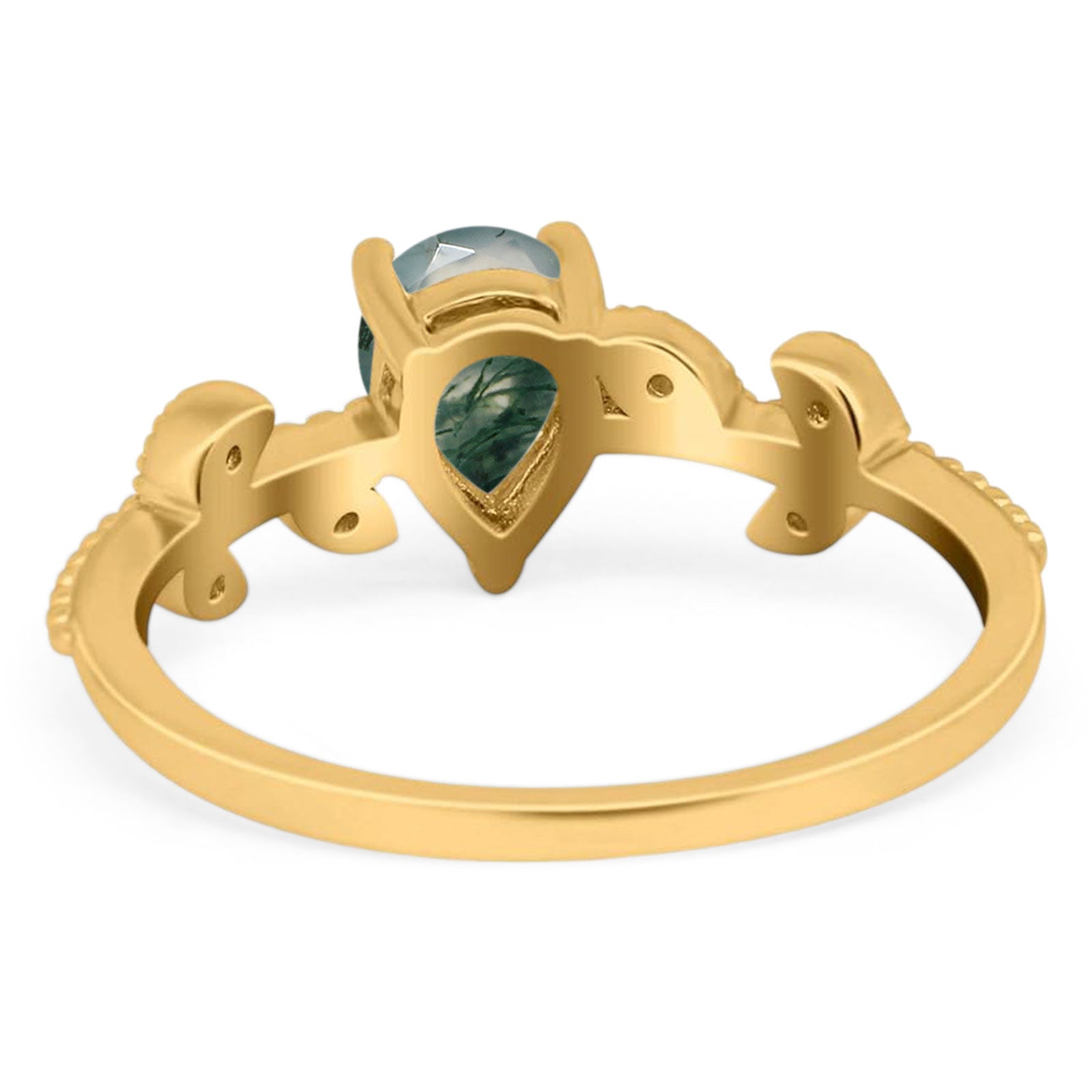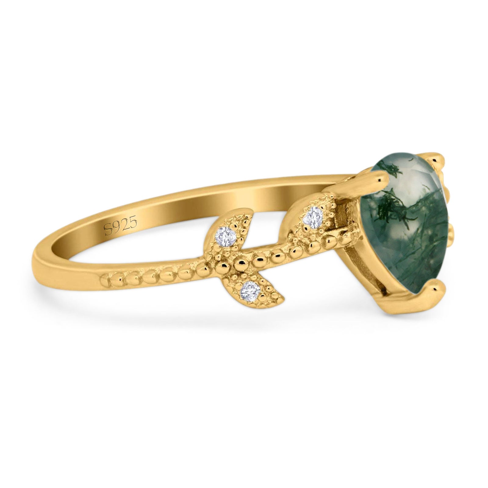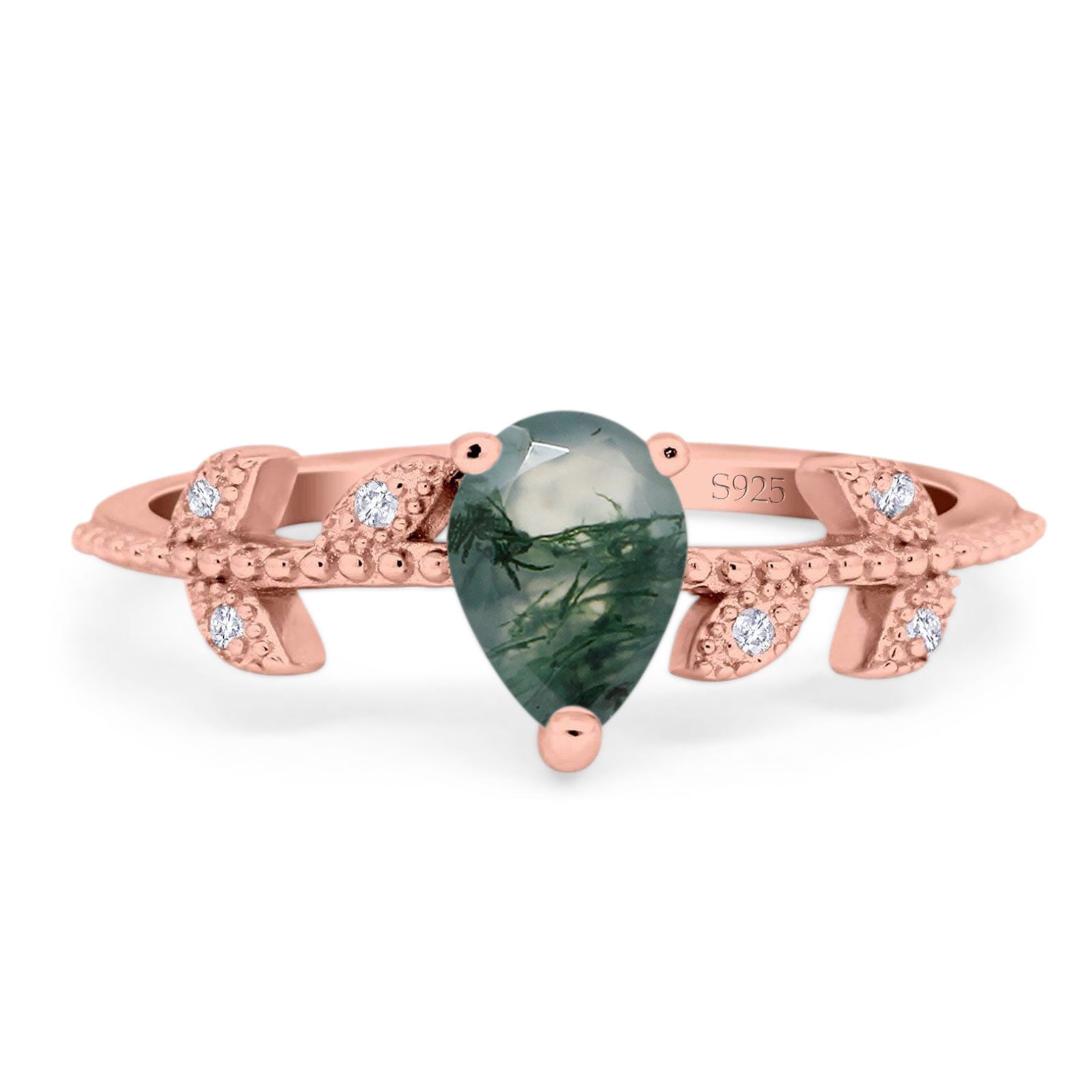 Pear Teardrop Natural Green Moss Agate Beaded Leaf CZ Ring 925 Sterling Silver