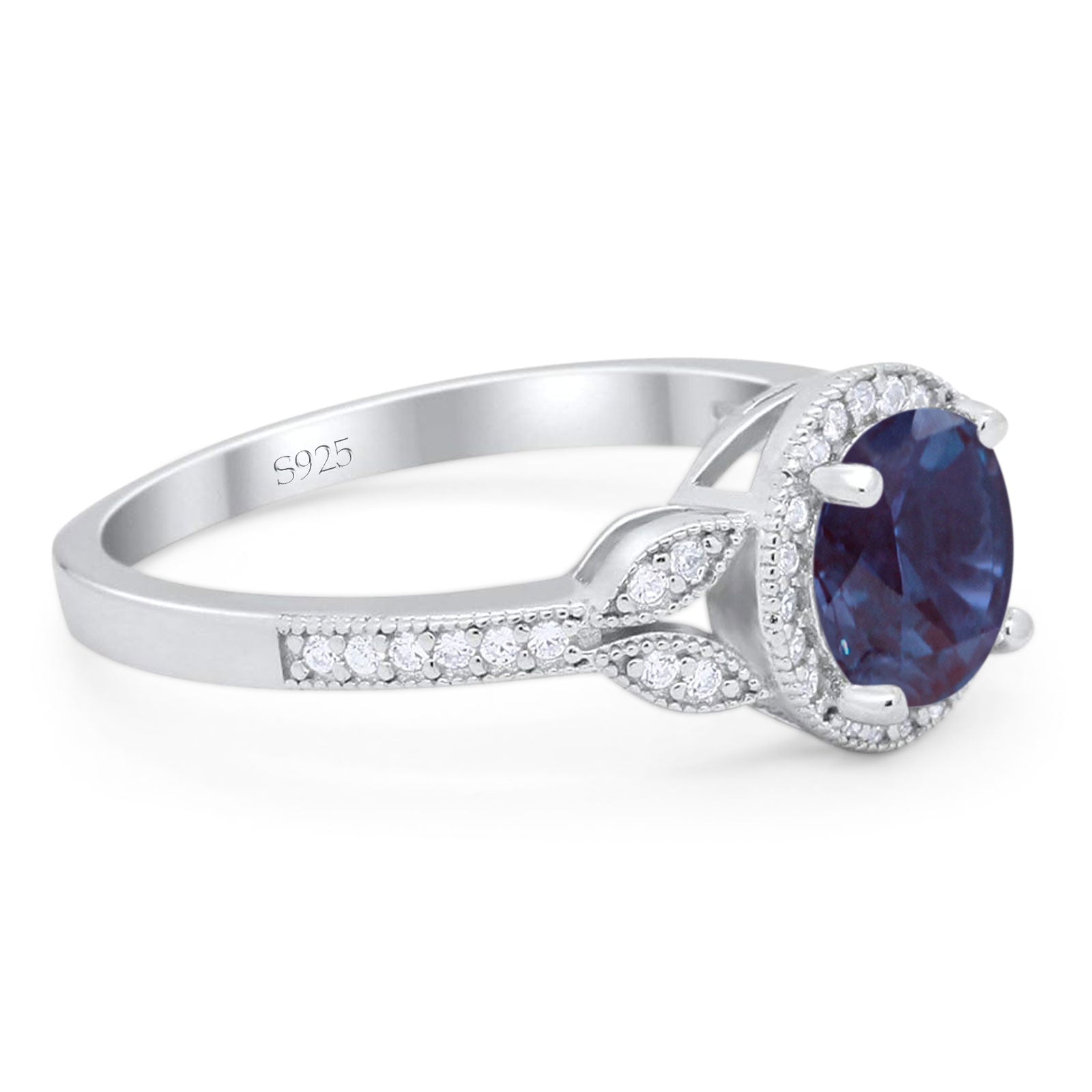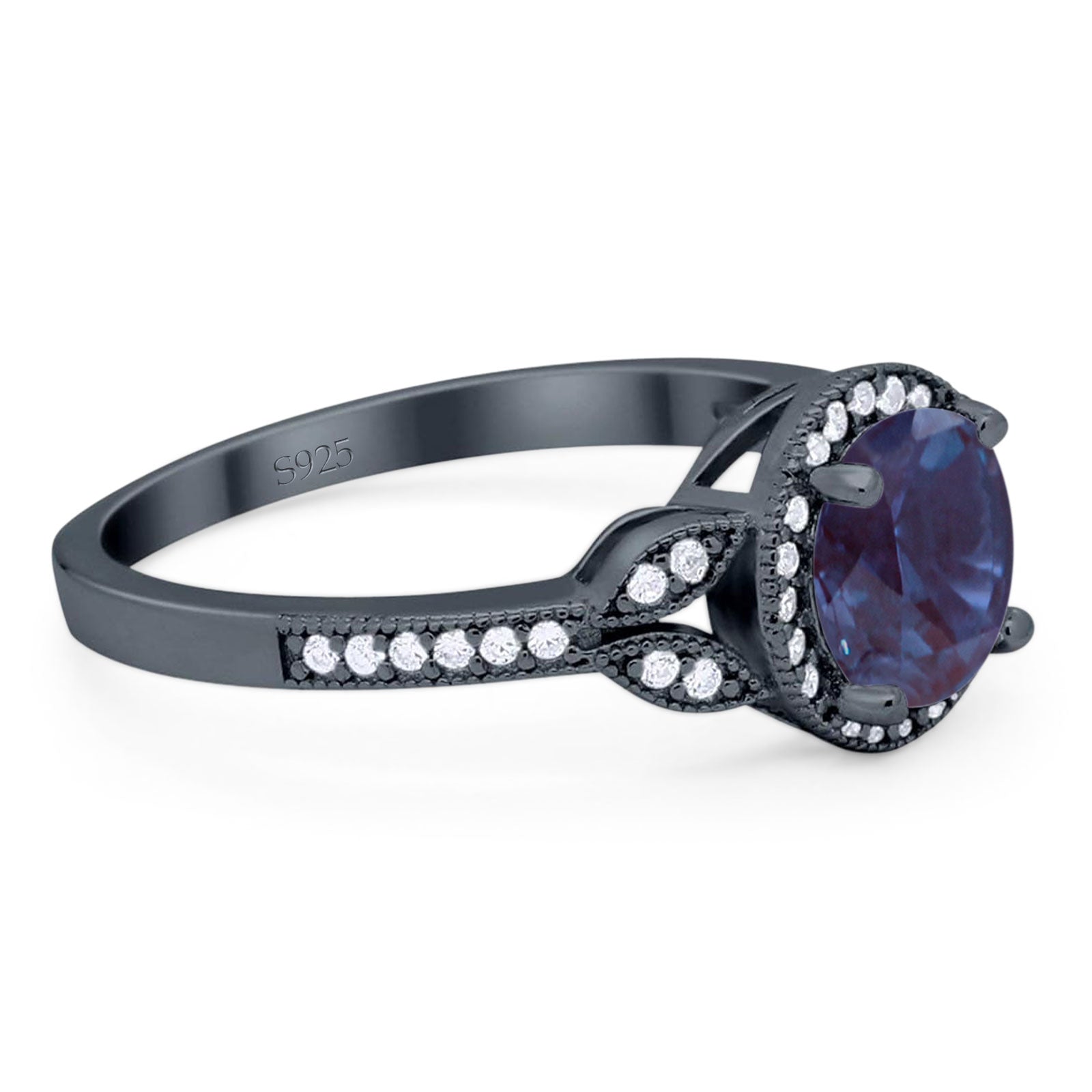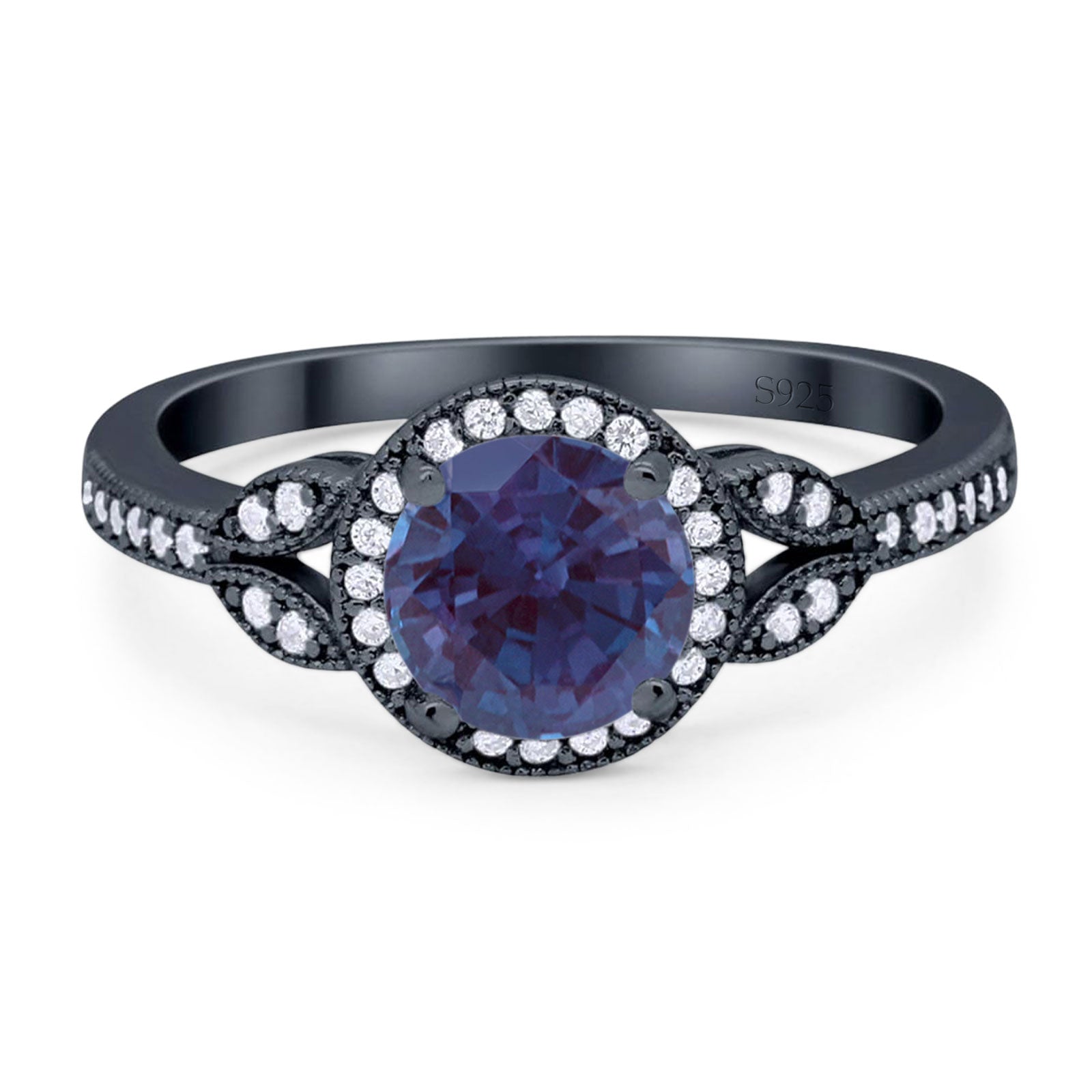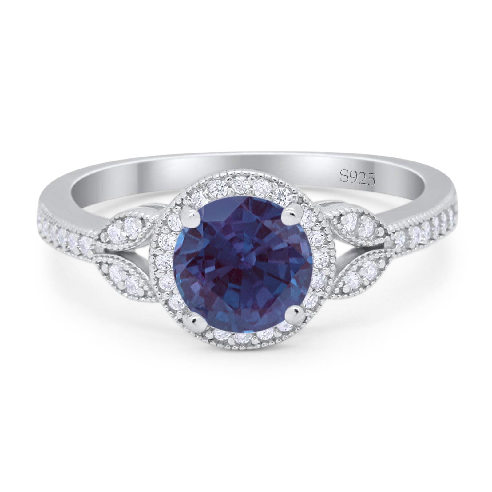 Round Lab Alexandrite Leaf Accent Beaded Ring 925 Sterling Silver
