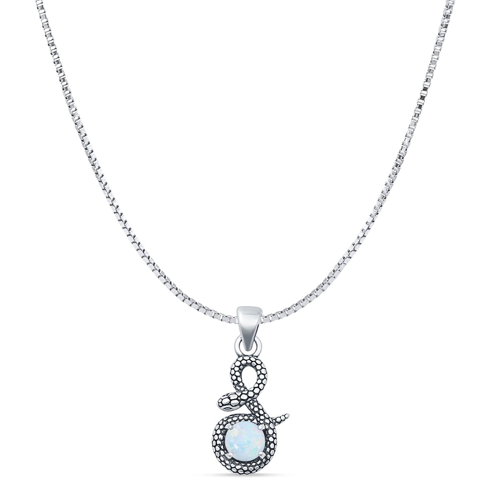 Round Lab Created White Opal Snake Pendant Box Chain Necklace Oxidized 925 Sterling Silver