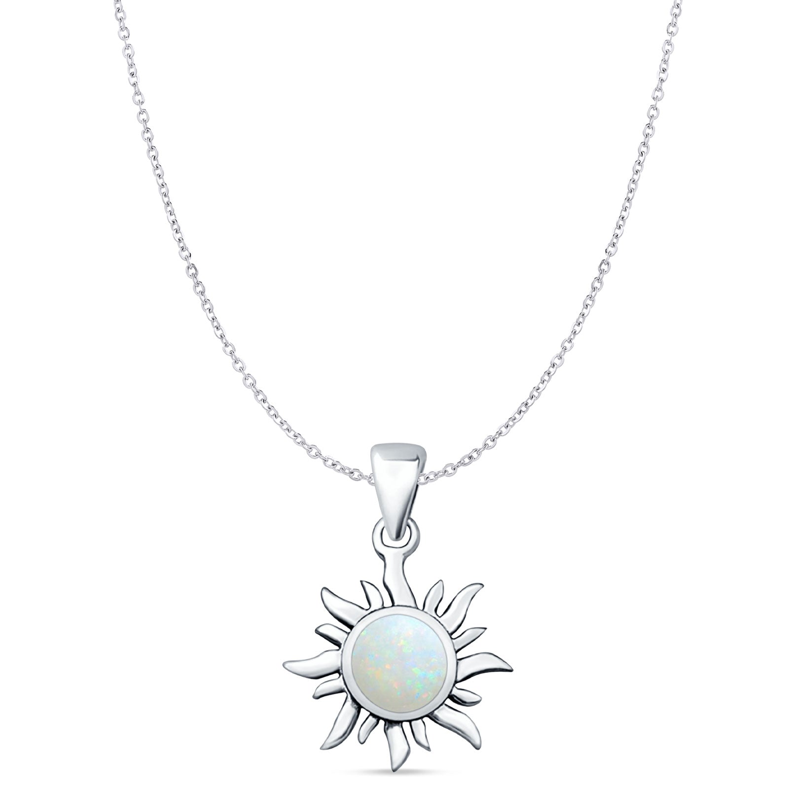 Style: Oxidized Round Lab Created White Opal Sun Pendant Necklace