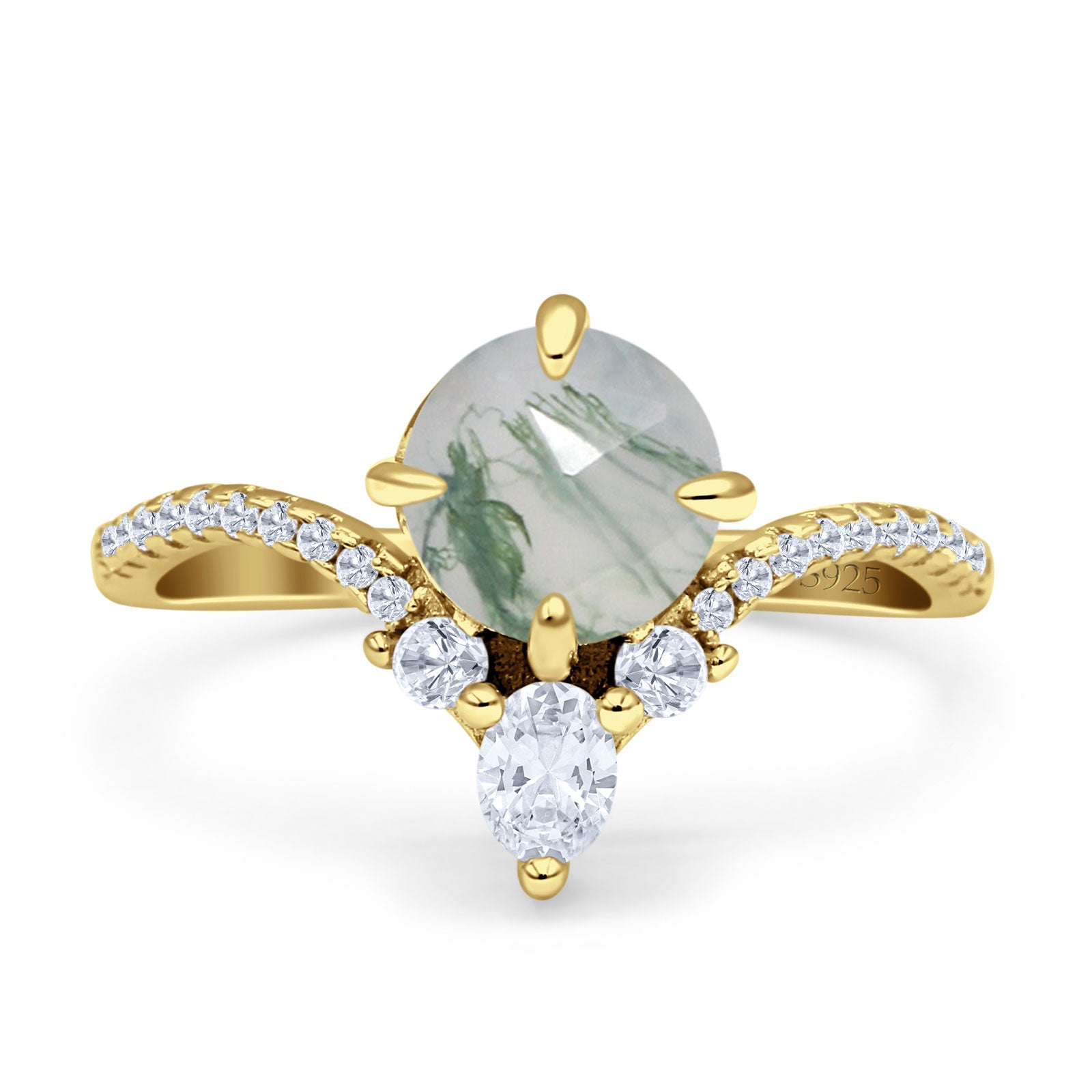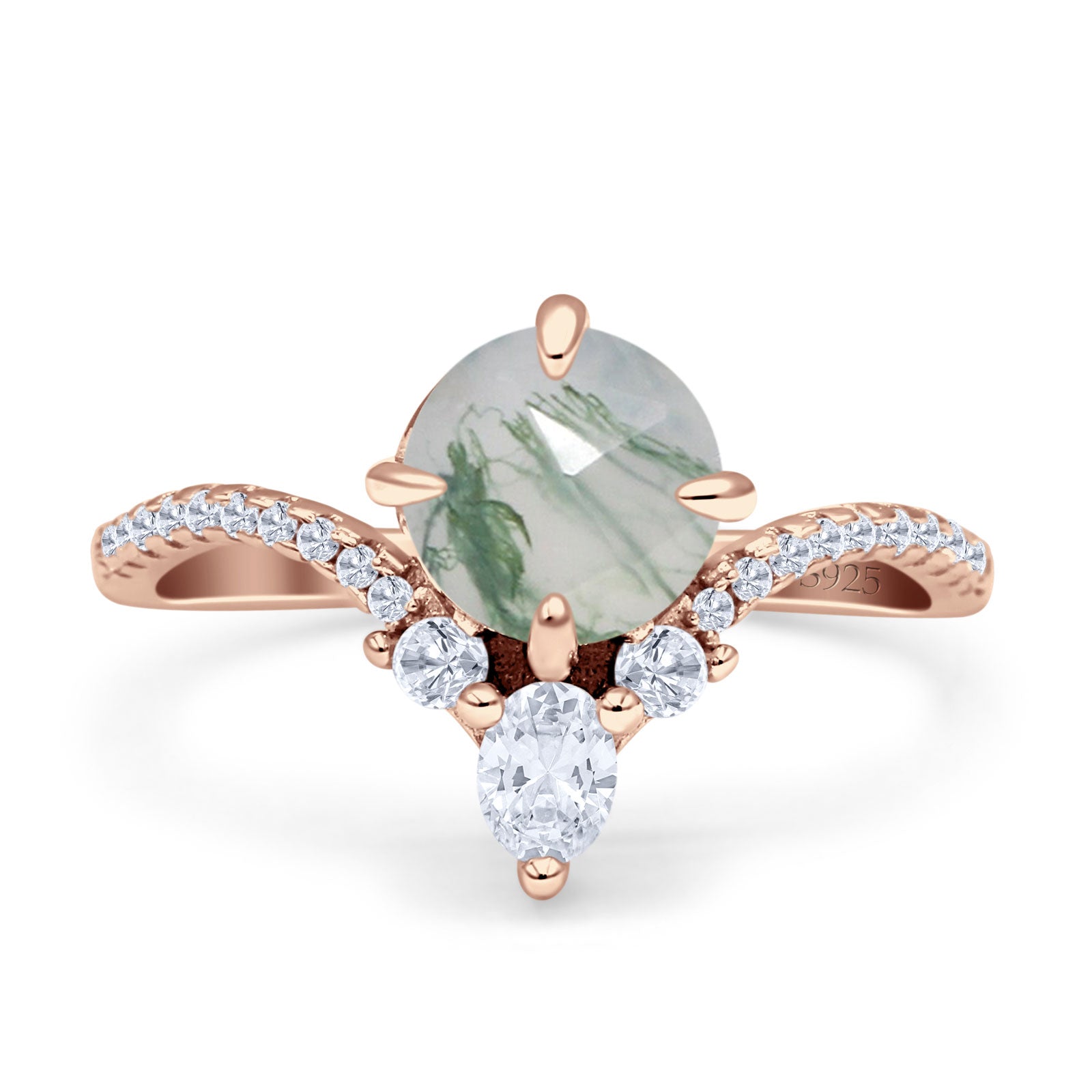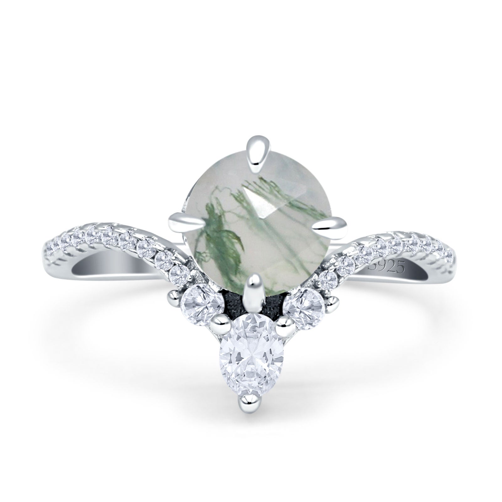 Round Natural Green Moss Agate V Midi Chevron Ring 925 Sterling Silver